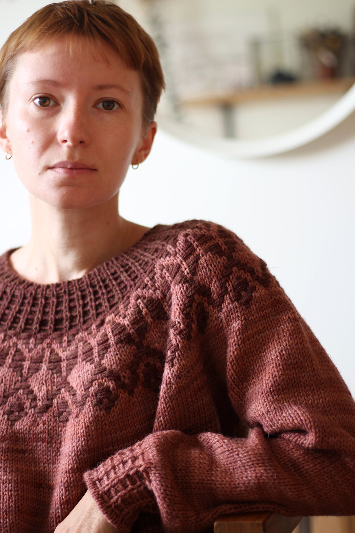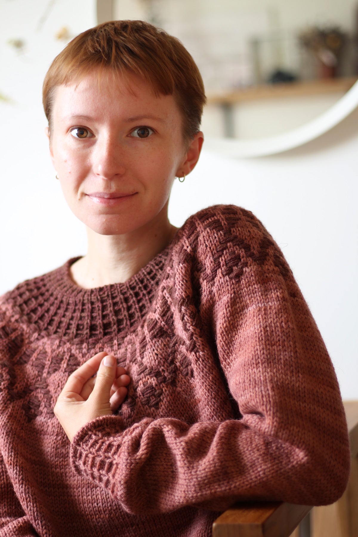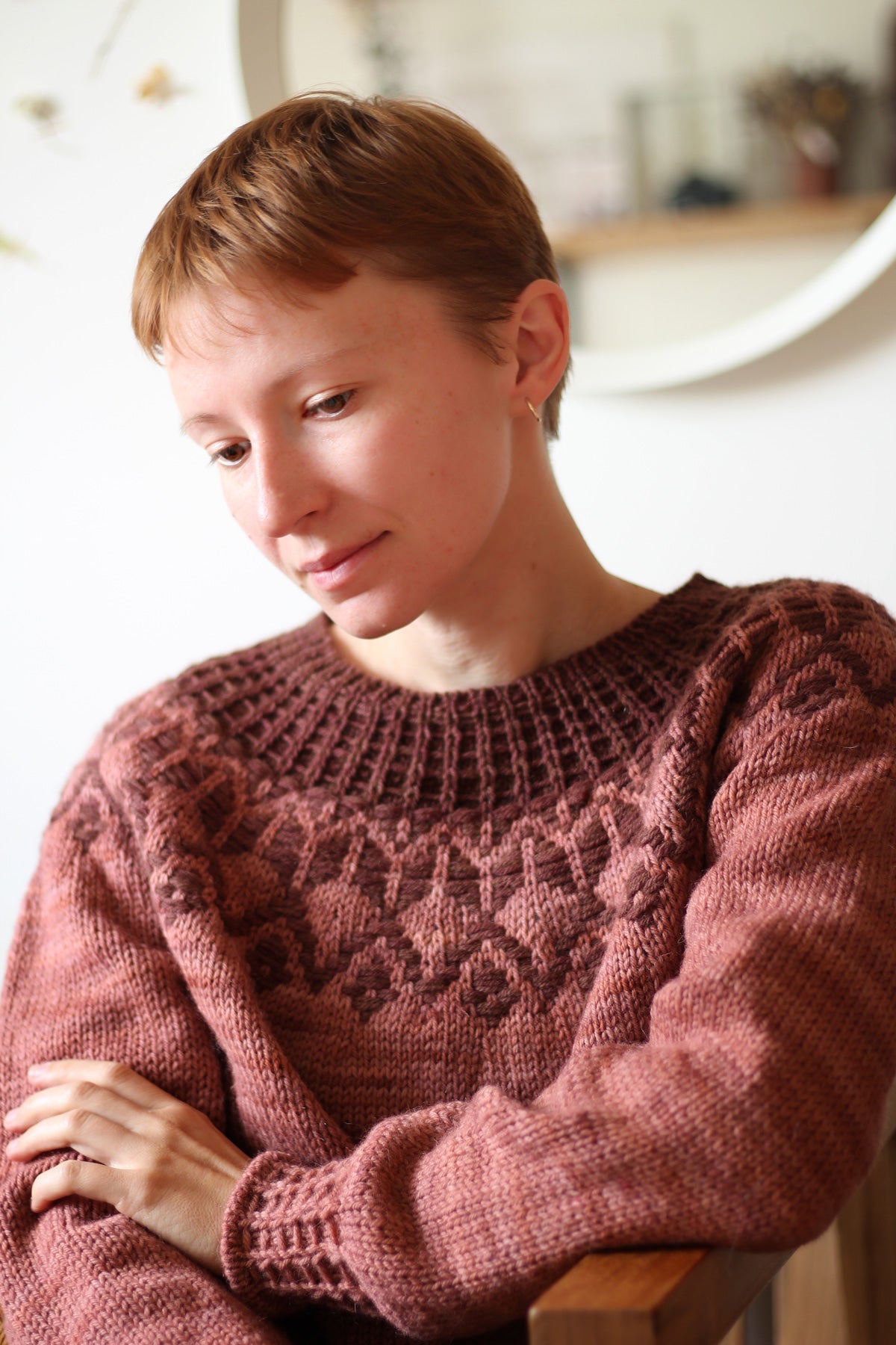 The pullover is knit top-down in the round with a textured top of the yoke and cuffs and simple inlay colourwork pattern around the yoke. Both, the bottom of the body and cuffs, are finished with folded hem edges. It is a quick and easy knit suitable even for adventurous beginners.