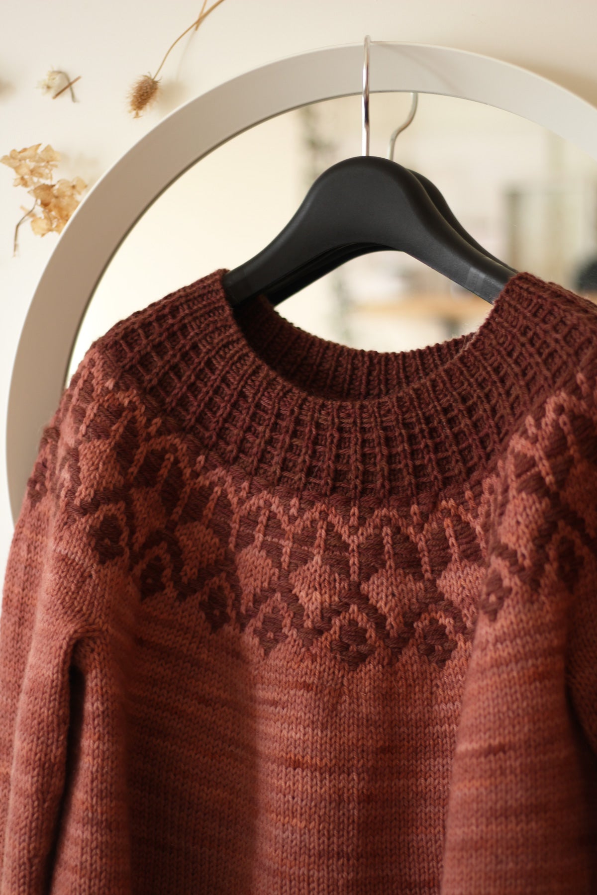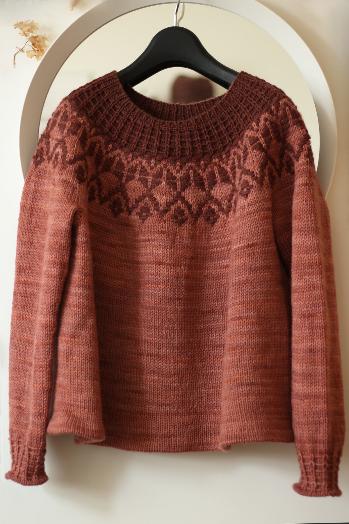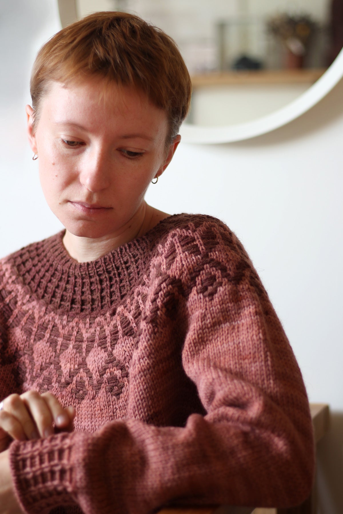 The pullover is knit top-down in the round with a textured top of the yoke and cuffs and simple inlay colourwork pattern around the yoke. Both, the bottom of the body and cuffs, are finished with folded hem edges. It is a quick and easy knit suitable even for adventurous beginners.