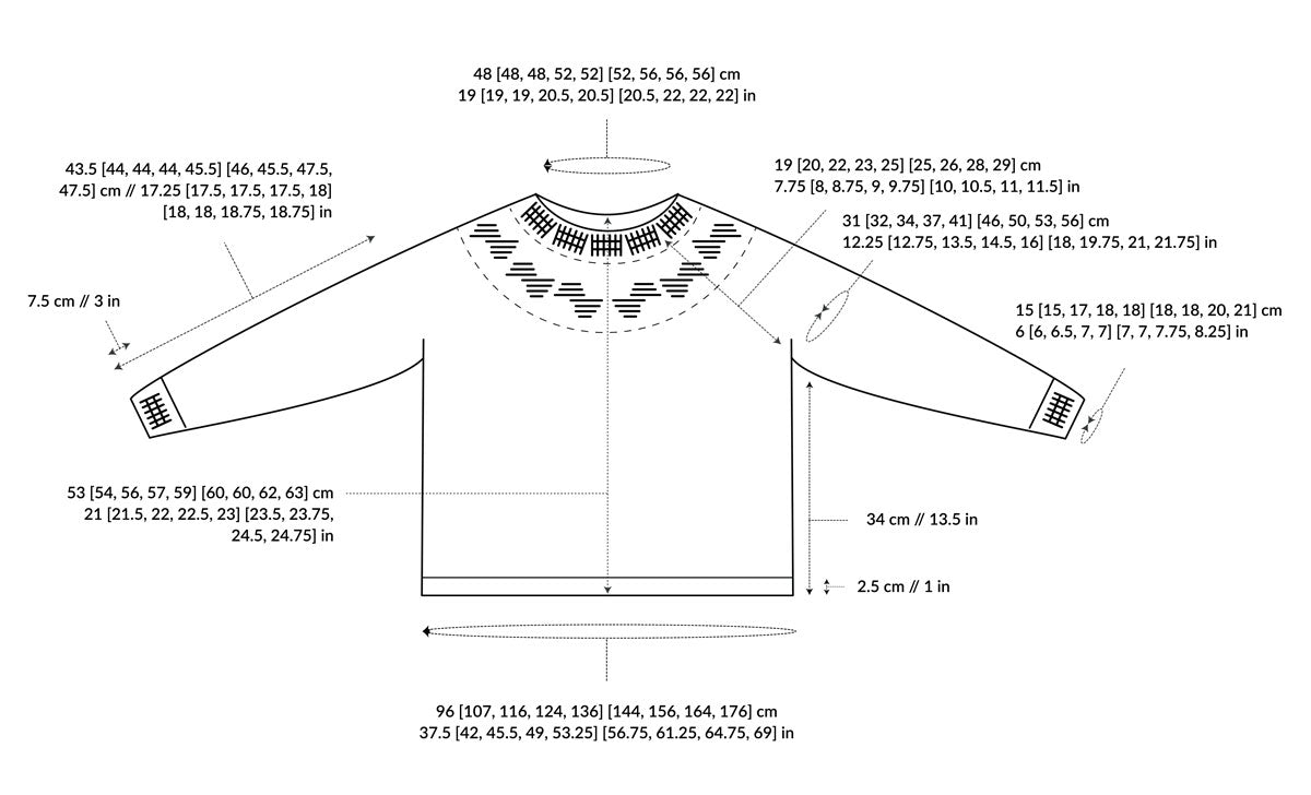 The pattern is written for nine sizes 1 (2, 3, 4, 5) (6, 7, 8, 9) with a finished bust circumference of ca. 96 (107, 116, 124, 136) (144, 156, 164, 176) cm // 37.5 (42, 45.5, 49, 53.25) (56.75, 61.25, 64.75, 69) in incl. ca. 20-23 cm (8-9 in) of recommended positive ease.