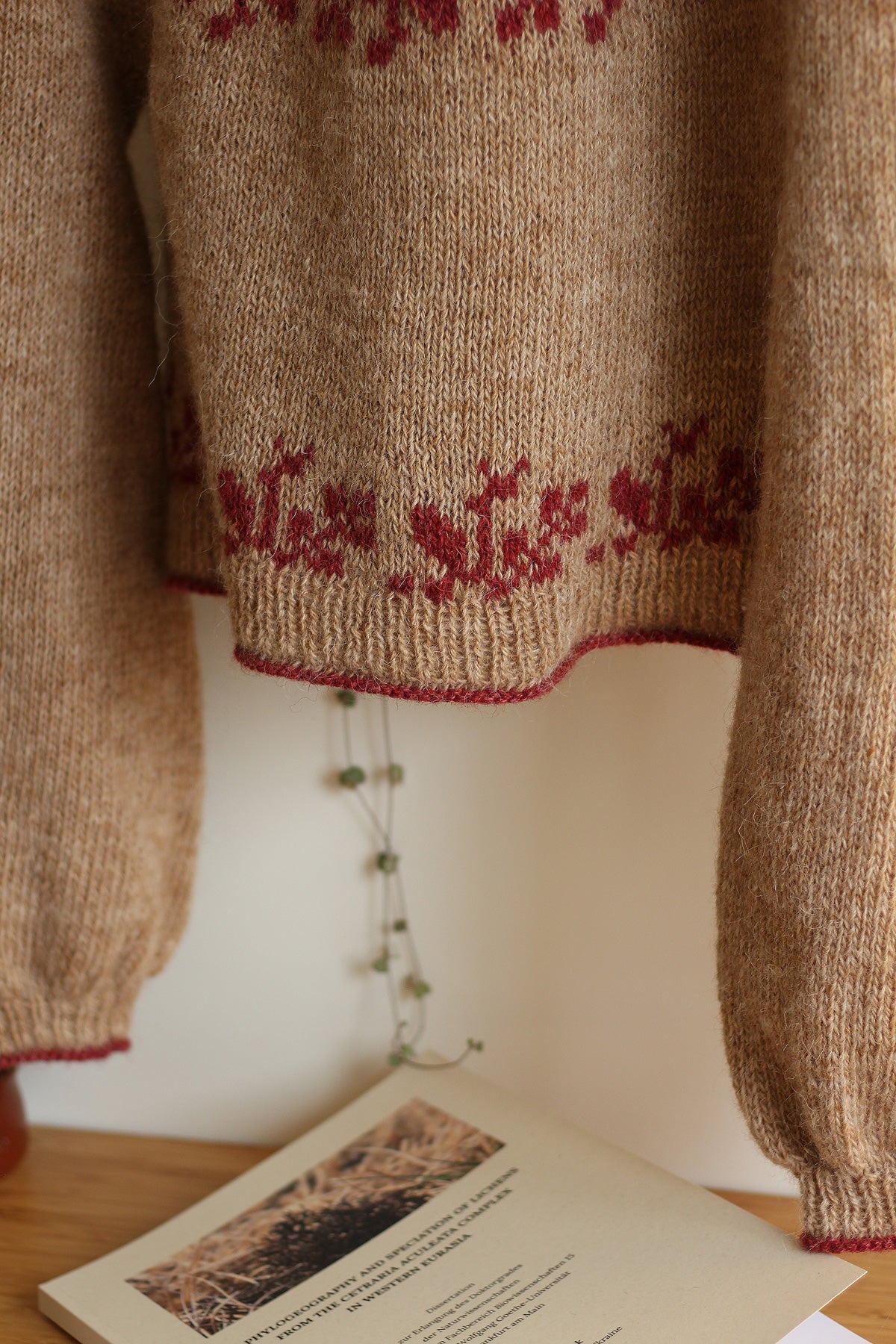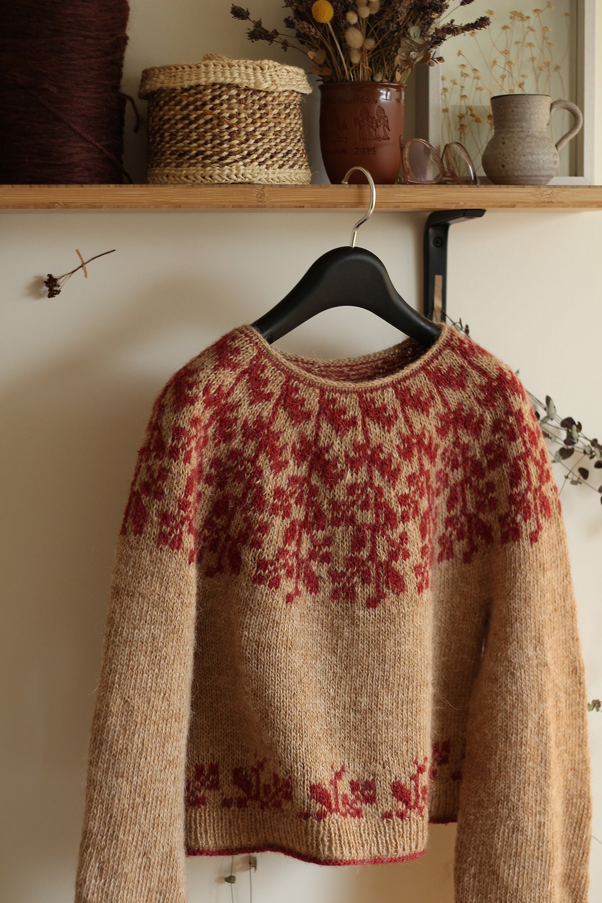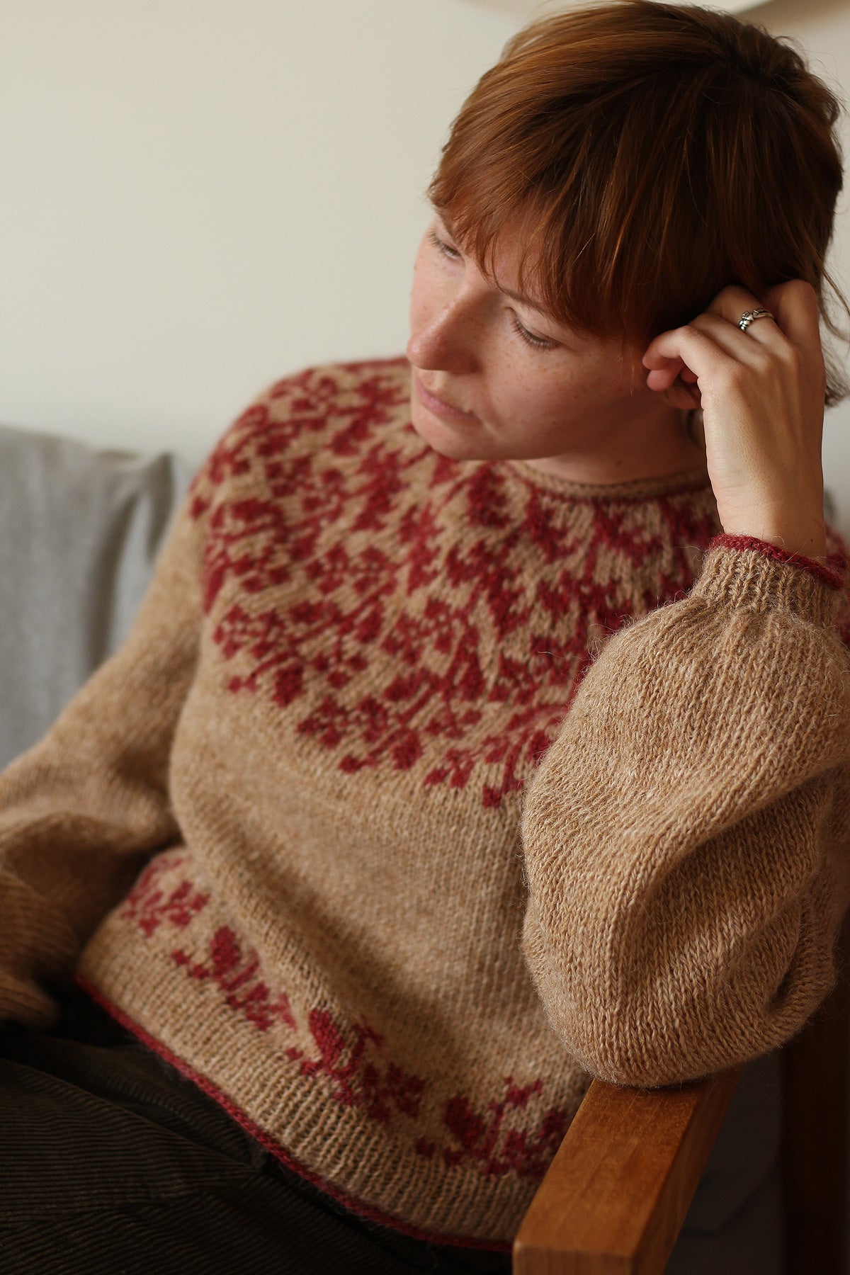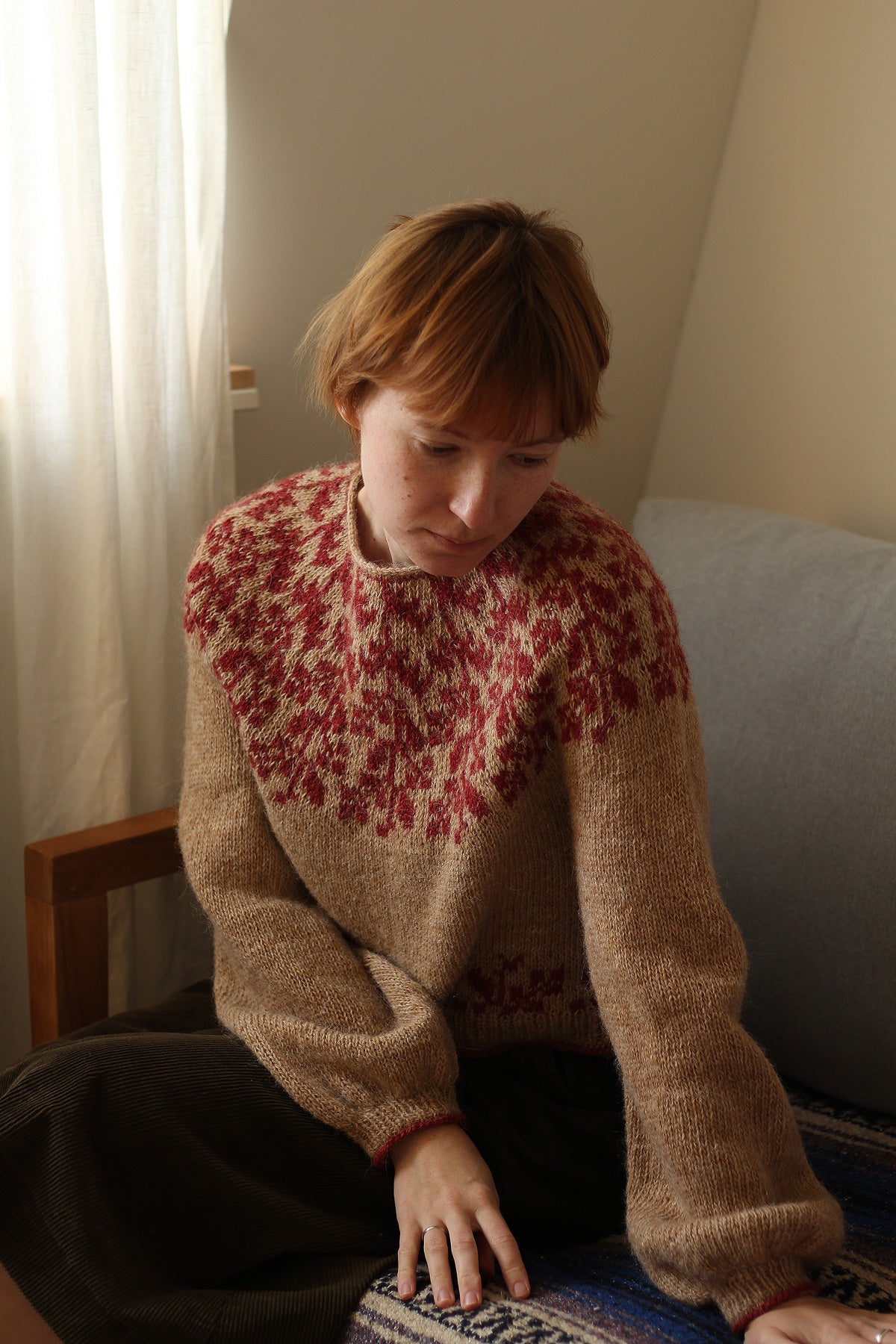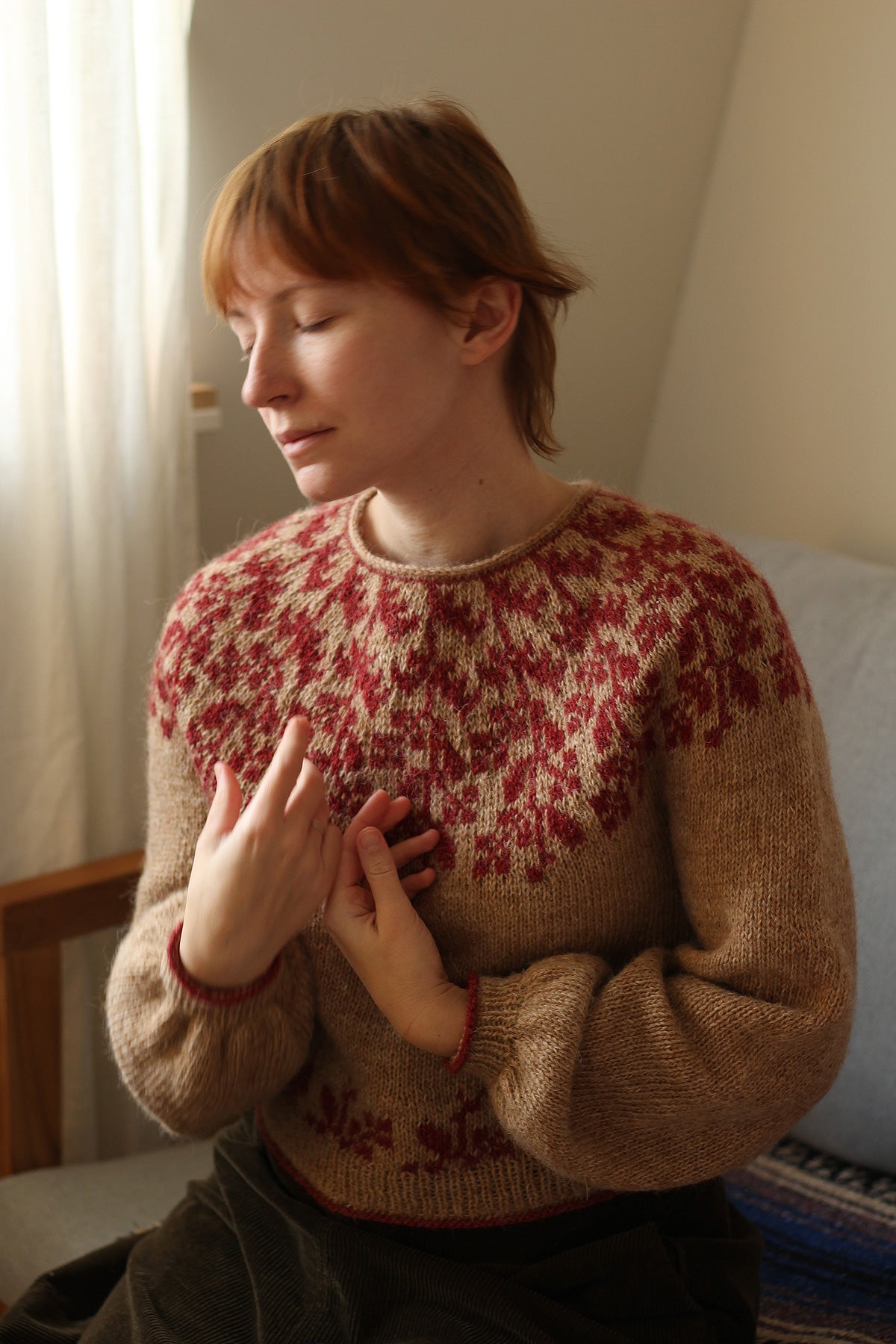 This romantic cropped pullover with a round yoke and blouse-like balloon sleeves features a floral colour work pattern running around the yoke and along the hem. Inspired by the invisible movements of flowers in search of light.