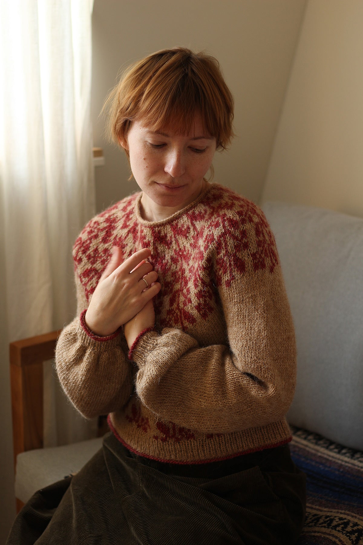 The design comes with a rather unusual construction. The yoke is worked from a provisional cast-on bottom up in the round, whereas the body and sleeves — from the provisional cast-on top down. An alternative to knit the yoke top down, if that’s your preferred way, is also provided in the pattern.