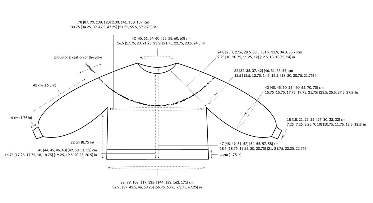 The pattern is written for nine sizes to fit 74 (84, 94, 104, 114) (124, 134, 144, 154) cm // 29 (33, 37, 41, 45) (49, 53, 57, 61) in bust circumference with ca. 10 cm (4 in) of positive ease.