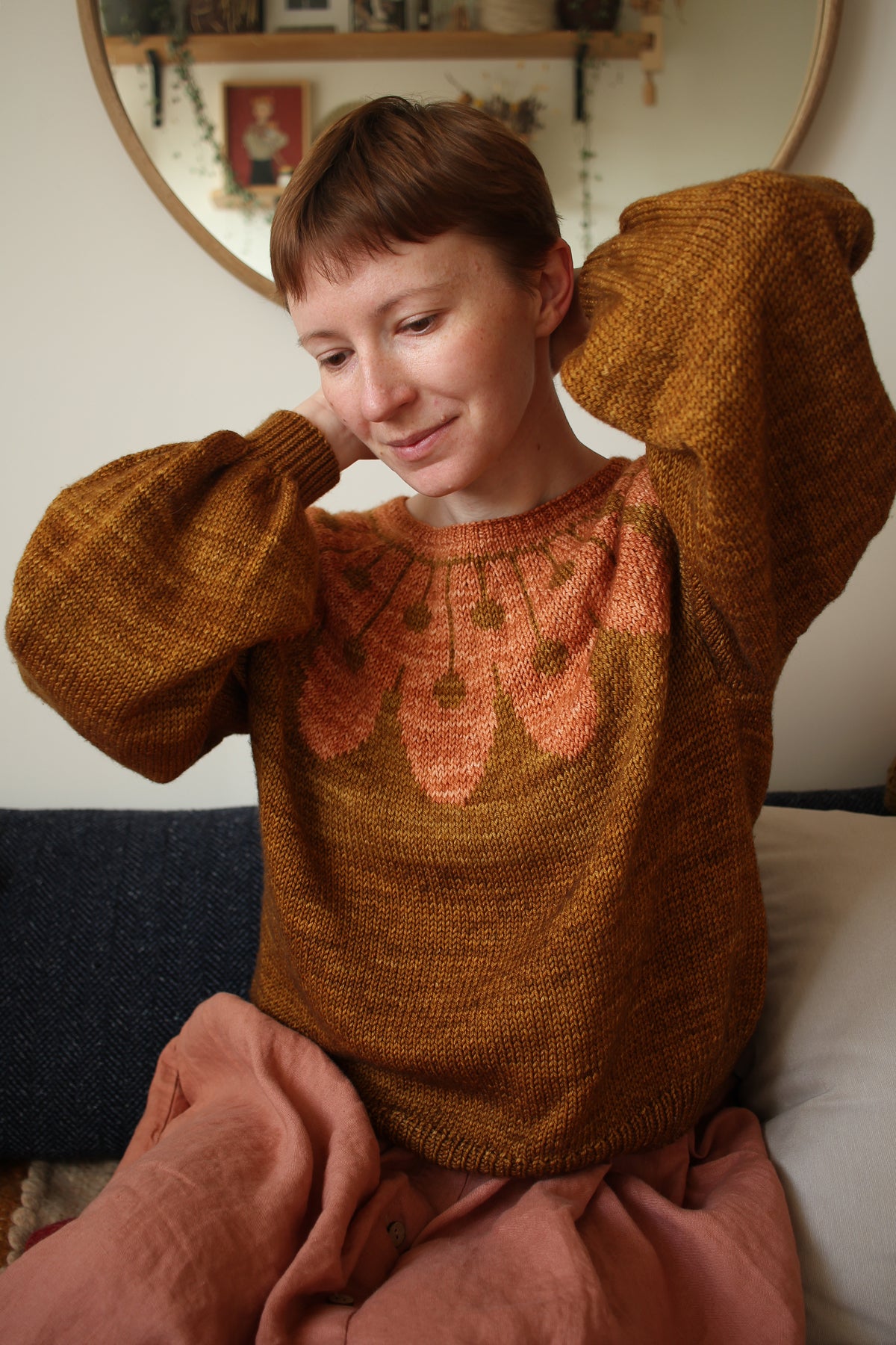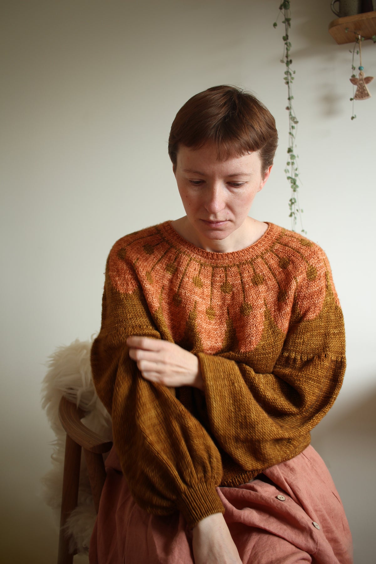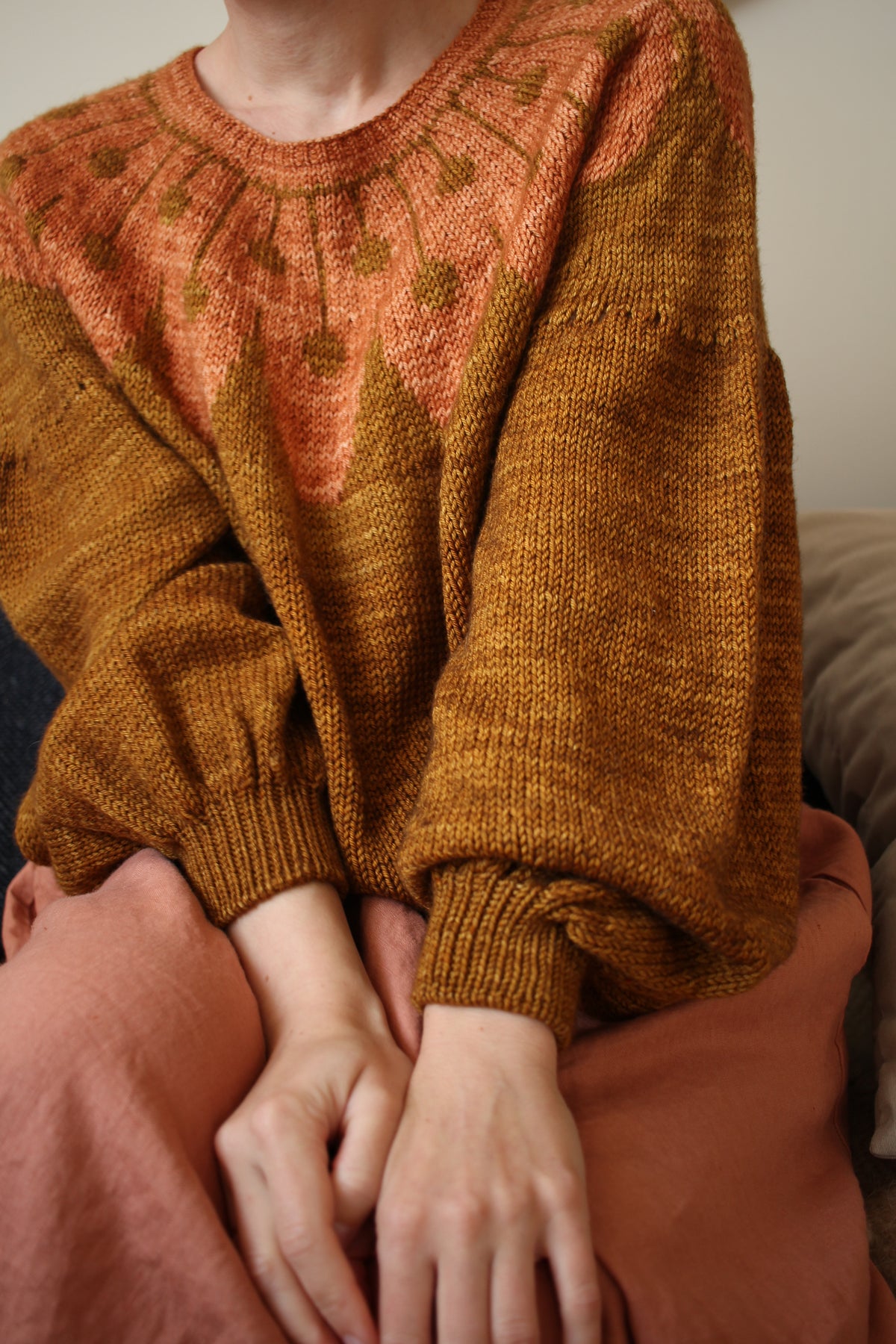 It is a very playful design, which features a colourwork pattern resembling stamens and petals, as if you are indeed wearing a flower on your shoulders. The pullover is worked top-down in the round and comes with 2 sleeve options: exaggerated puffy sleeve, gathered at the cuff, and a classic fitted sleeve.