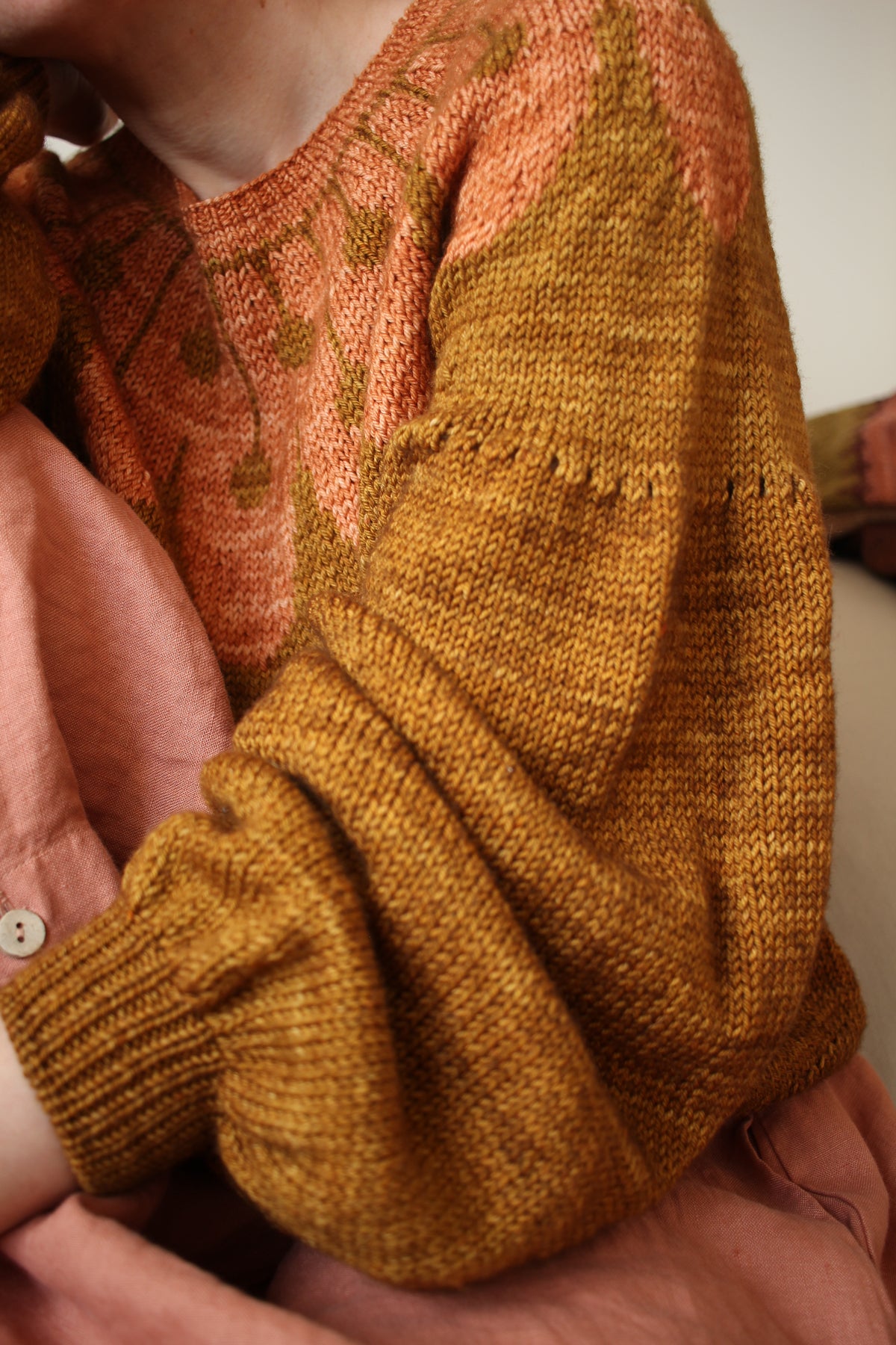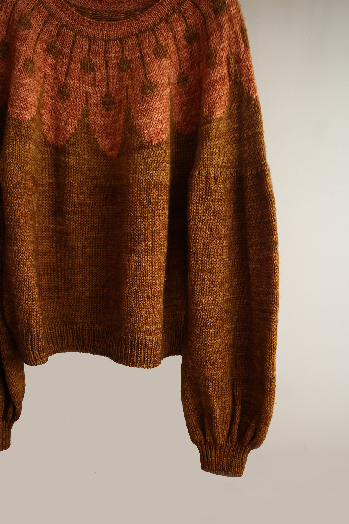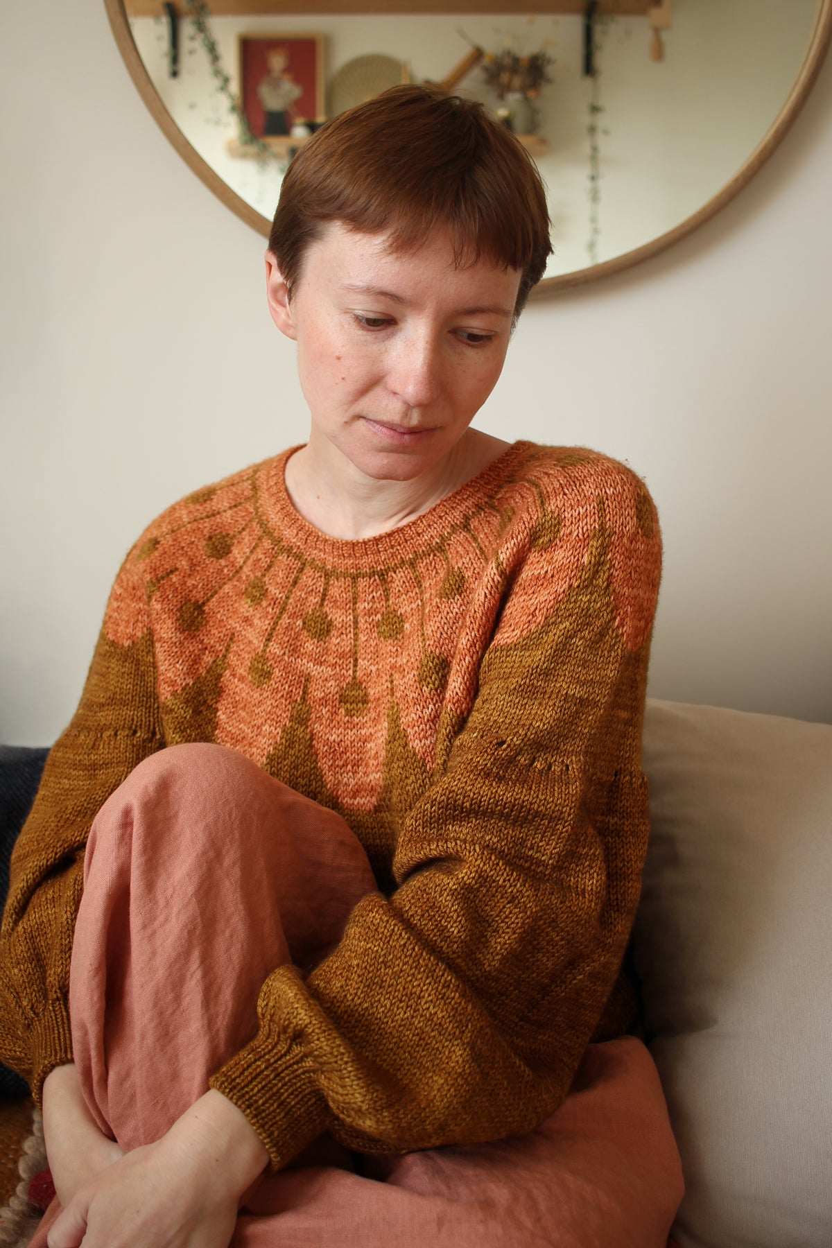 It is a very playful design, which features a colourwork pattern resembling stamens and petals, as if you are indeed wearing a flower on your shoulders. The pullover is worked top-down in the round and comes with 2 sleeve options: exaggerated puffy sleeve, gathered at the cuff, and a classic fitted sleeve.