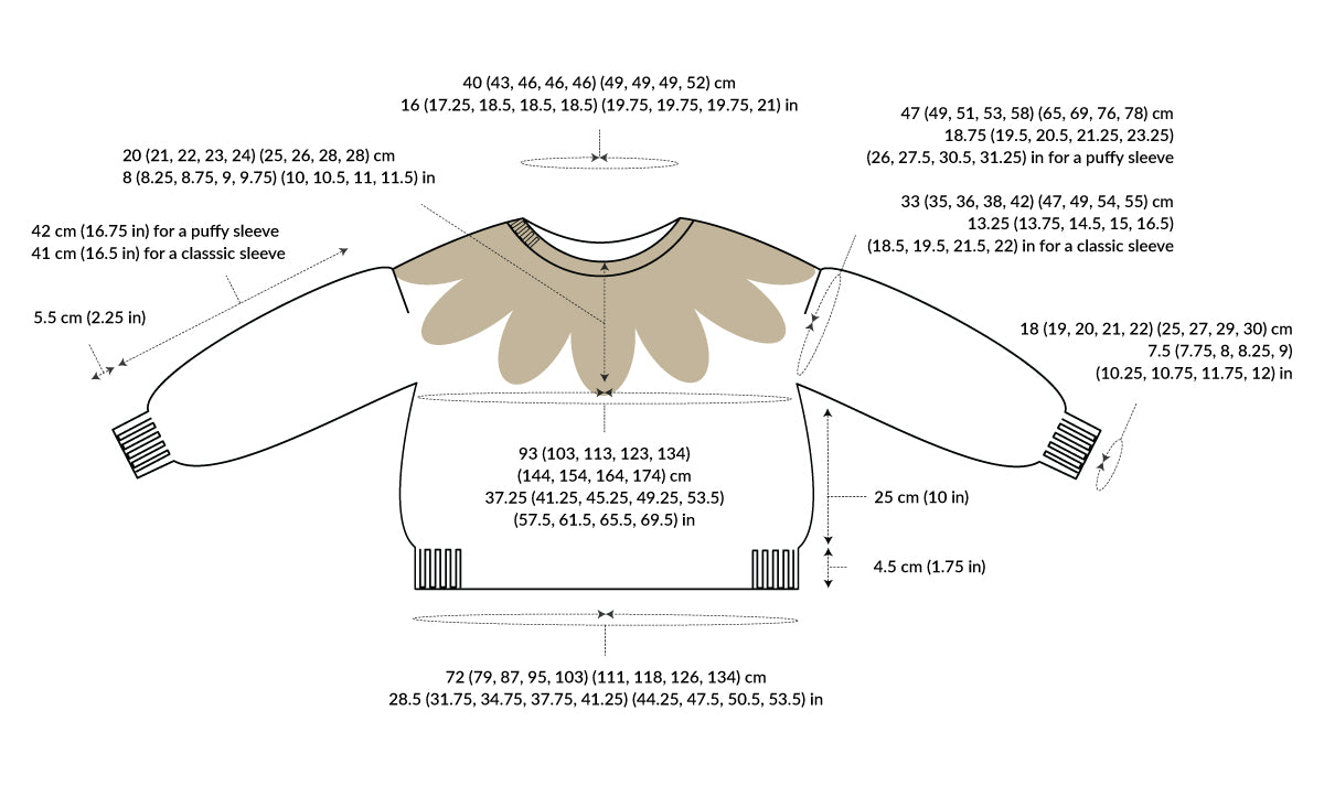 The pattern is written for nine sizes 1 (2, 3, 4, 5) (6, 7, 8, 9) with a finished bust circumference of ca. 93 (103, 113, 123, 134) (144, 154, 164, 174) cm // 37.25 (41.25, 45.25, 49.25, 53.5) (57.5, 61.5, 65.5, 69.5) in incl. at least 15 cm (6 in) of the recommended positive ease.