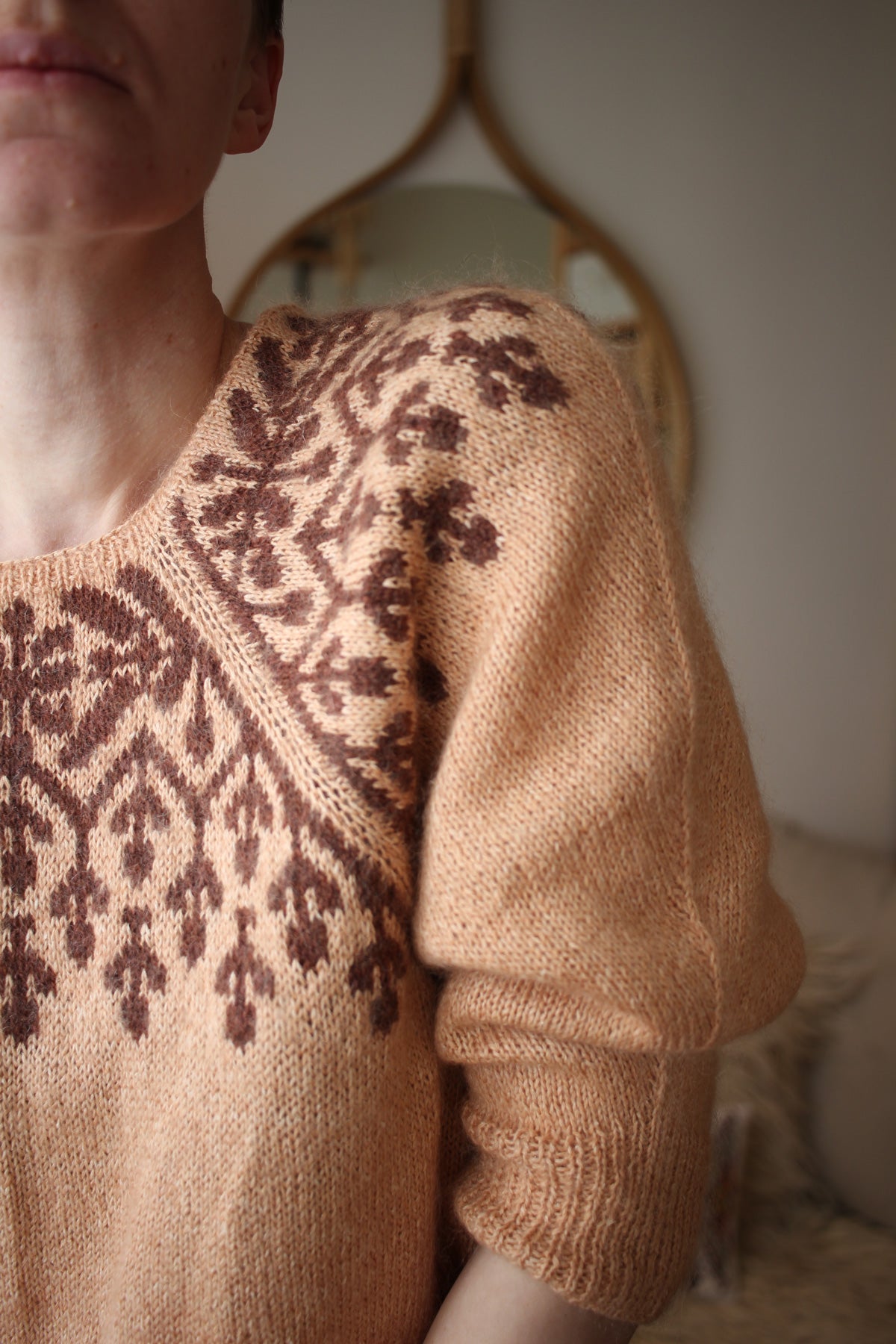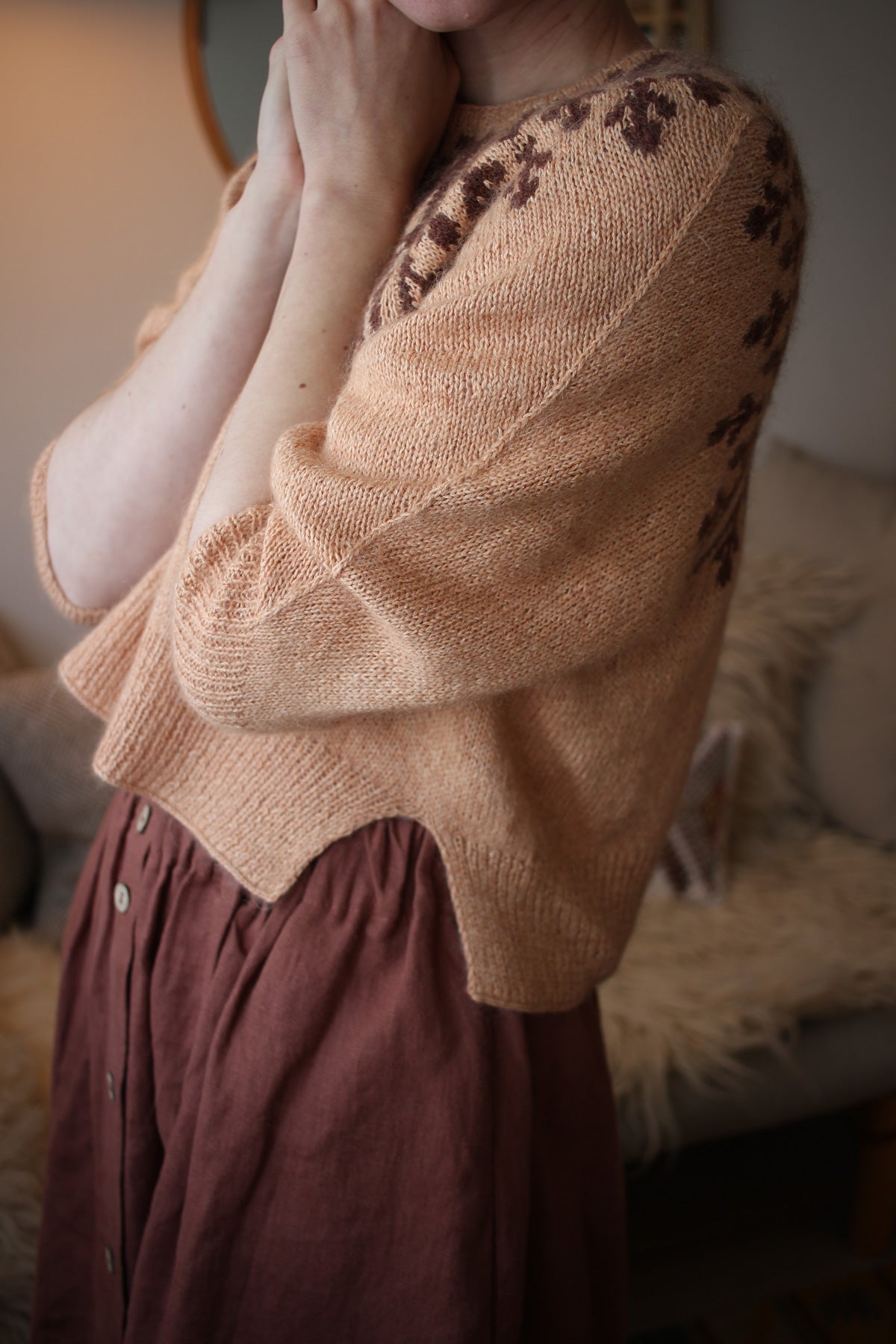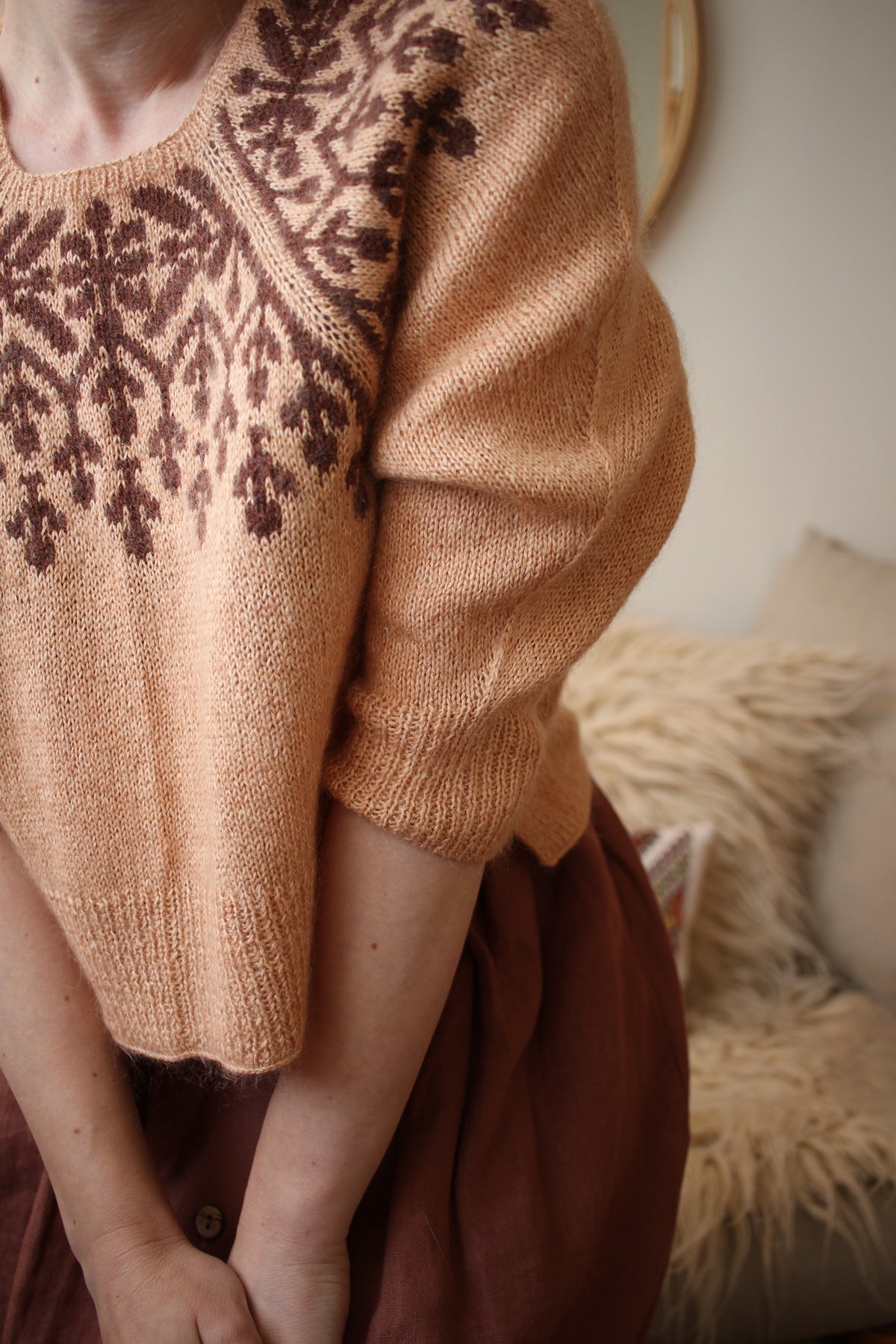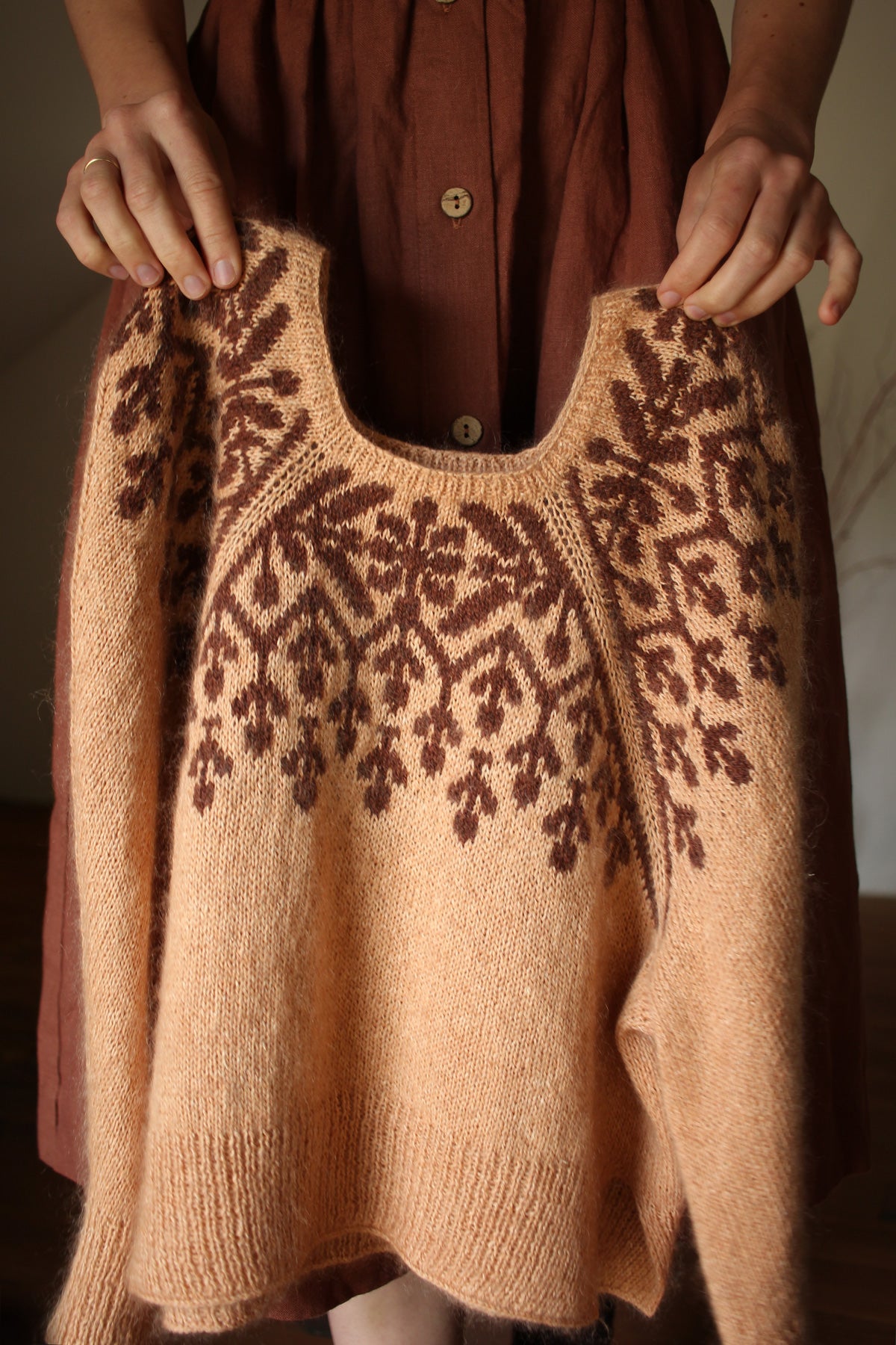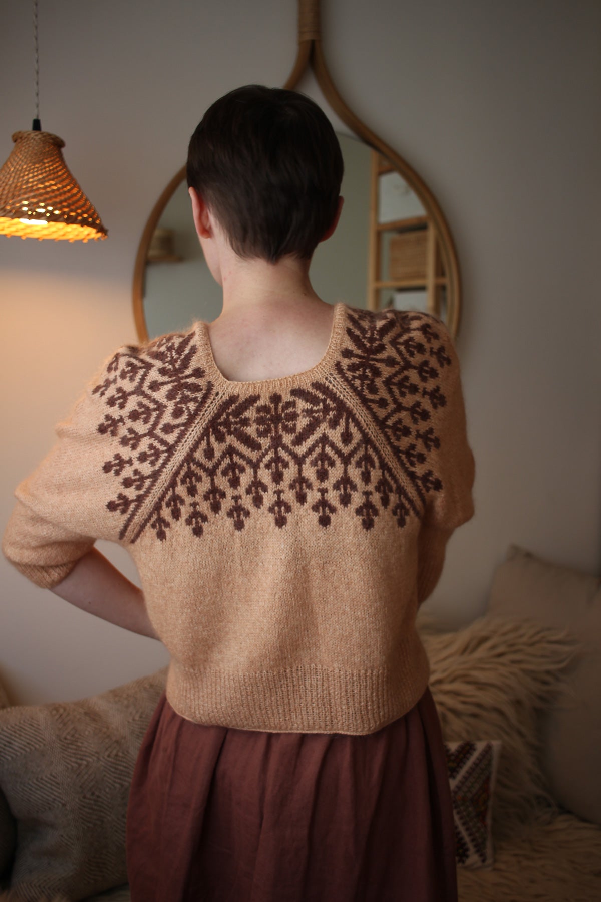 This design is the next step in my explorative journey of the construction method I previously used in my Bifurca vest, Bifurca pullover and Drevo pullover. It is also slightly different to the modular construction of the other designs. Here I work a rectangular central panel into almost raglan-like construction. Yet the most interesting shaping takes place on the shoulders.