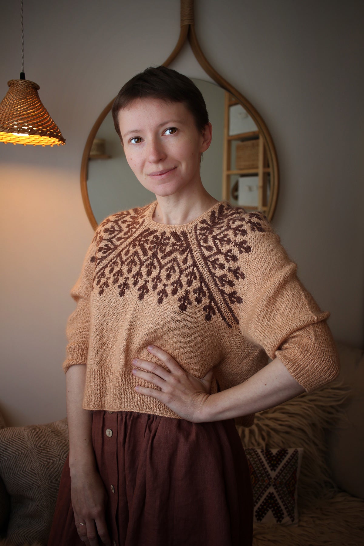 Candelaria is a loosely fitted cropped blouse with short to 3/4 voluminous sleeves, unevenly split hem and slits on the cuffs. The blouse is worked top-down in the round.