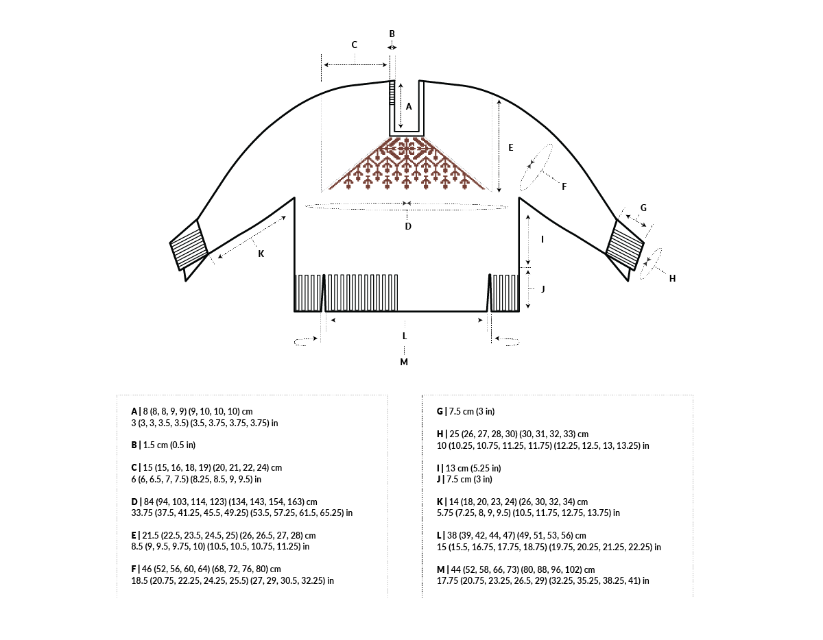 1 (2, 3, 4, 5) (6, 7, 8, 9) with a finished bust circumference of ca.84 (94, 103, 114, 123) (134, 143, 154, 163) cm // 33.75 (37.5, 41.25, 45.5, 49.25) (53.5, 57.25, 61.5, 65.25) in incl. 10 cm (4 in) of the recommended positive ease.