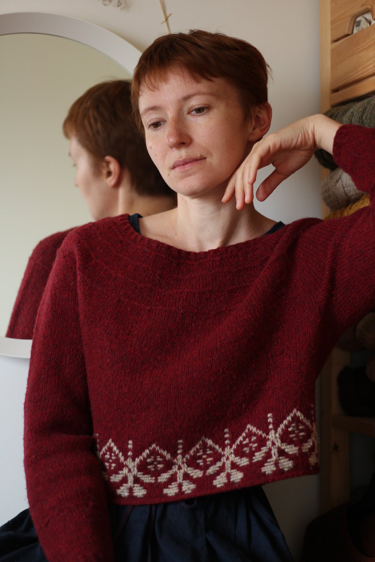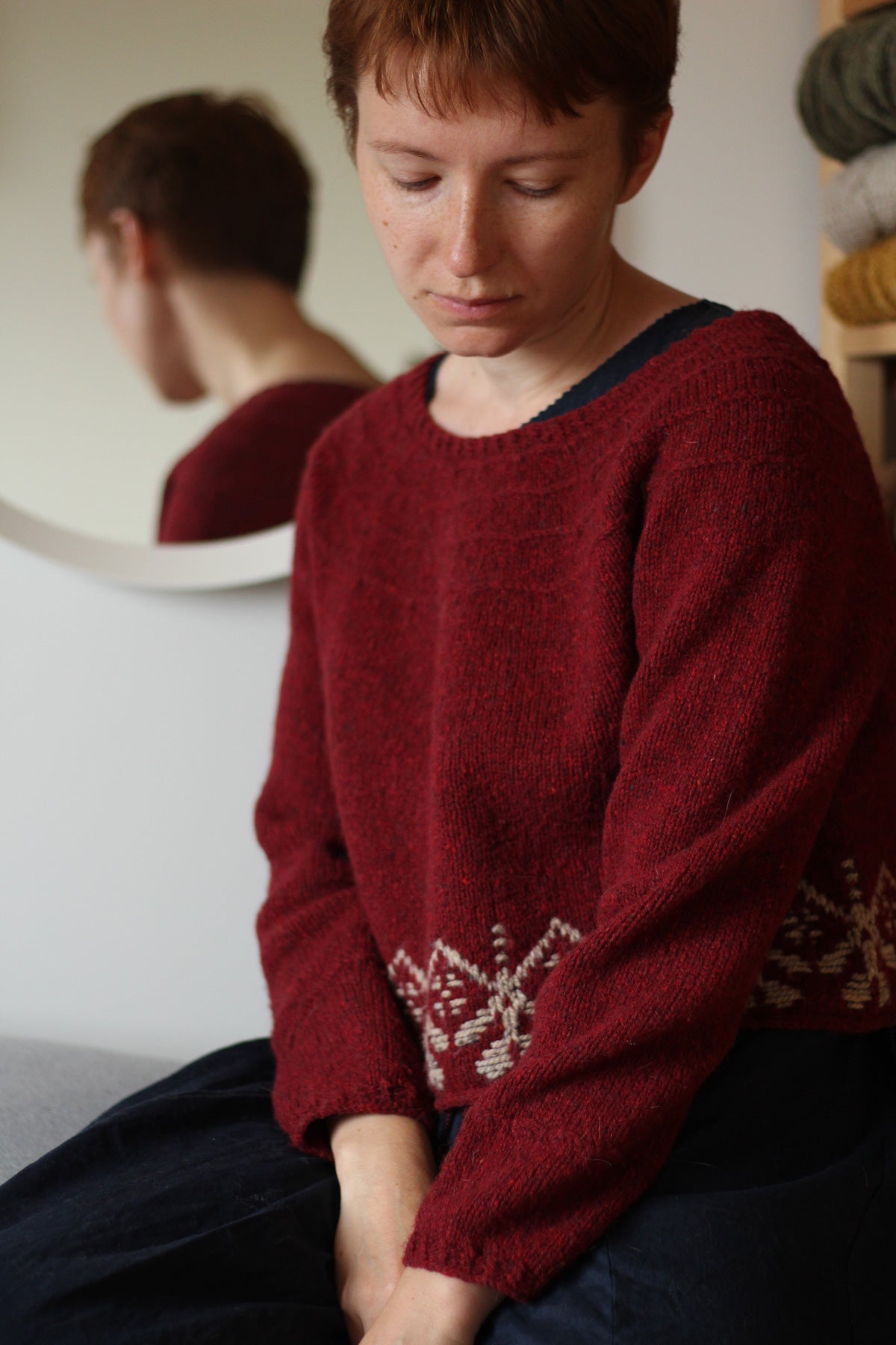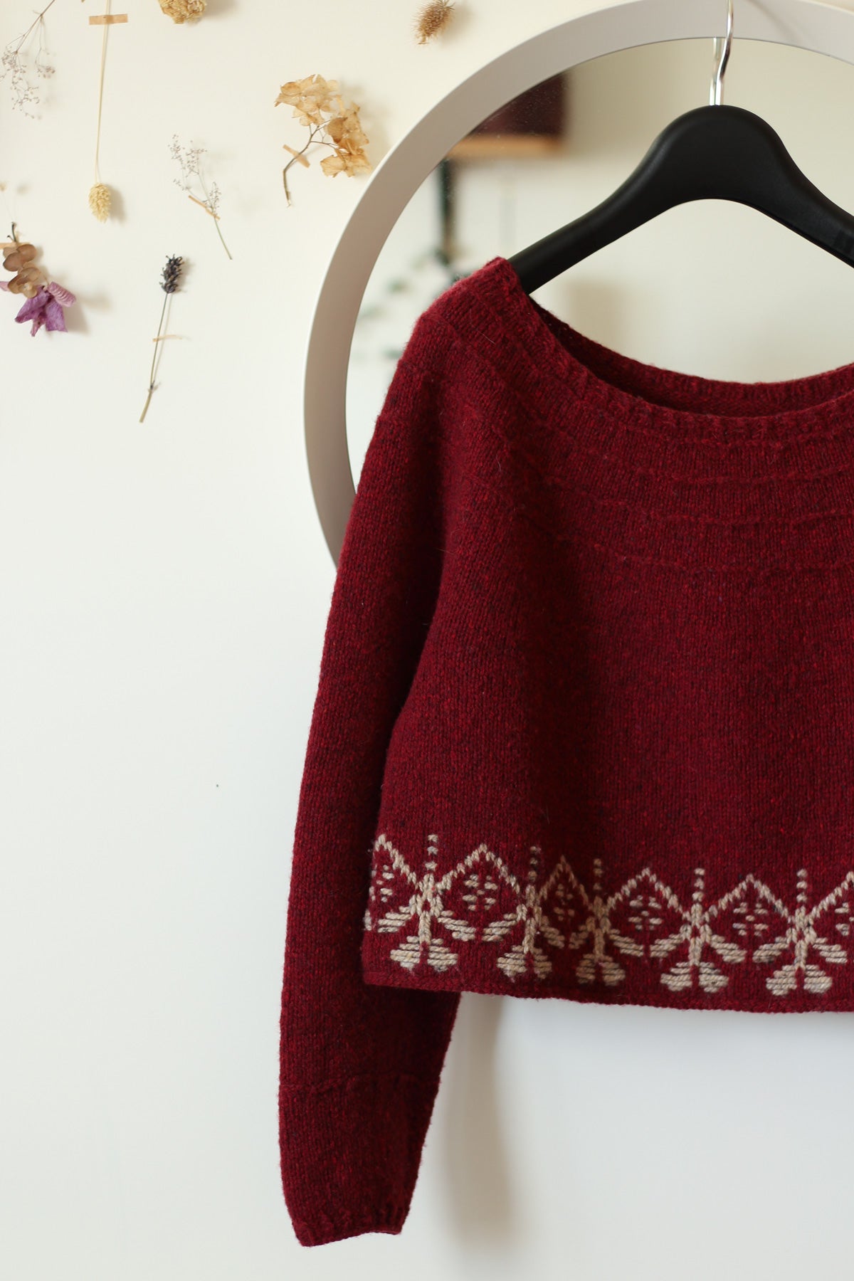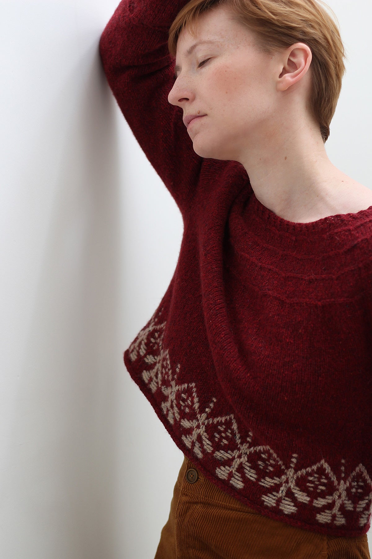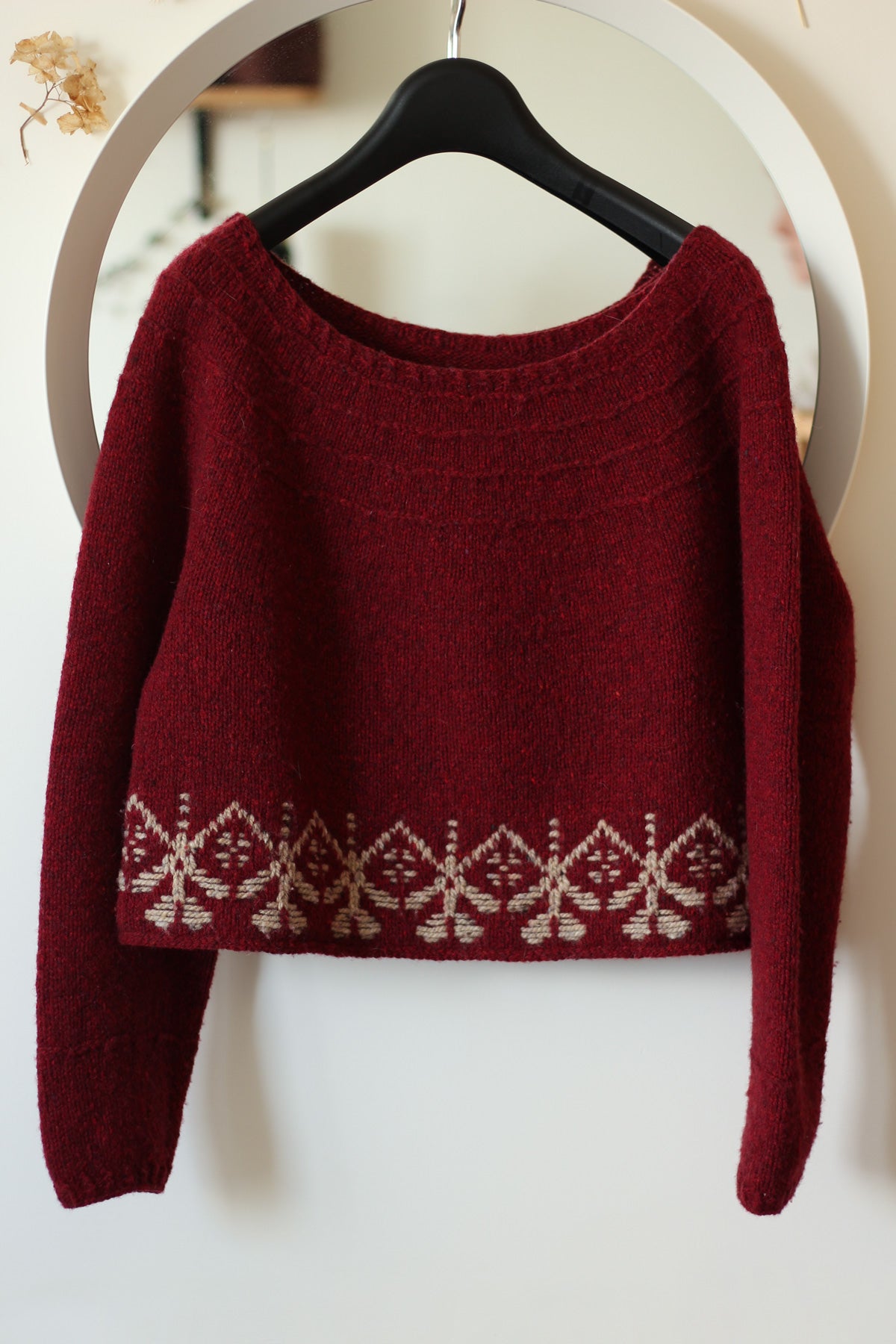 Worked top down seamless in the round, the pullover features round yoke decorated with lateral braids and a hem with intricate “inside out” floral colour work pattern.