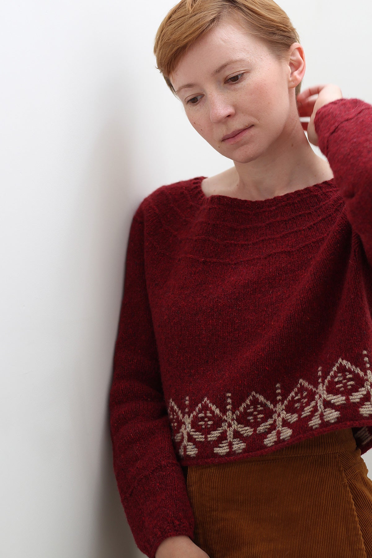 MC: ca. 180 (205, 260, 315, 370) (425, 480, 535, 590) g (cropped version) and 205 (230, 285, 340, 395) (450, 505, 560, 615) g (long version) of Darnie from Studio Donegal, 100% merino wool, 2 ply with 410 m (448 yds) in 100 g, shown in shade 8805 (garnet);