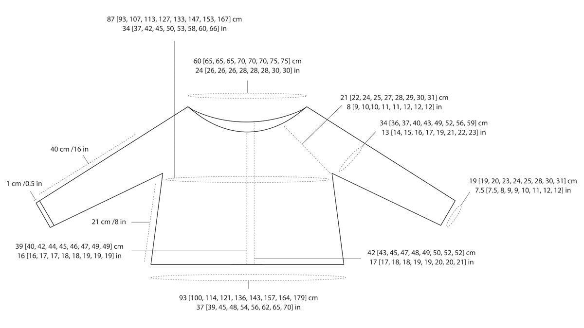 The pattern is written for nine sizes 1 (2, 3, 4, 5) (6, 7, 8, 9) to fit 74 (84, 94, 104, 114) (124, 134, 144, 154) cm // 29 (33, 37, 41, 45) (49, 53, 57, 61) in bust circumference with ca. 9—13 cm (4—5 in) of positive ease.