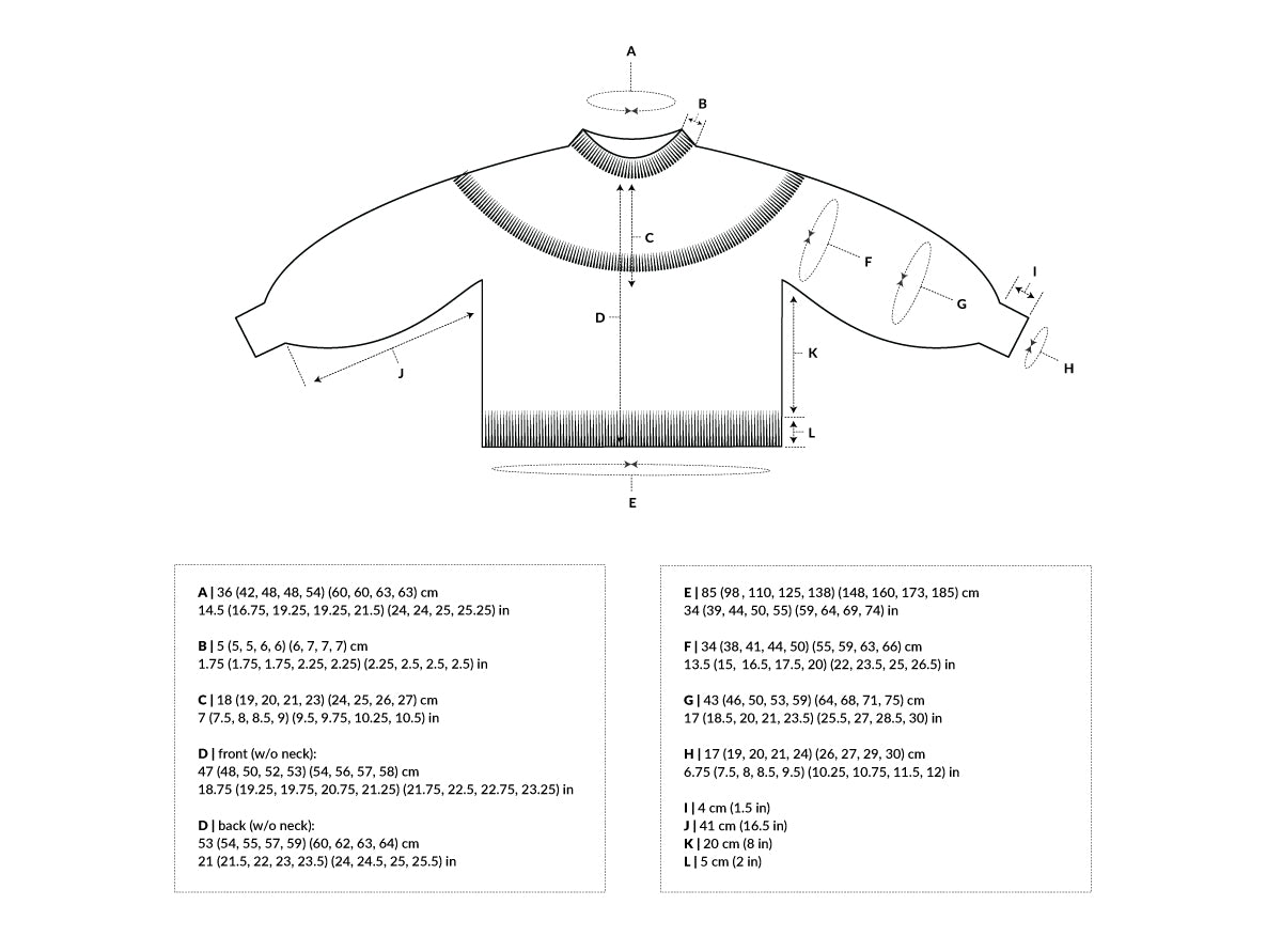 The pattern is written for nine sizes 1 (2, 3, 4, 5) (6, 7, 8, 9) with a finished bust circumference of ca. 85 (98, 110, 125, 138) (148, 160, 173, 185) cm // 34 (39, 44, 50, 55) (59, 64, 69, 74) in incl. ca. 15-20 cm (6-8 in) of the recommended positive ease.