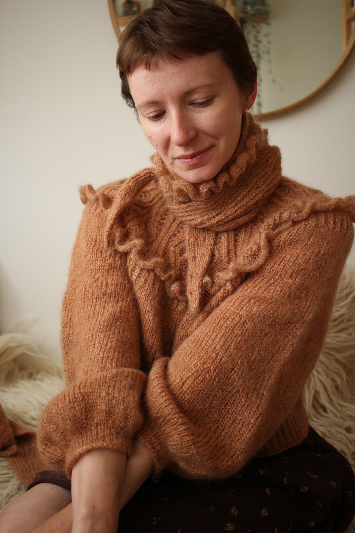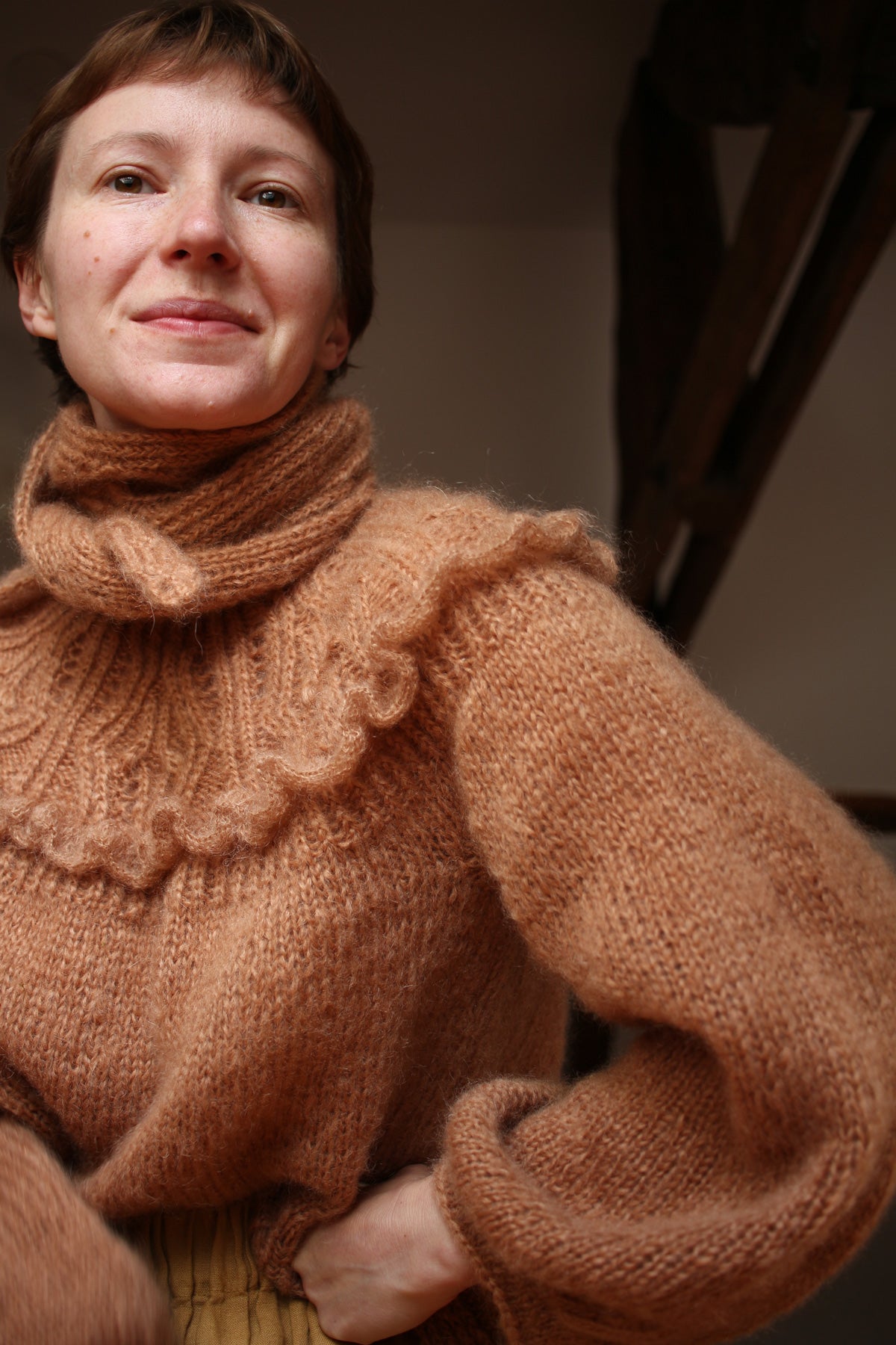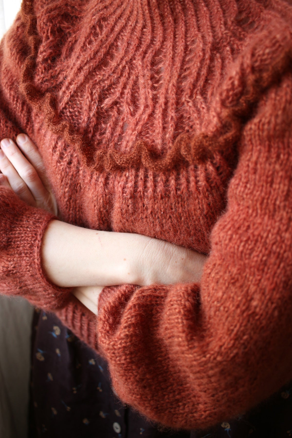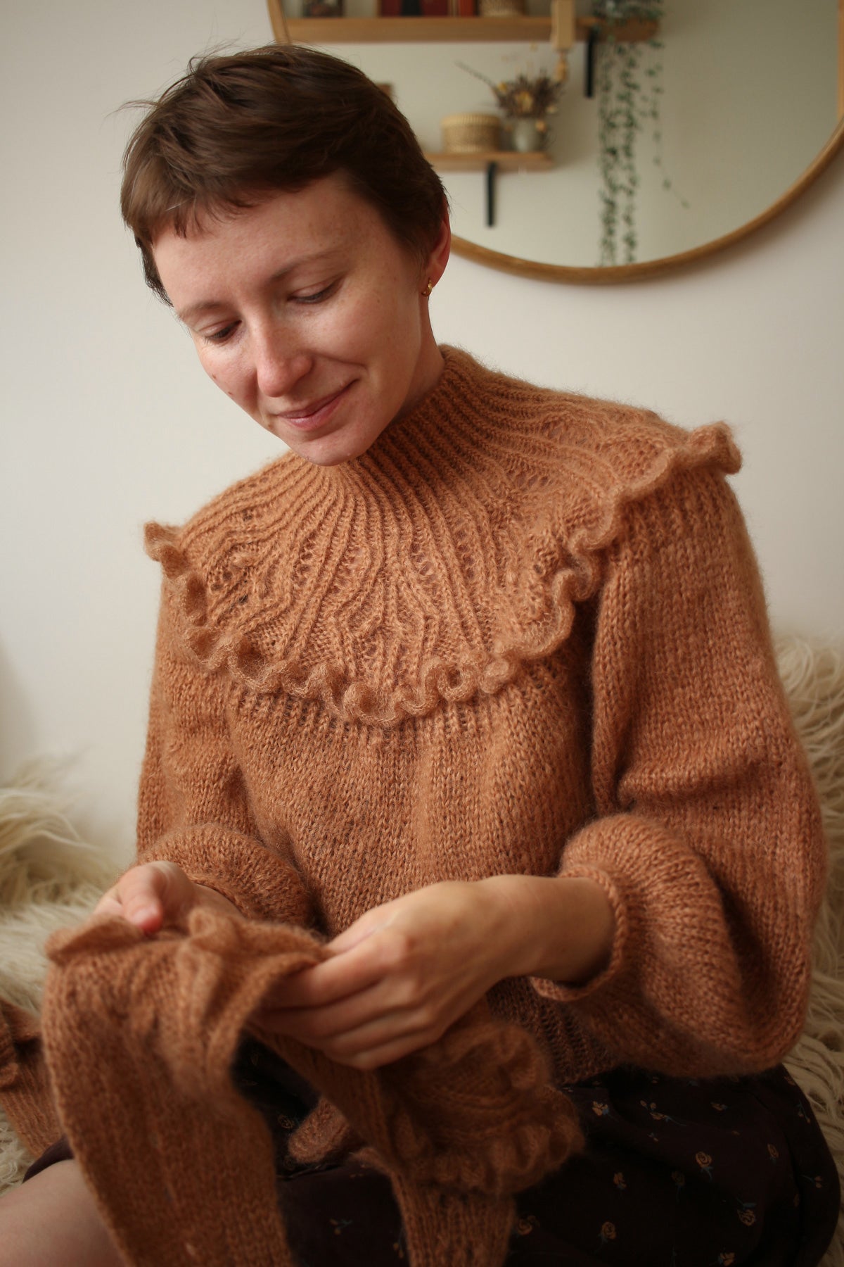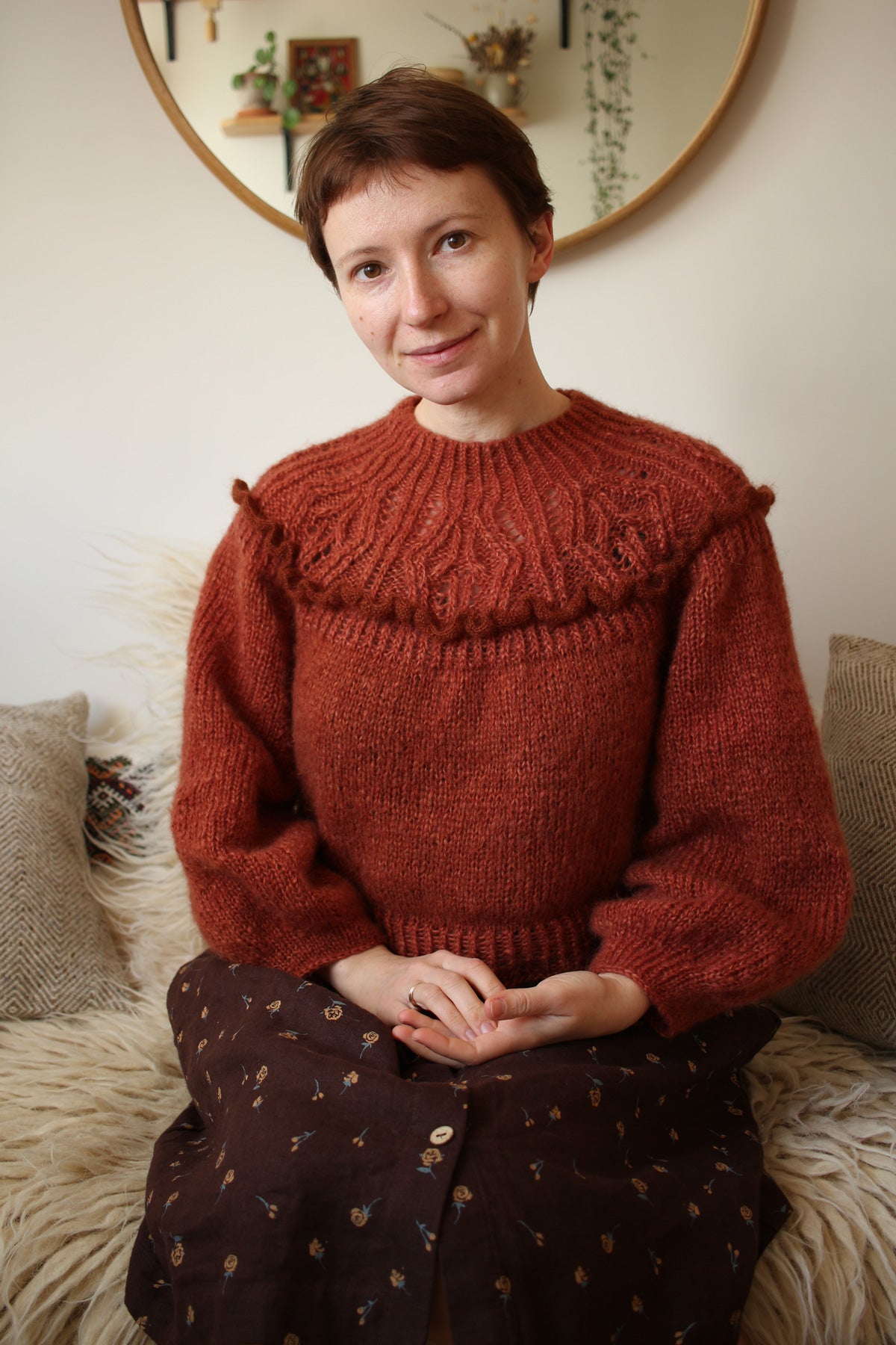 Knit seamlessly from the top down in the round, the design features a round yoke with a beautifully detailed, petal-like pattern. The boxy body offers a relaxed yet refined silhouette, complemented by balloon sleeves, which gather at the cuffs. Simple half-twisted ribbing on the hem balances the overall soft and romantic look.