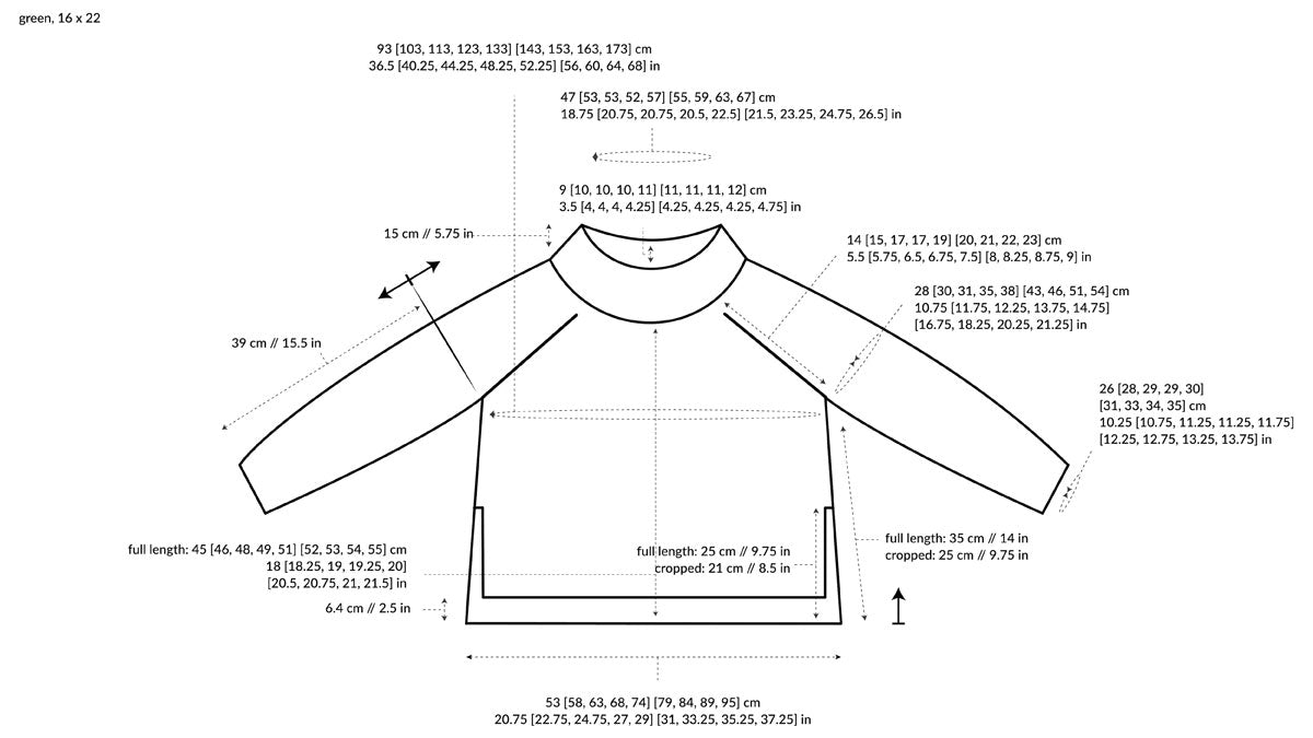 The pattern is written for nine sizes 1 (2, 3, 4, 5) (6, 7, 8, 9) with a finished bust circumference of ca. 93 (103, 113, 123, 133) (143, 153, 163, 173) cm // 36.5 (40.25, 44.25, 48.25, 52.25) (56, 60, 64, 68) in (sample in Green) and ca. 106 (117, 129, 140, 151) (163, 174, 186, 197) cm // 41.5 (46, 50.5, 55, 59.5) (64, 68.5, 73, 77.5) in (sample in Grey) incl. at least 20 cm (8 in) of positive ease.