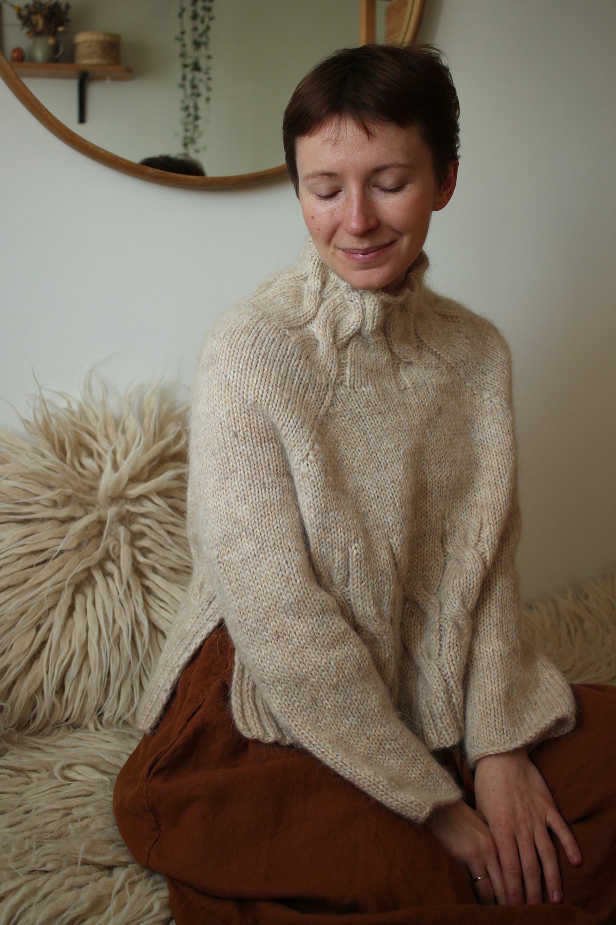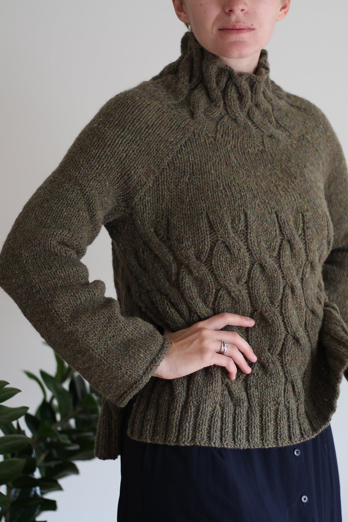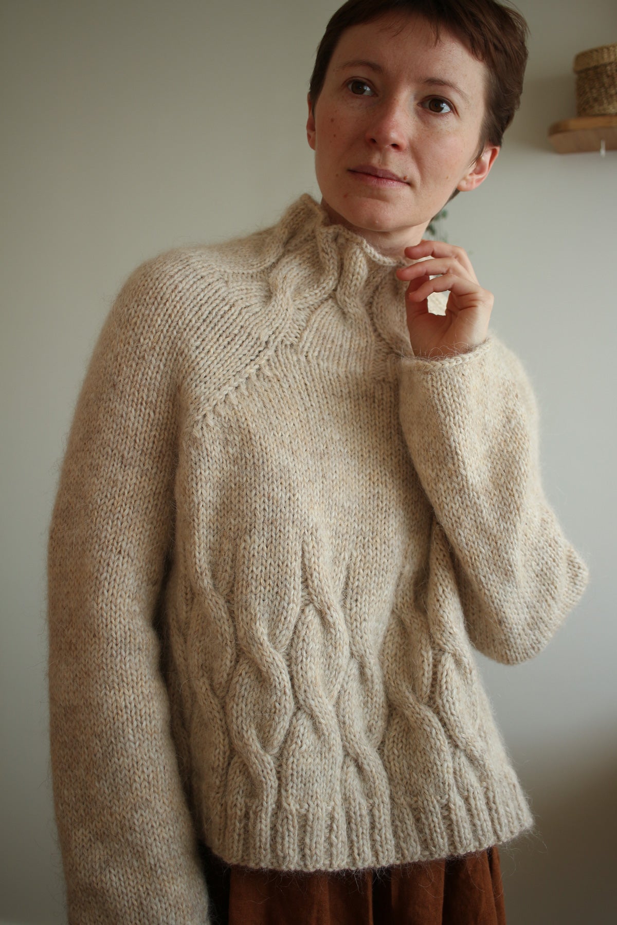It is a simple yet elegant pullover, designed to be oversized for a comfortable relaxed fit. The side slits add a modern touch to an otherwise minimal raglan pullover with elegant cables spiraling up the body and mock neck. The pullover is worked bottom-up in the round with the sleeves knitted top-down from the underarms. Since the two samples I knit have different gauges and I like both of the looks, this pattern includes 2 size options with different amounts of positive ease.
