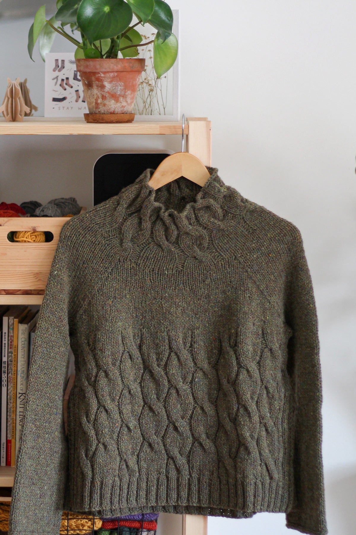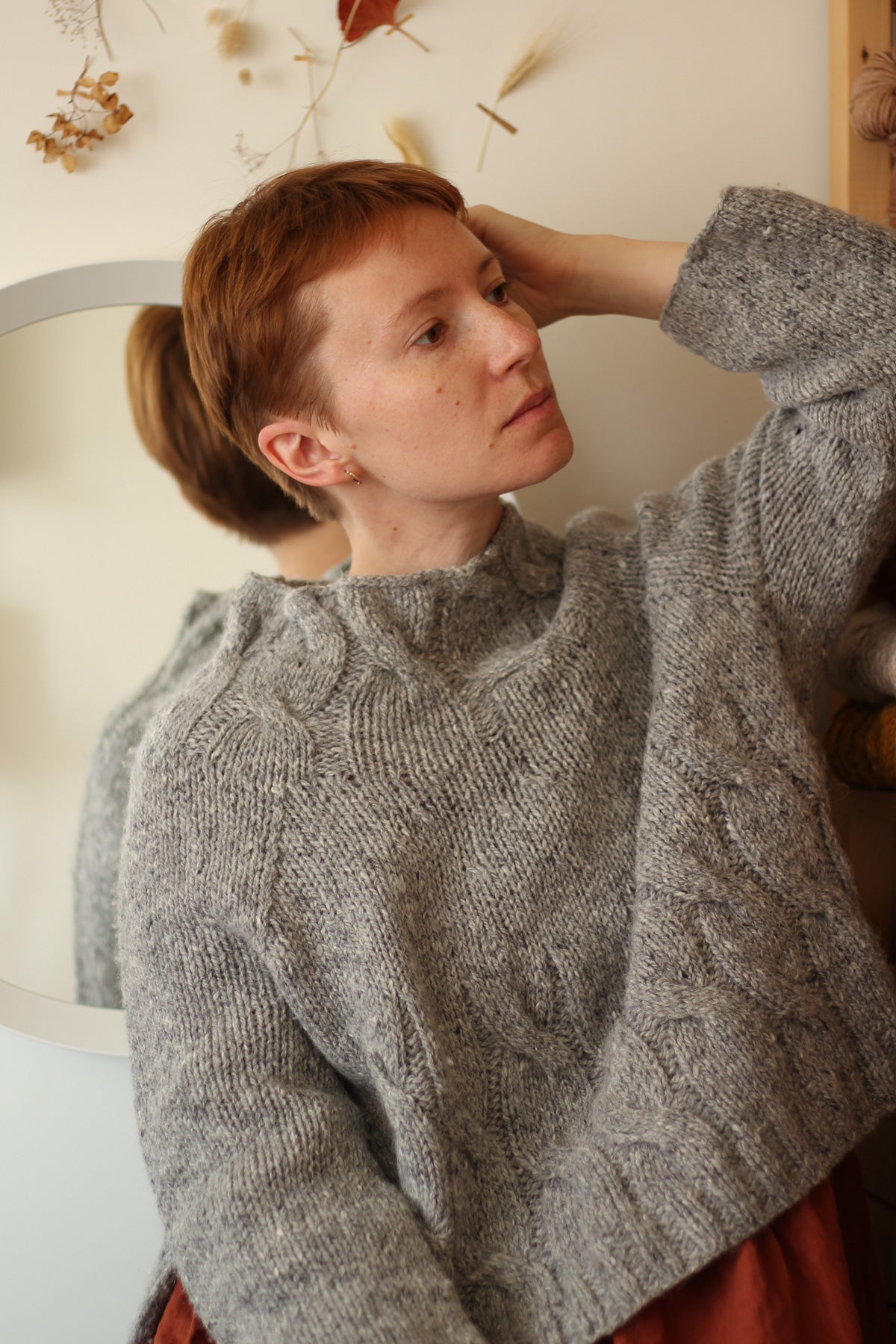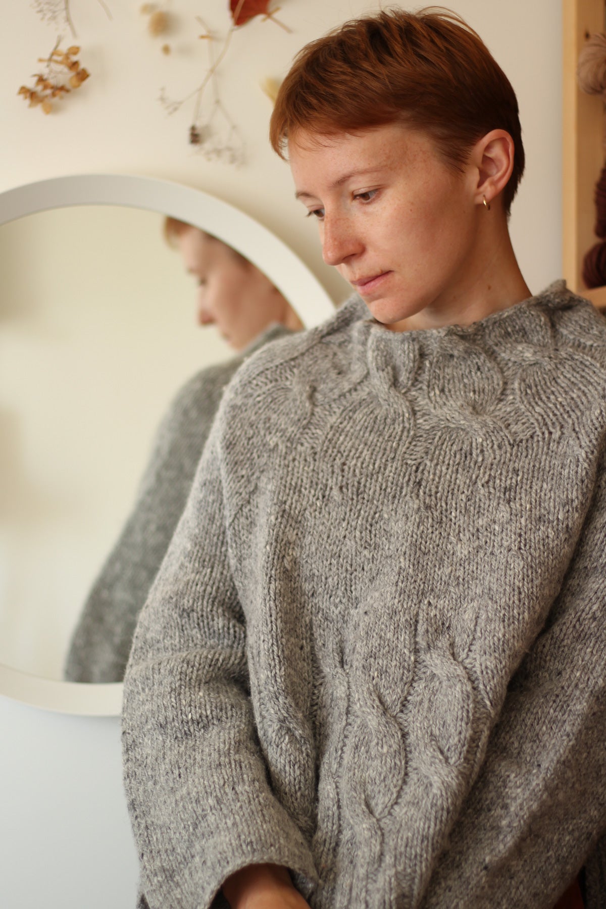 It is a simple yet elegant pullover, designed to be oversized for a comfortable relaxed fit. The side slits add a modern touch to an otherwise minimal raglan pullover with elegant cables spiraling up the body and mock neck. The pullover is worked bottom-up in the round with the sleeves knitted top-down from the underarms. Since the two samples I knit have different gauges and I like both of the looks, this pattern includes 2 size options with different amounts of positive ease.