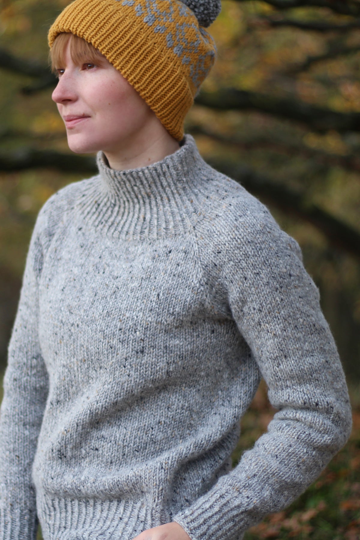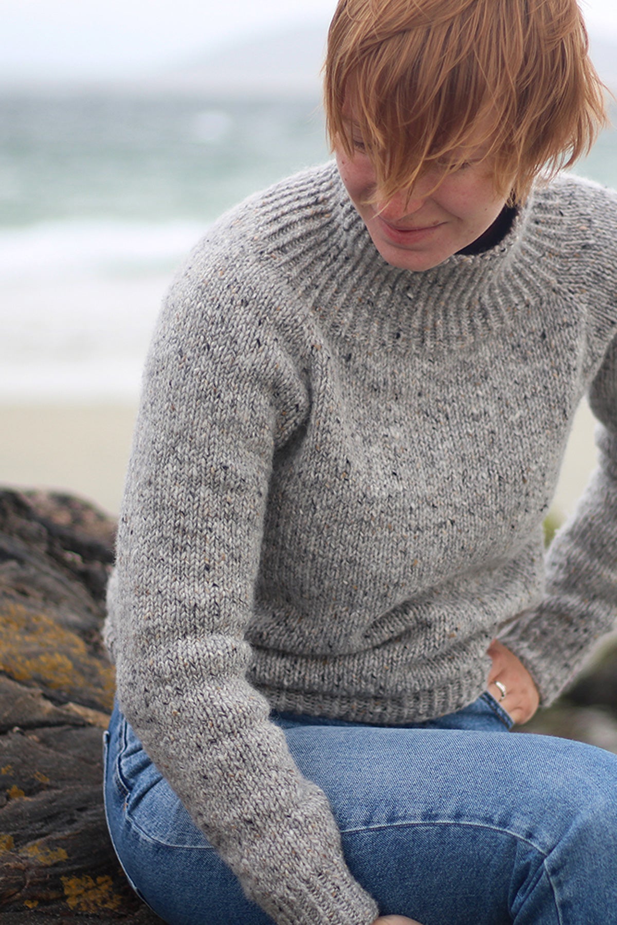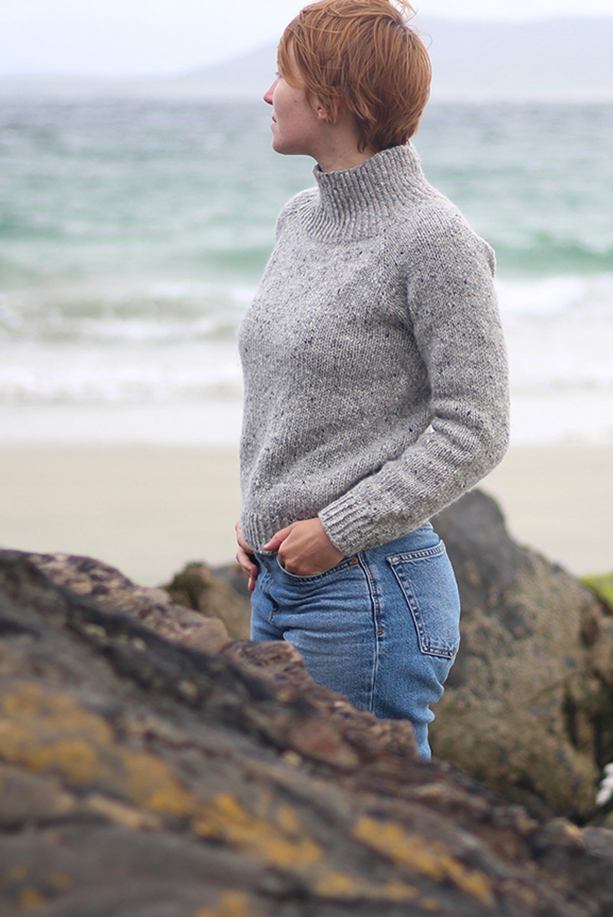 Donegal Pullover is the most simple raglan pullover with a wide standing mock neck. The garment is worked top down in a round with a few short rows shaping the neck and gradual increases along the raglan lines. This could easily be your first pullover!