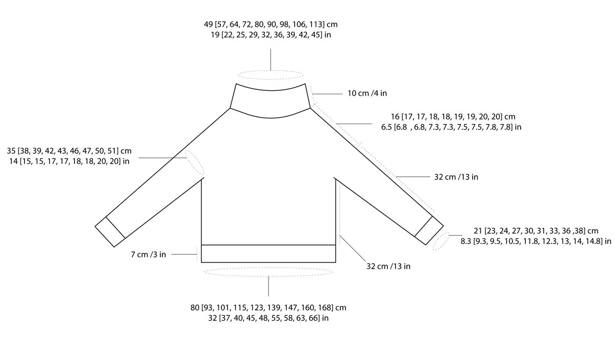 The pattern is written for nine sizes 1 (2, 3, 4, 5) (6, 7, 8, 9) with a finished bust circumference of ca. 83 (95, 104, 113, 125) (135, 144, 153, 165) cm // 33 (38, 41.5, 45.25, 50) (54, 57.5, 61.25, 66) in incl. at least 10 cm (4 in) of positive ease.