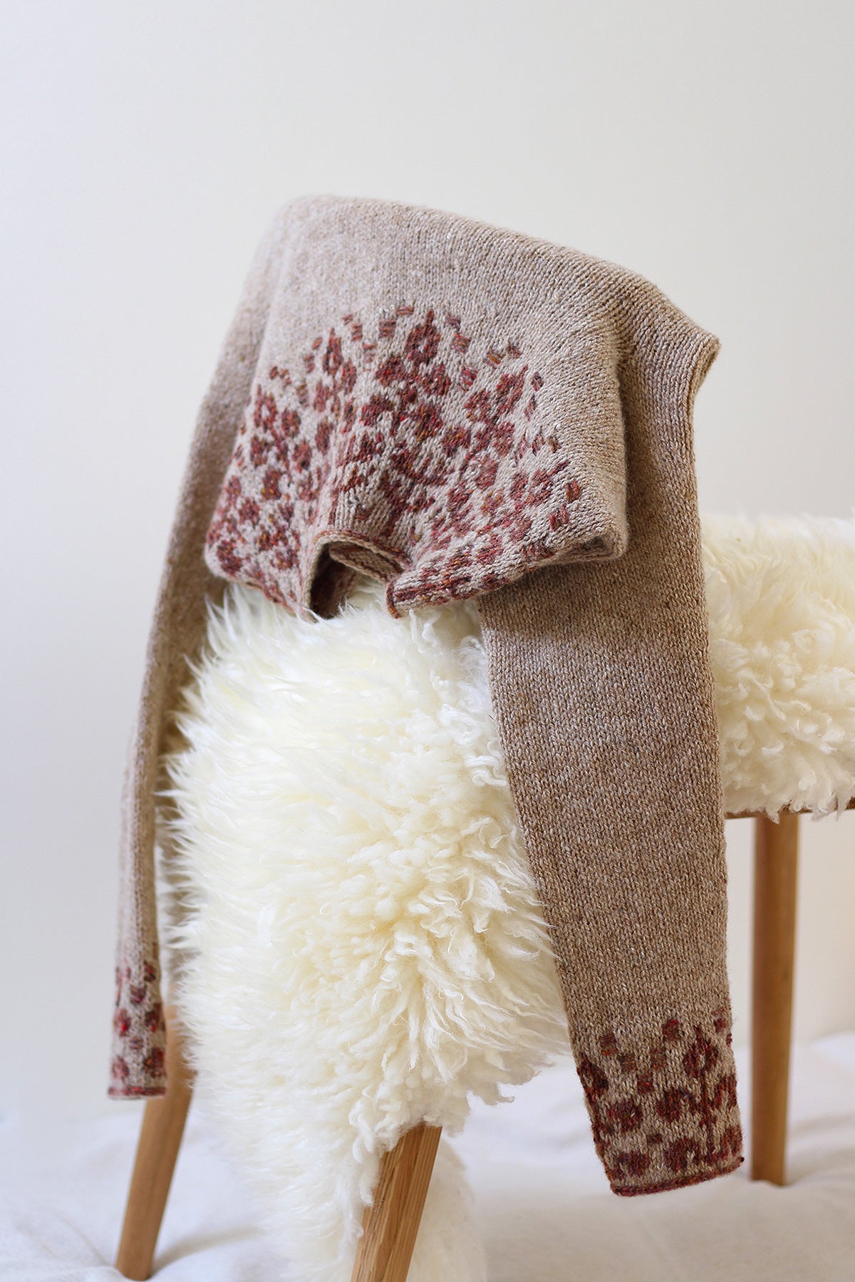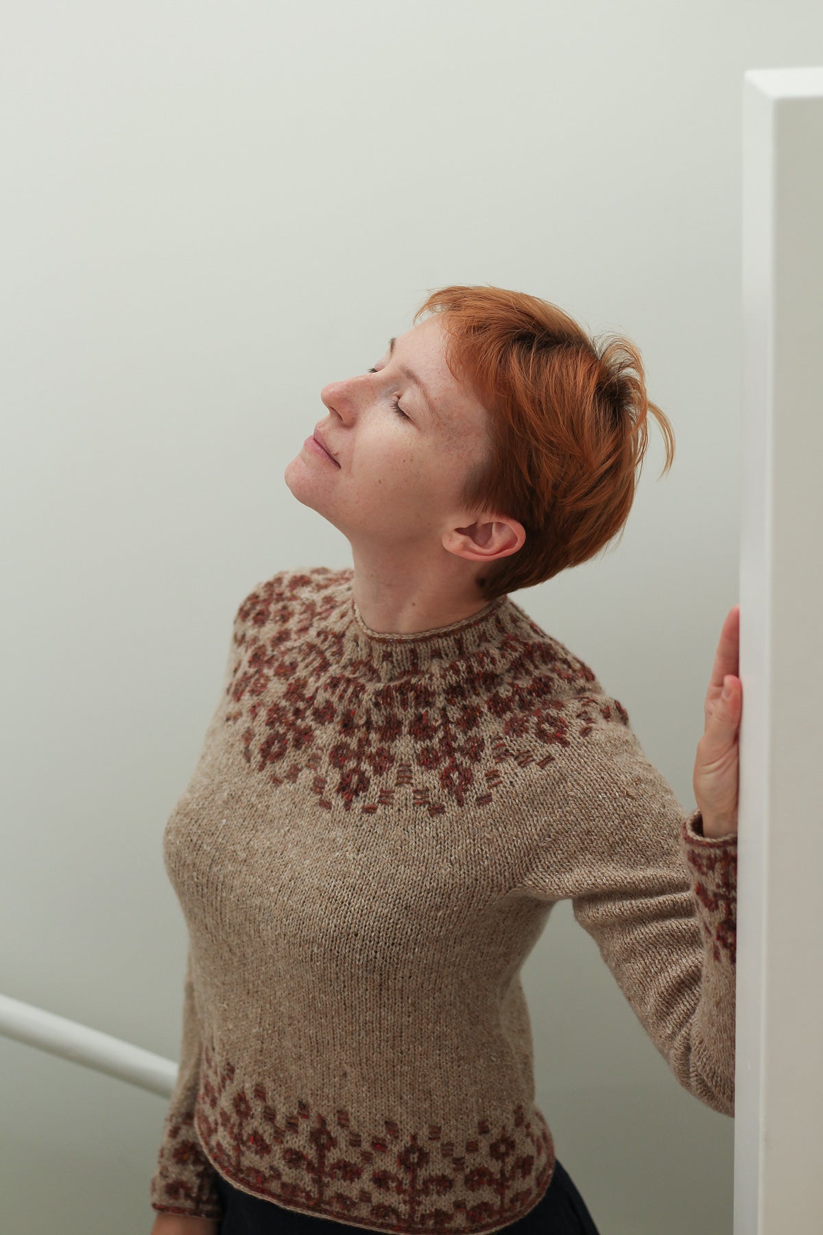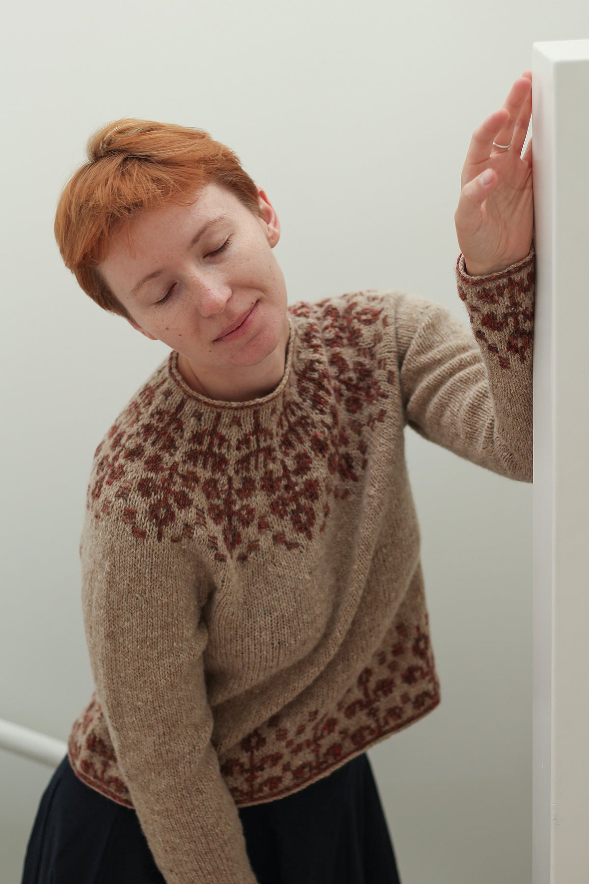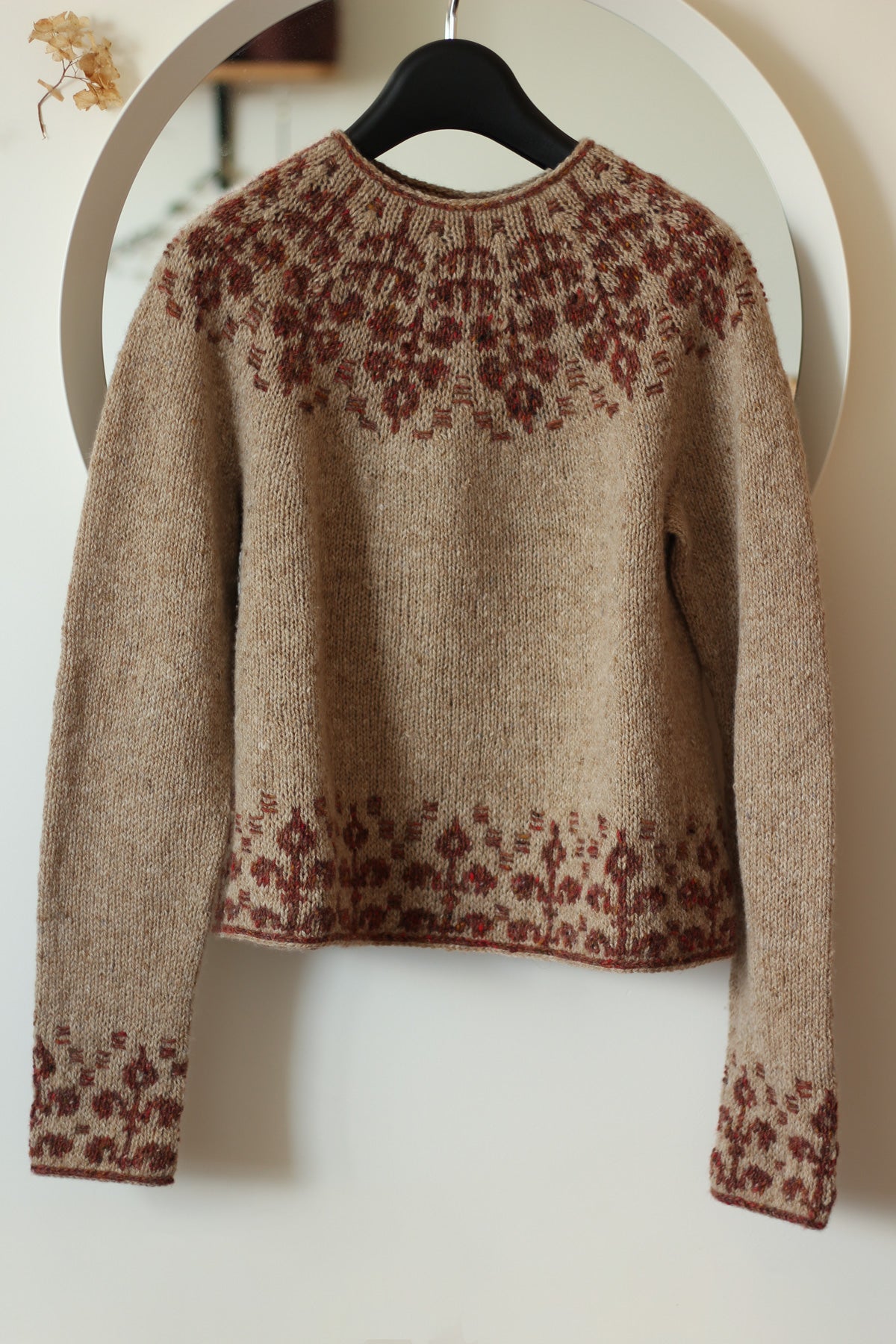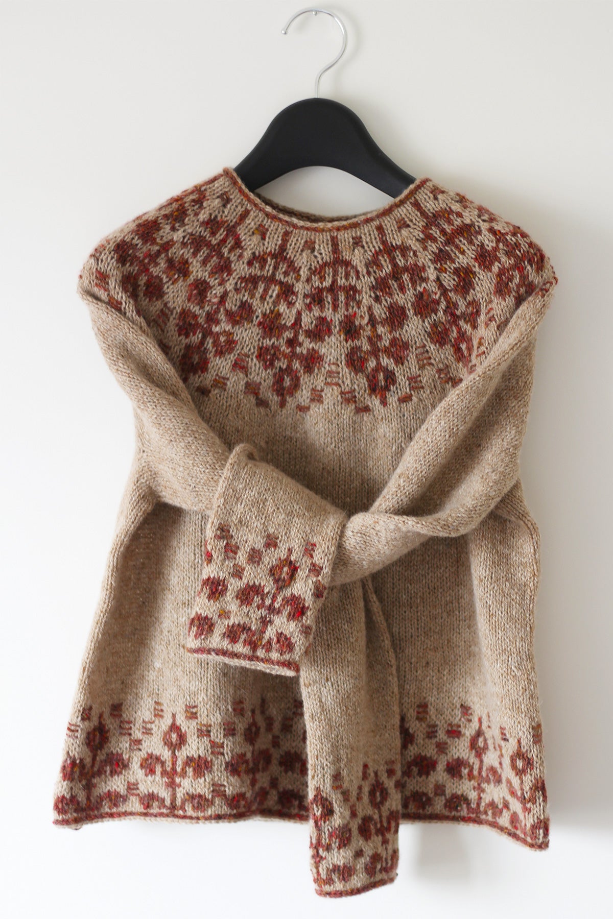 It is a modern round yoke pullover with slightly A-line shaped body and long sleeves, featuring a floral stranded colour work pattern with floats of contrasting colour on the right side on the yoke, hem and cuffs. The pullover is worked bottom up in the round.