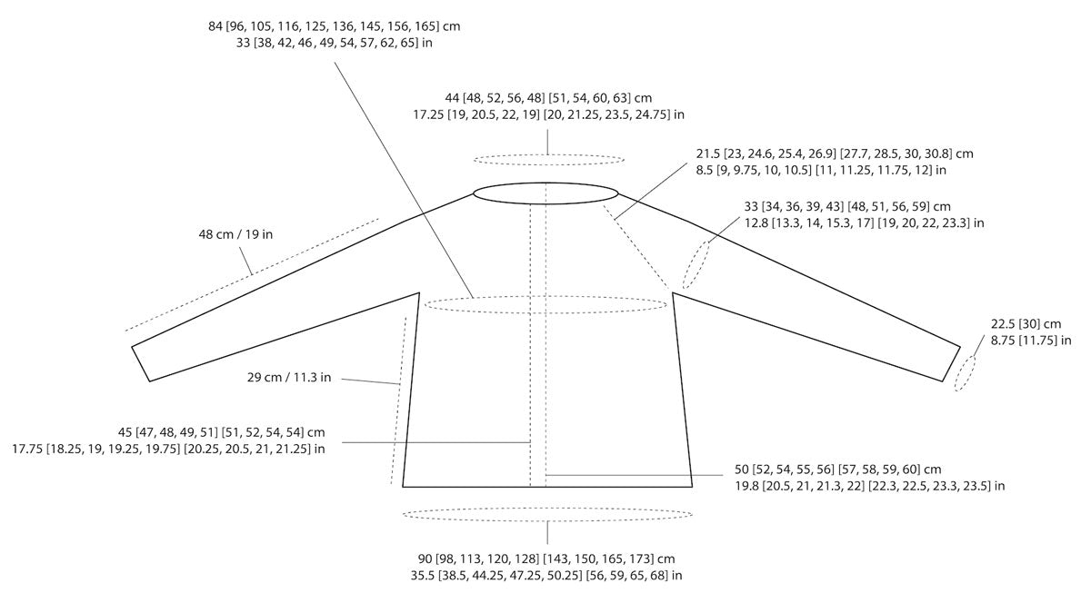 The pattern is written for nine sizes to fit 74 (84, 94, 104, 114) (124, 134, 144, 154) cm // 29 (33, 37, 41, 45) (49, 53, 57, 61) in bust circumference with ca. 8-13 cm (3-5 in) of positive ease.