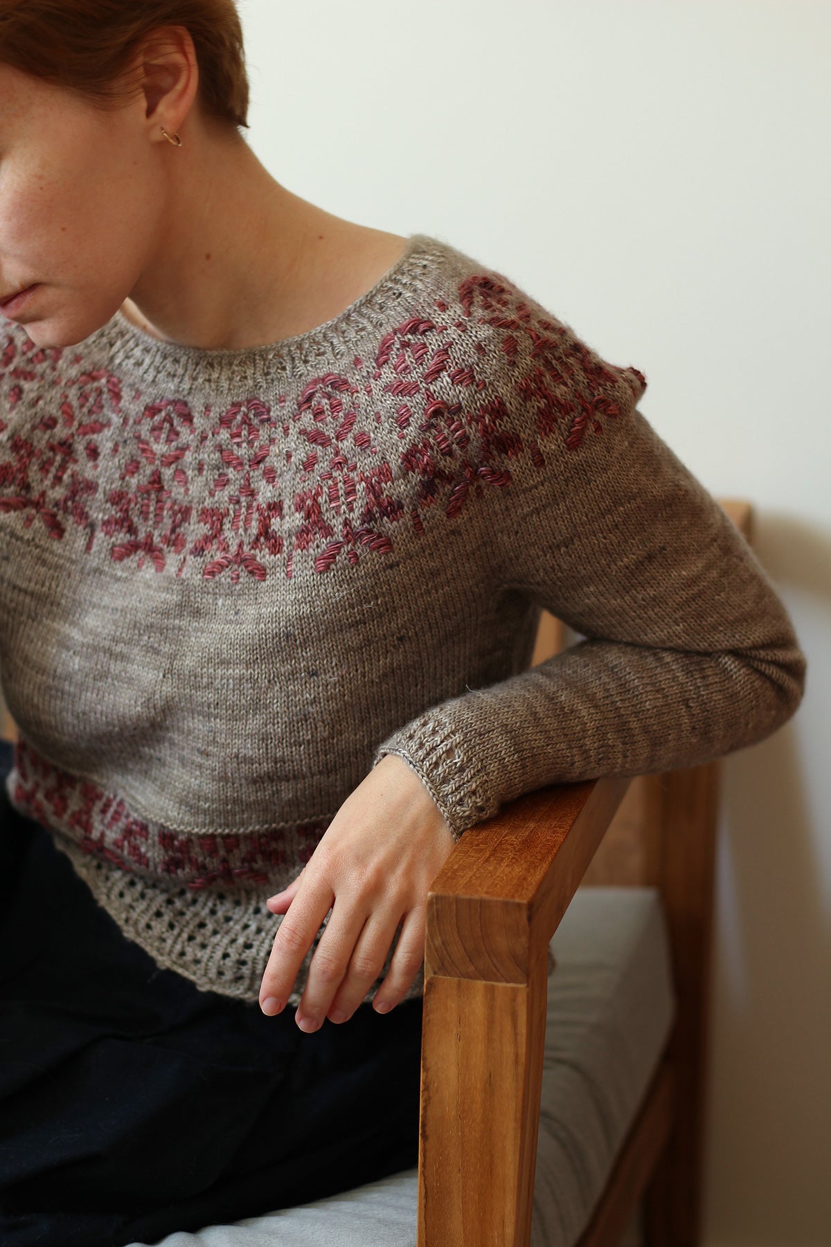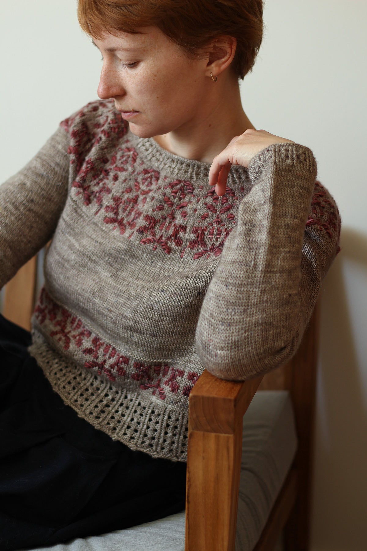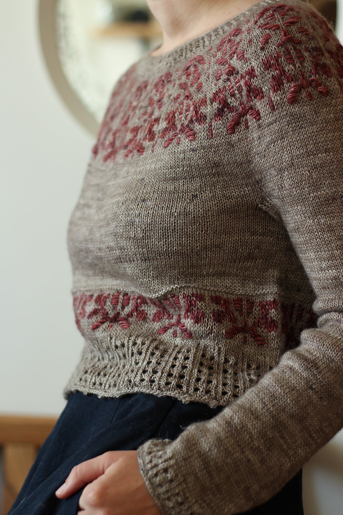 I designed a light cropped pullover using a fingering weight mix of merino wool with linen, with a round yoke with floral stranded colourwork featuring a pattern of floats on the right side and a delicate lace trimming along the neck, cuffs and hem. The pullover is worked top down in the round.