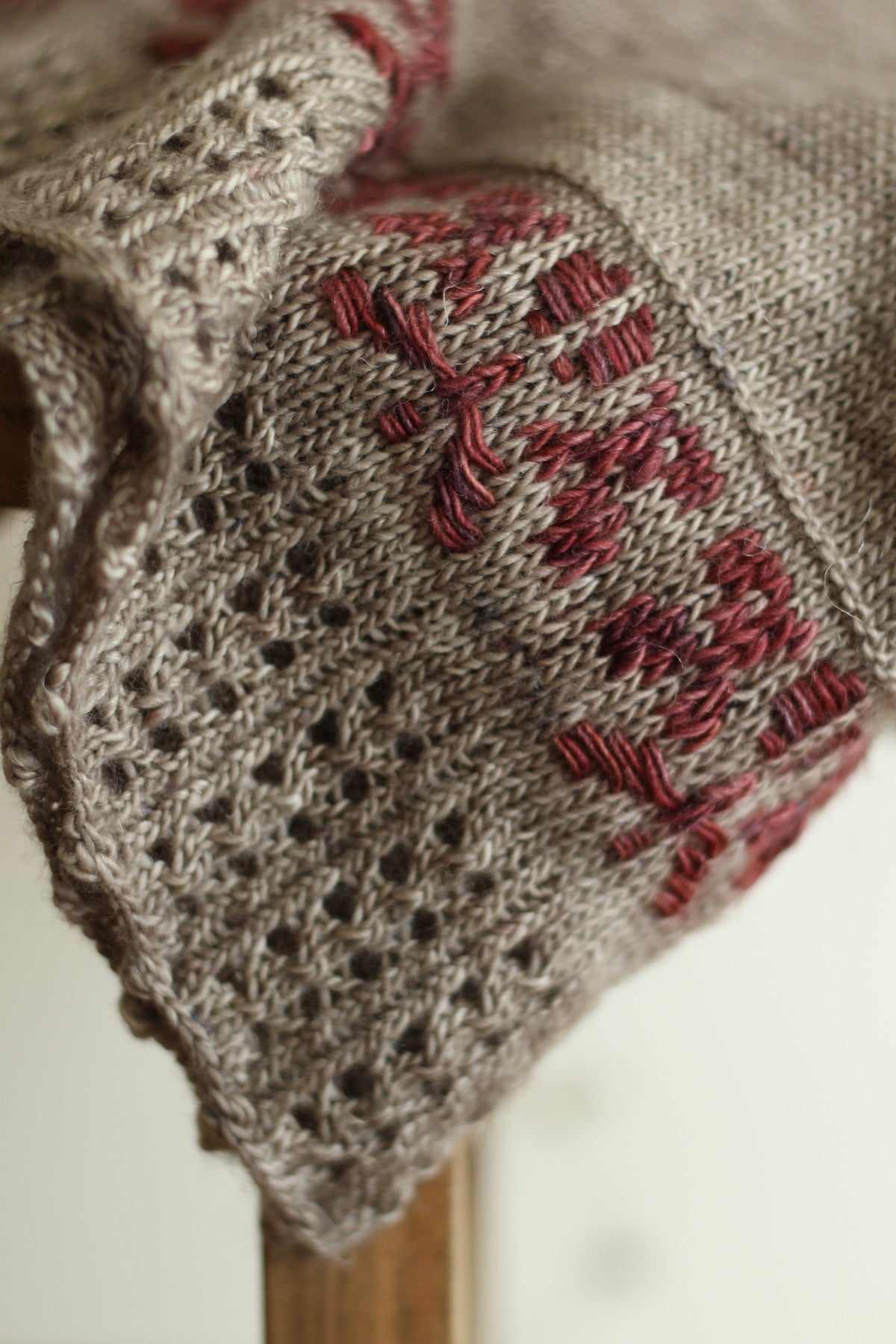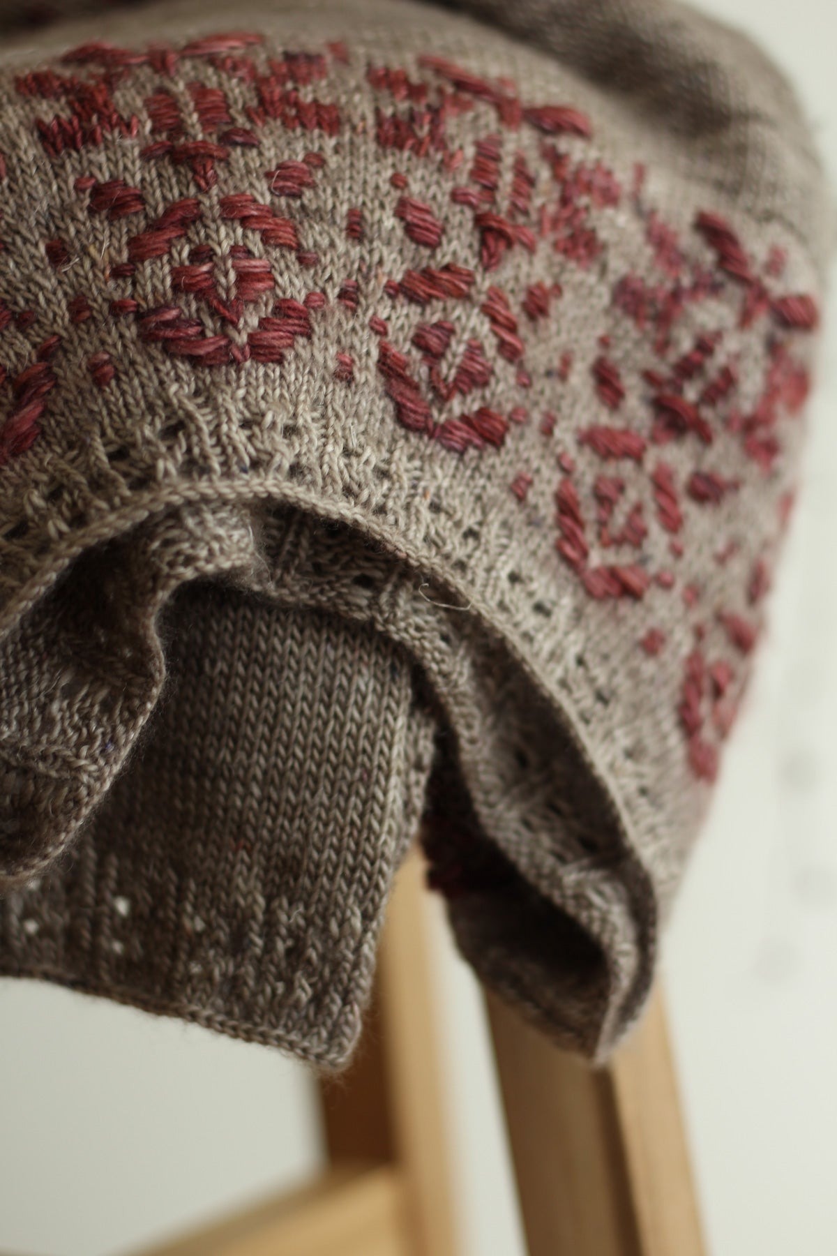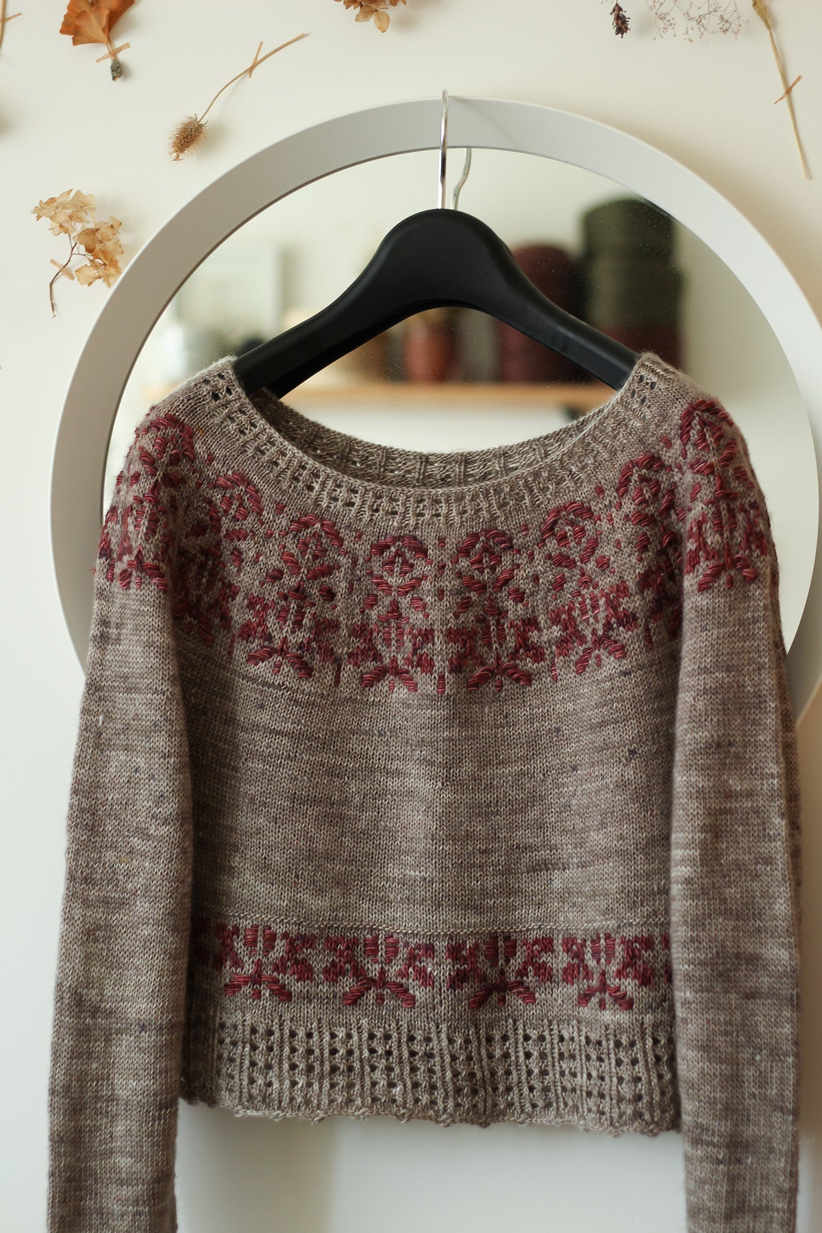 I designed a light cropped pullover using a fingering weight mix of merino wool with linen, with a round yoke with floral stranded colourwork featuring a pattern of floats on the right side and a delicate lace trimming along the neck, cuffs and hem. The pullover is worked top down in the round.