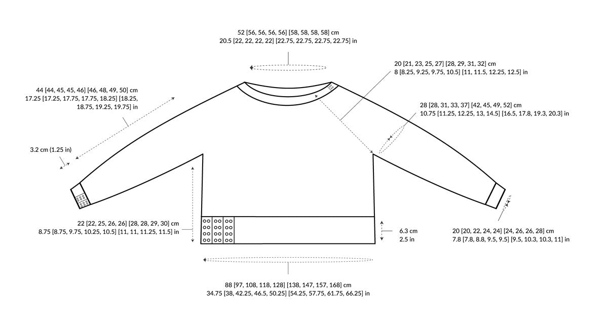 The pattern is written for nine sizes to fit 74 (84, 94, 104, 114) (124, 134, 144, 154) cm // 29 (33, 37, 41, 45) (49, 53, 57, 61) in bust circumference with ca. 13-14 cm (5-5.75 in) of positive ease.