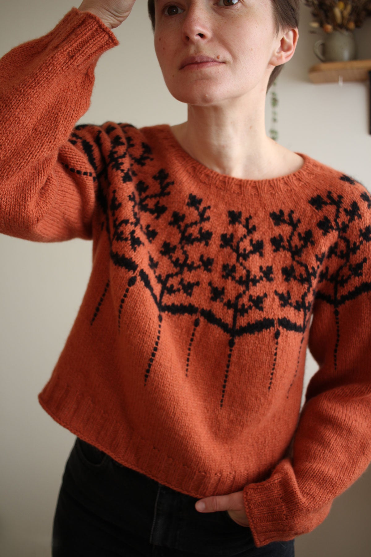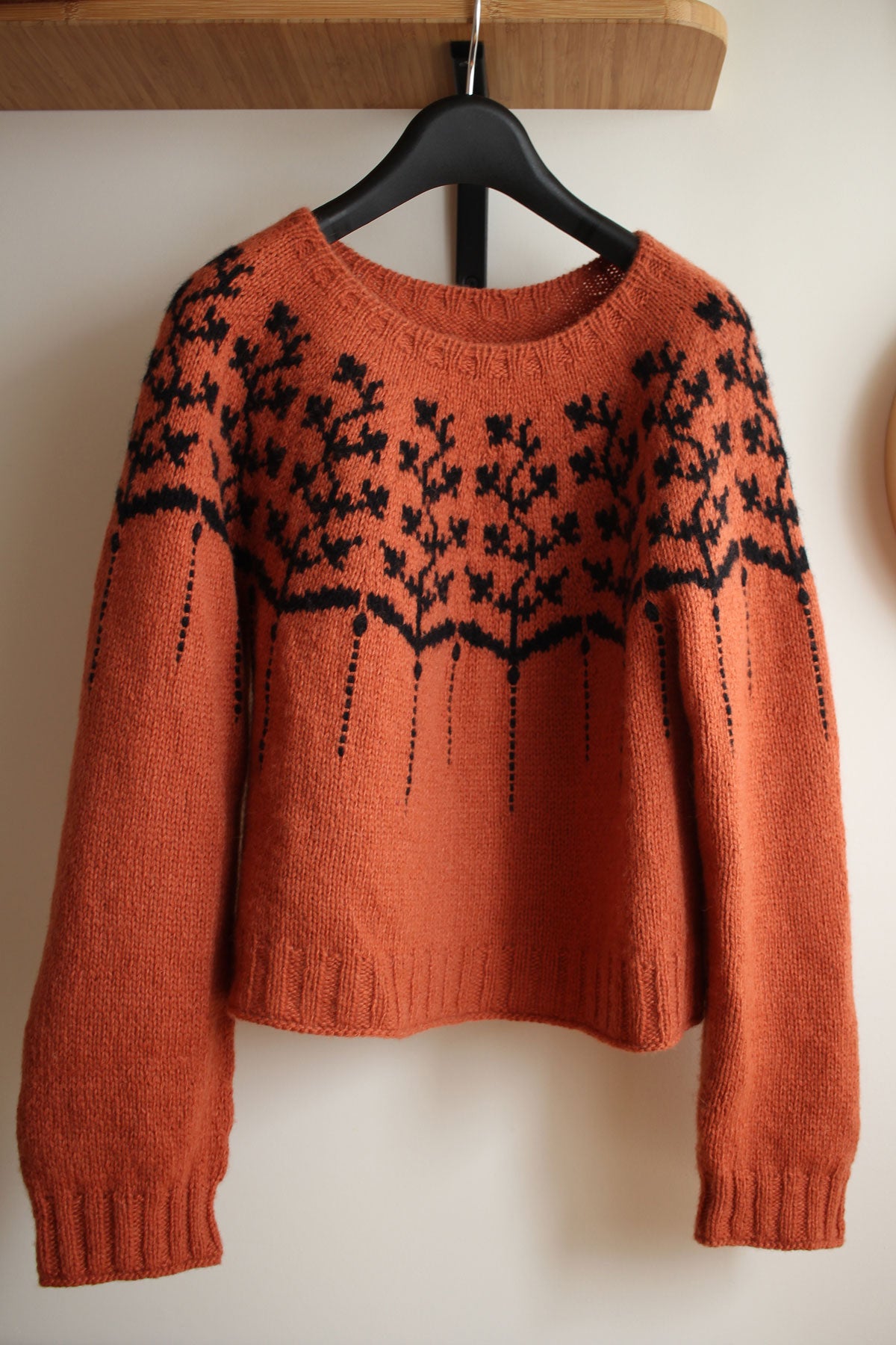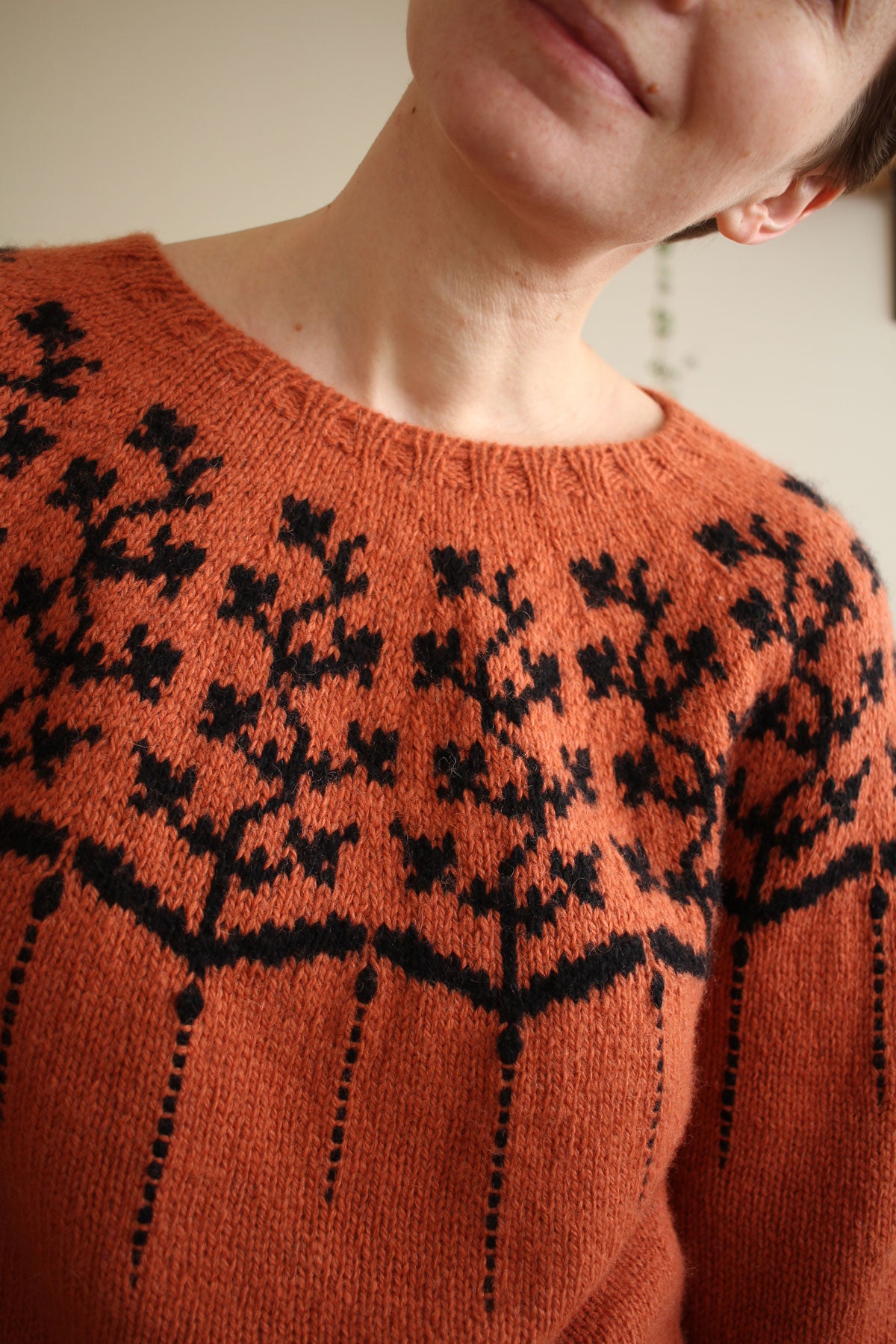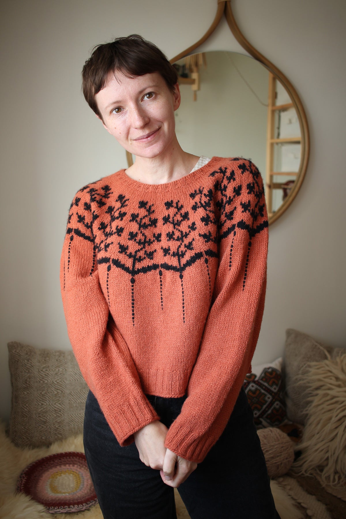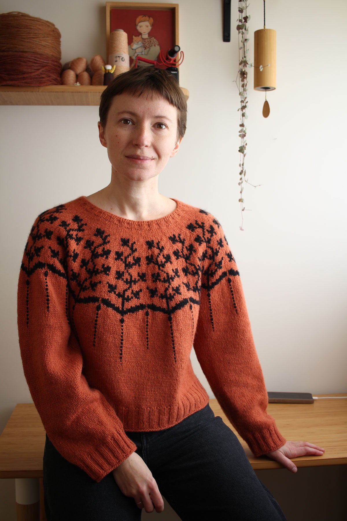 The design features an interesting cast-on method, which imitates tubular cast-on and transitions into 2x2 ribbing. Moreover, the bottom of the yoke is decorated with the woven in “root-like” elements, which can be extended all the way to the body. Video tutorials for both the cast-on and decorative elements are provided.