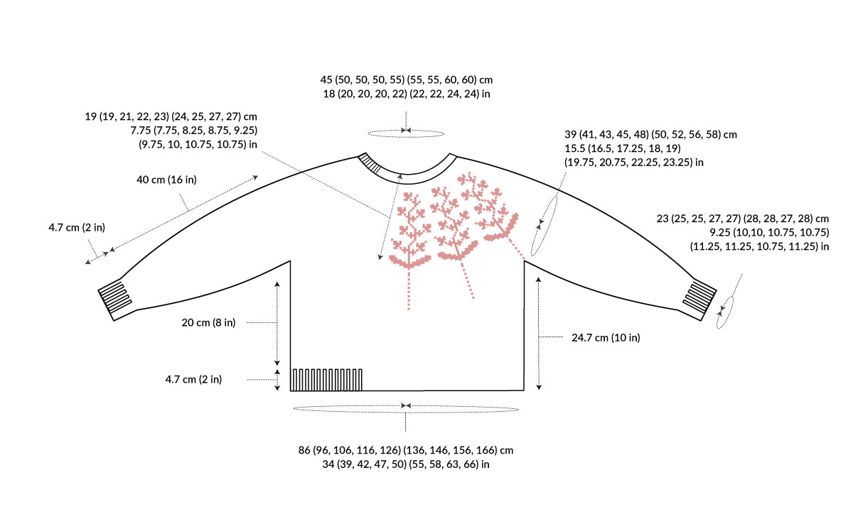 The pattern is written for nine sizes 1 (2, 3, 4, 5) (6, 7, 8, 9) with a finished bust circumference of ca. 86 (96, 106, 116, 126) (136, 146, 156, 166) cm // 34 (39, 42, 47, 50) (55, 58, 63, 66) in incl. ca. 10 cm (4 in) of the recommended positive ease.