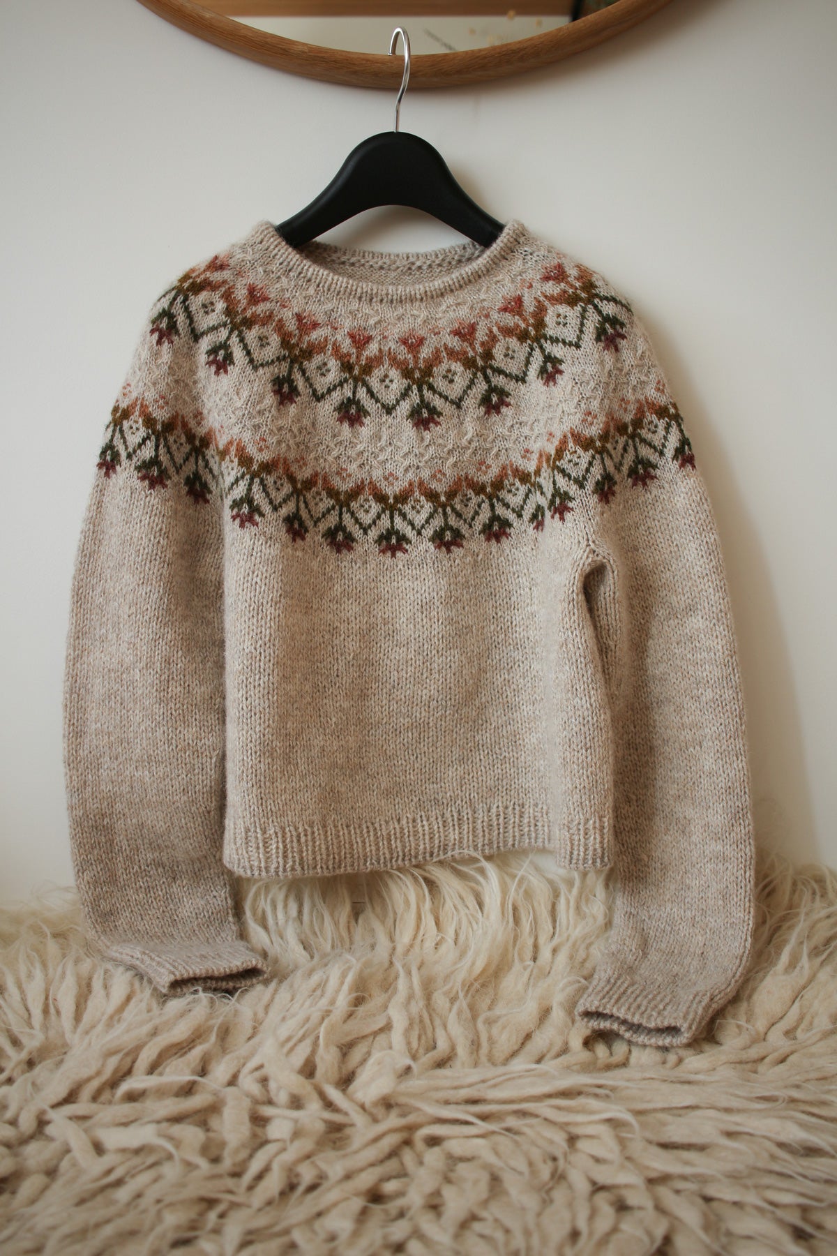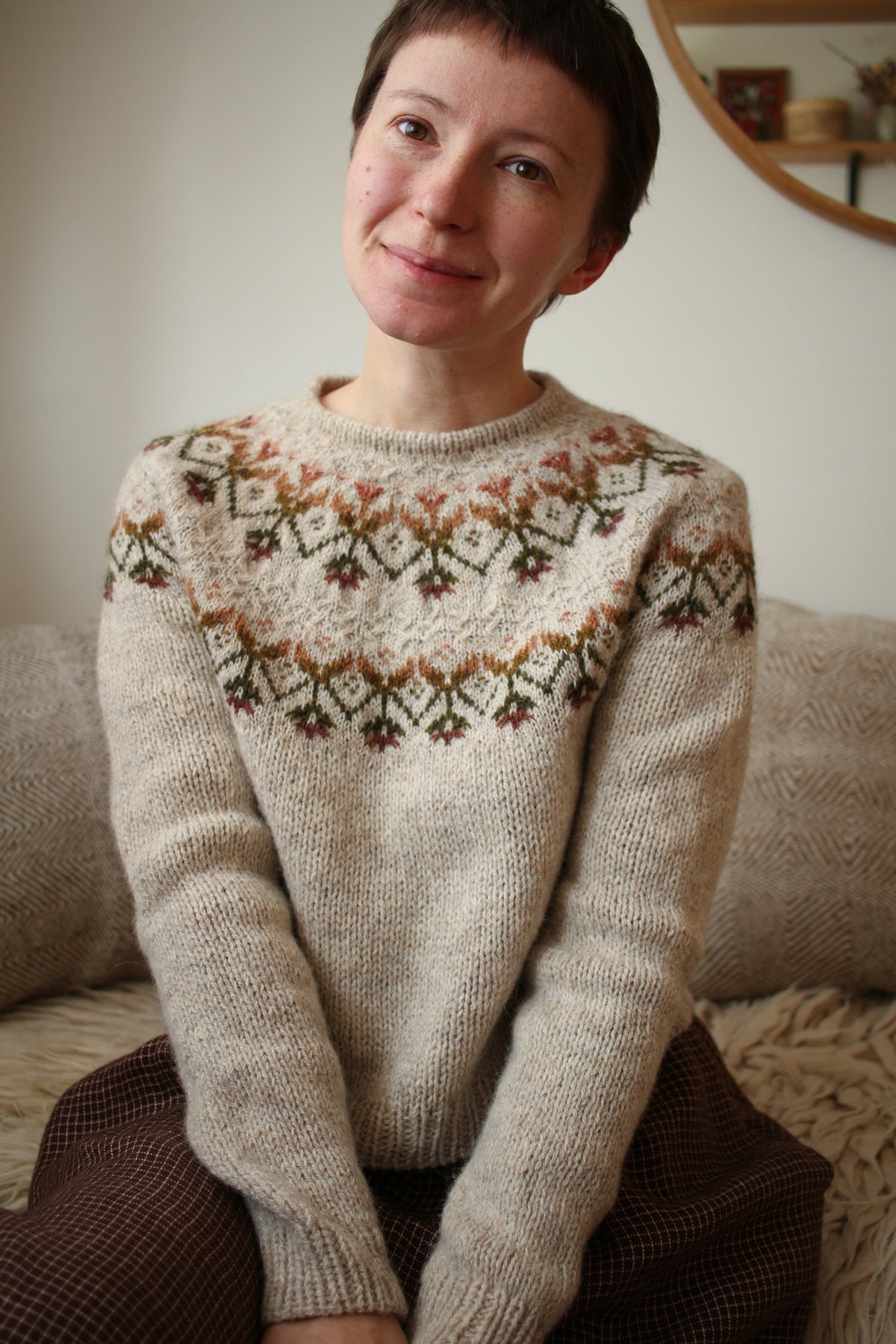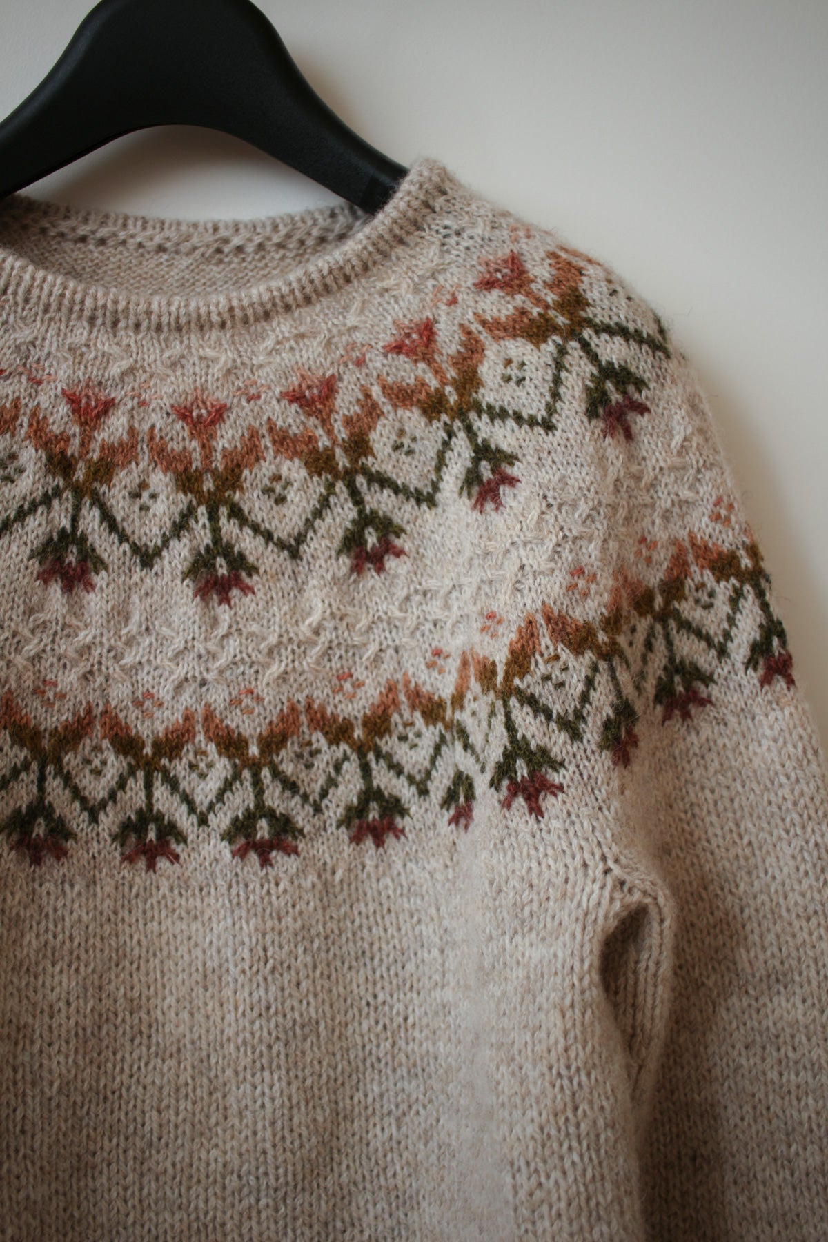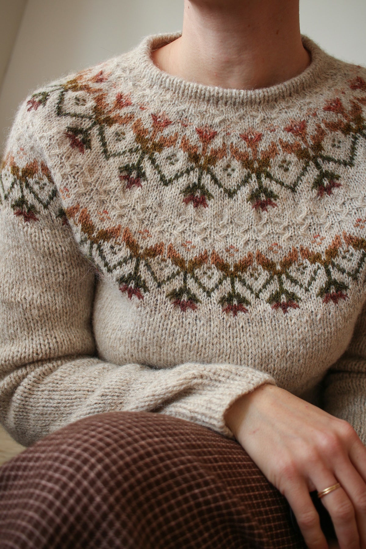 Kvit takes its name from the Ukrainian word kvitka, meaning “flower” — an inspiration that couldn’t be more fitting. Designed in the depths of grey winter, the pullover reflects my longing for spring and colour. The colourwork pattern combines stranded and inlay colourwork and crossed stitches. And the contrast between delicate yoke and more chunky body adds extra depth to the design.