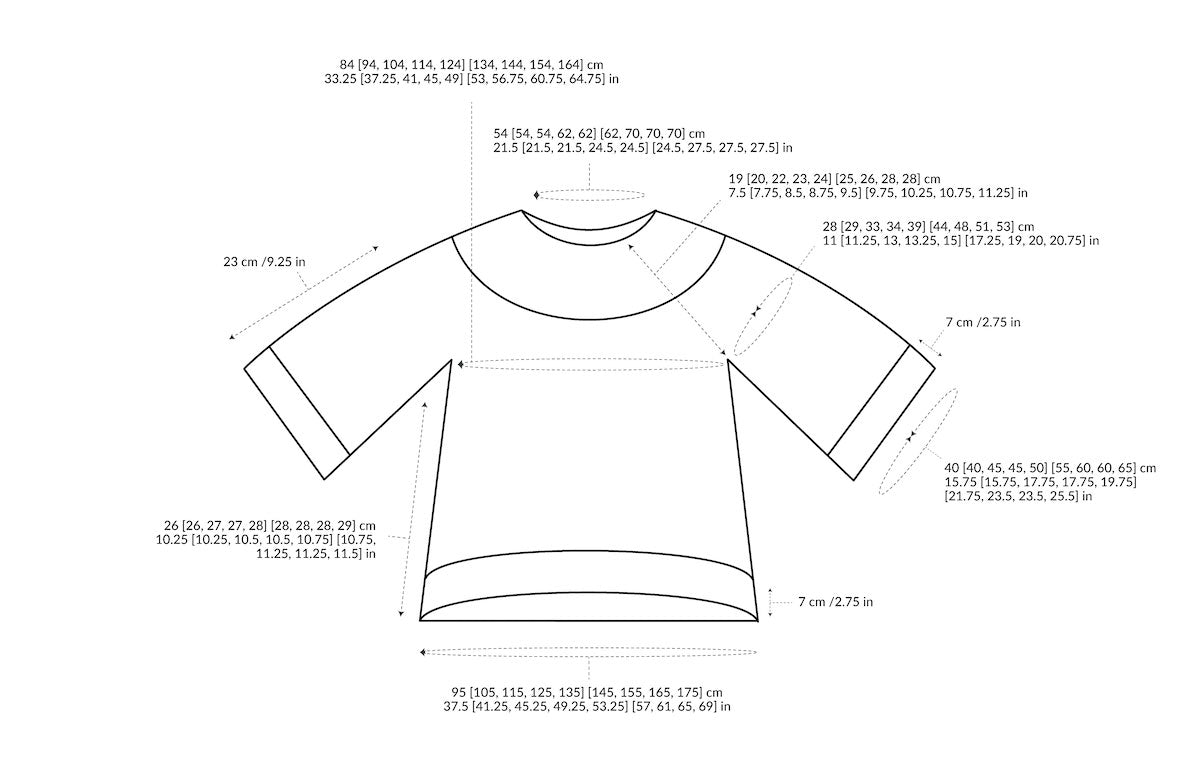 The pattern is written for nine sizes 1 (2, 3, 4, 5) (6, 7, 8, 9) to fit 74 (84, 94, 104, 114) (124, 134, 144, 154) cm // 29 (33, 37, 41, 45) (49, 53, 57, 61) in bust circumference with ca. 10 cm (4 in) of positive ease.