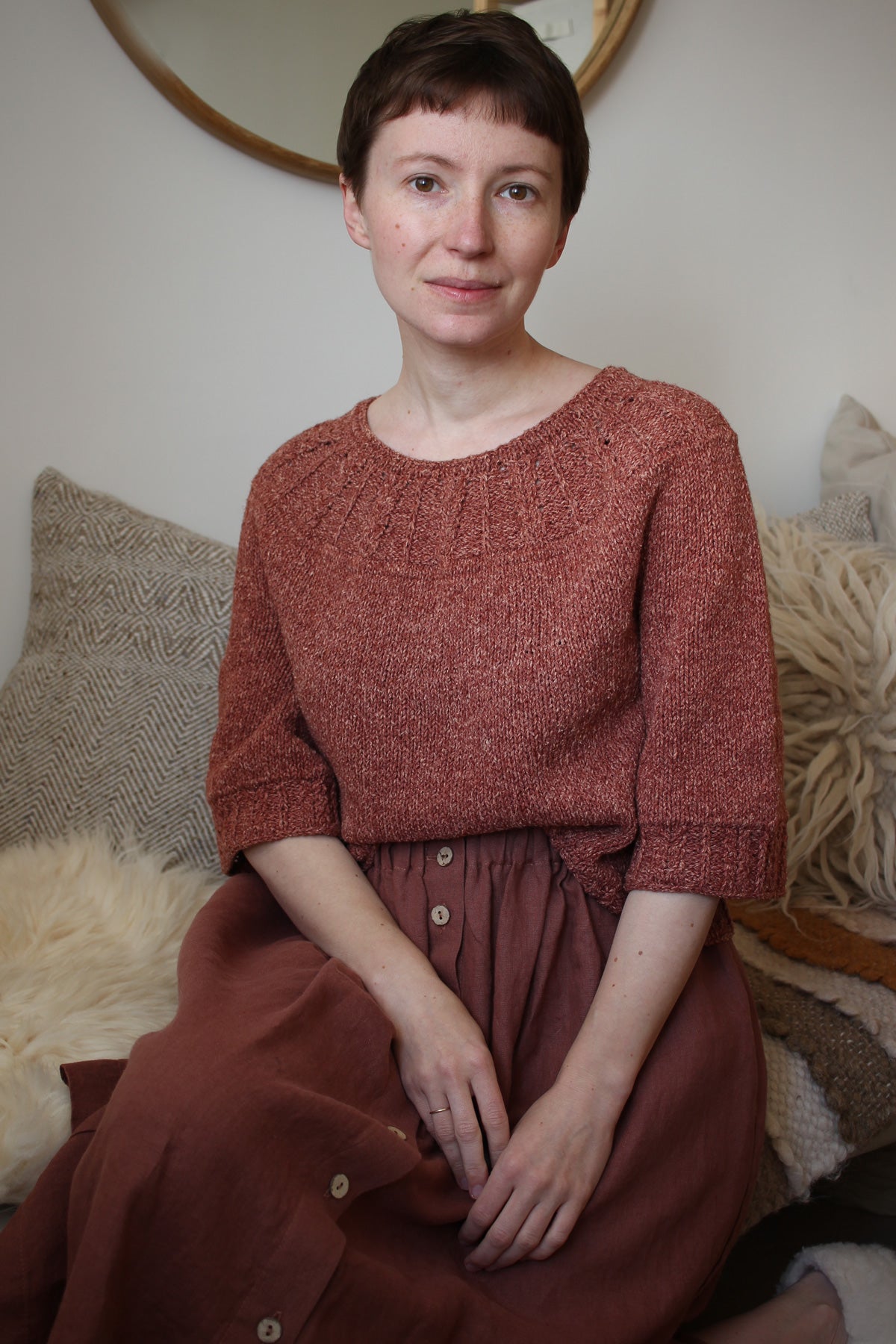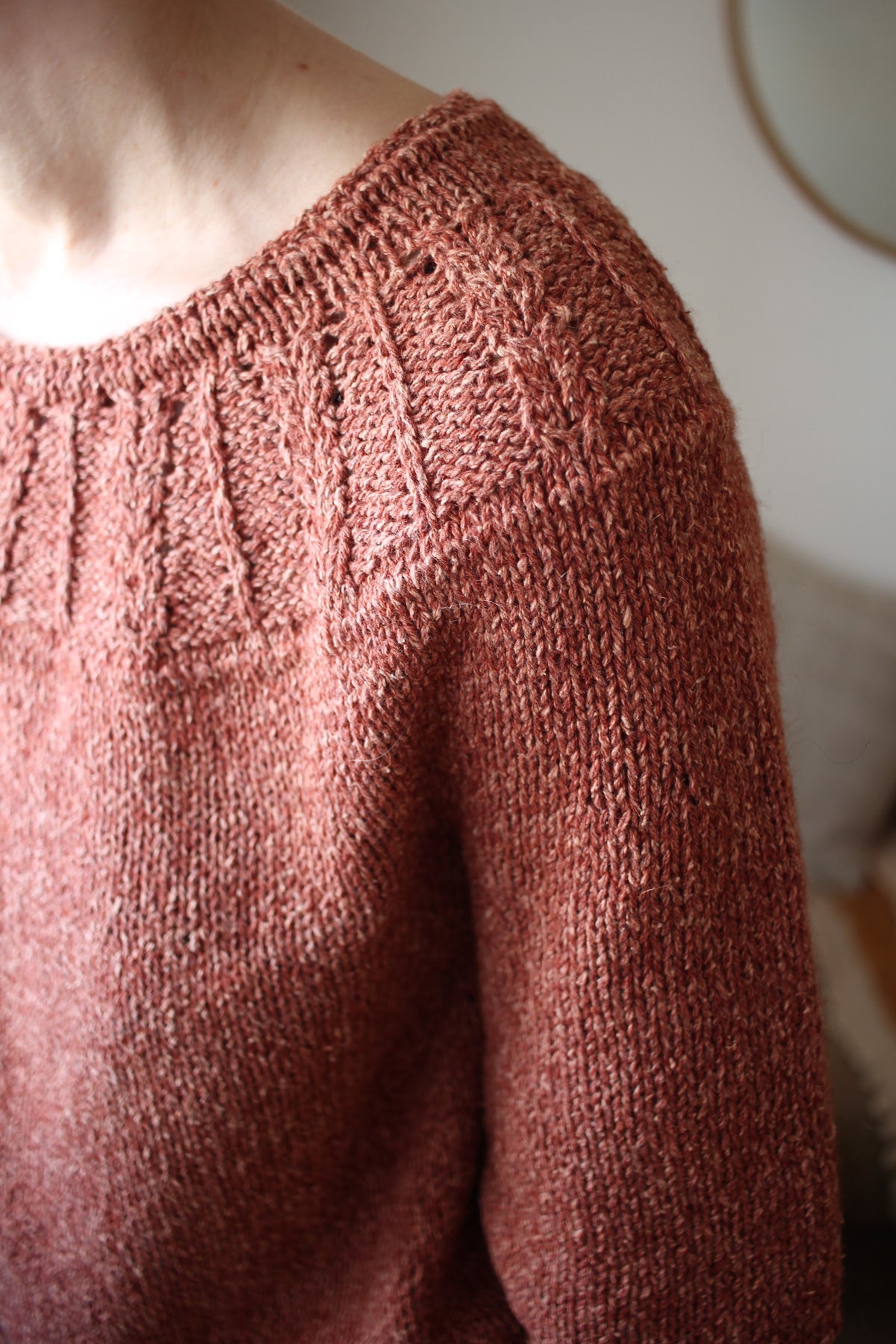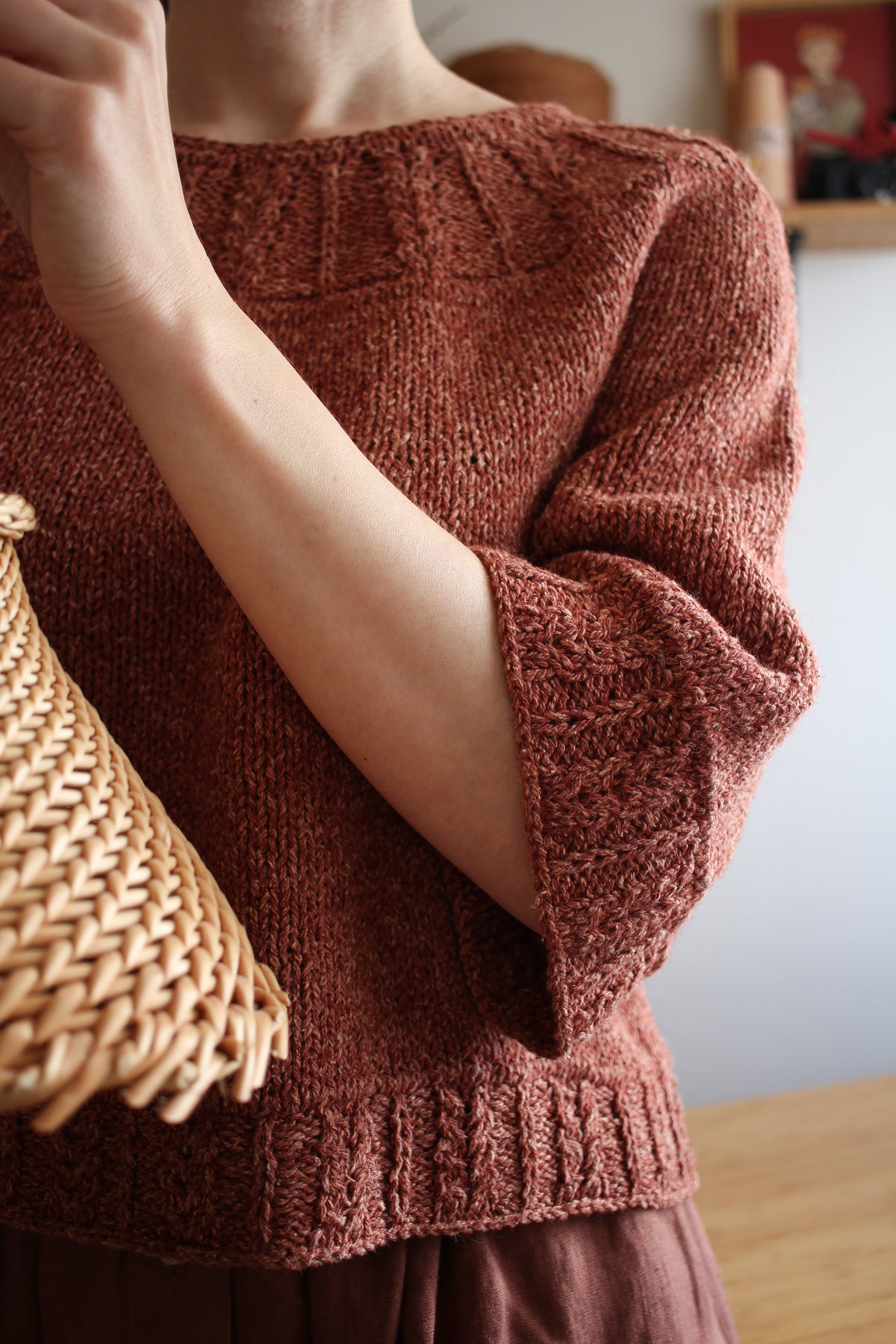 This round yoke pullover with 3/4 funnel sleeves, A-line shaped body and asymmetric hem line is worked top down in the round. The yoke, hem and cuffs are decorated with simple cables and slip stitch chains on the background of reverse stockinette stitch. Double knitted bands accentuate transitions between design elements throughout the garment.