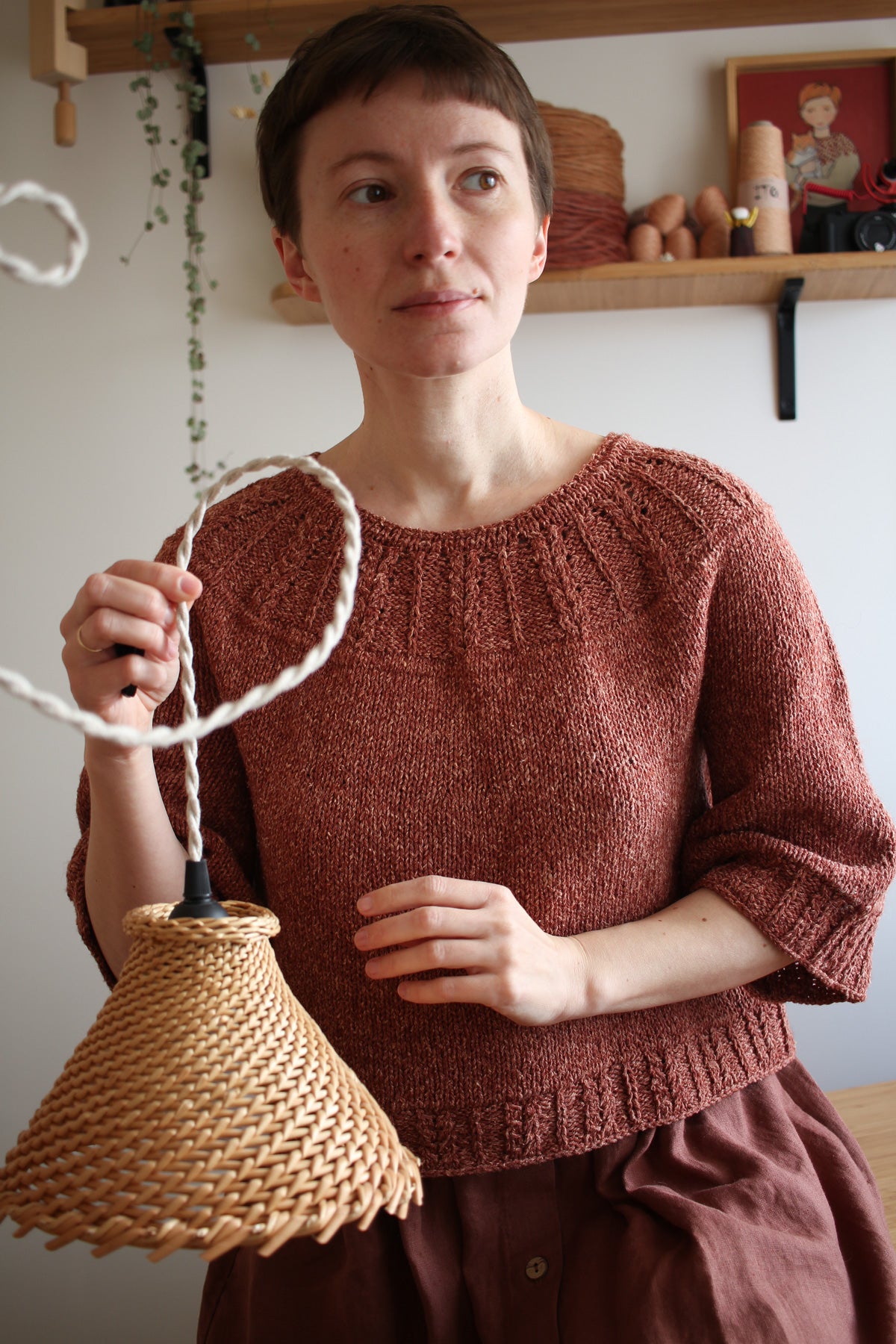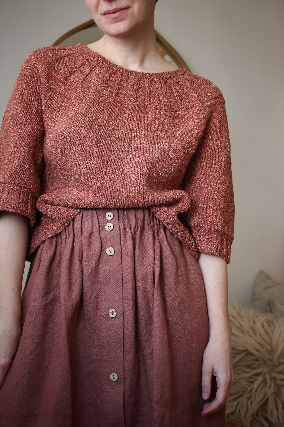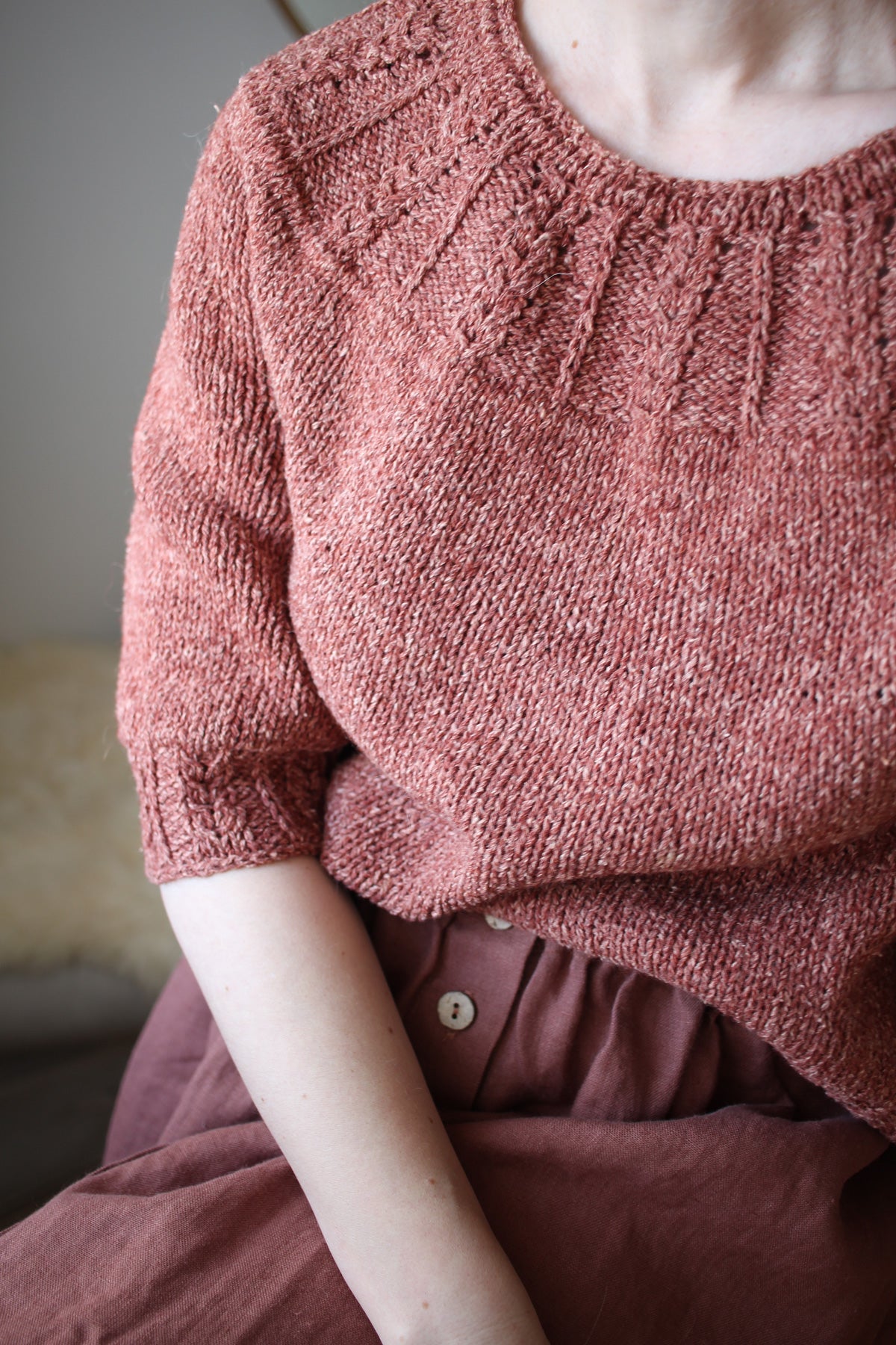 This round yoke pullover with 3/4 funnel sleeves, A-line shaped body and asymmetric hem line is worked top down in the round. The yoke, hem and cuffs are decorated with simple cables and slip stitch chains on the background of reverse stockinette stitch. Double knitted bands accentuate transitions between design elements throughout the garment.