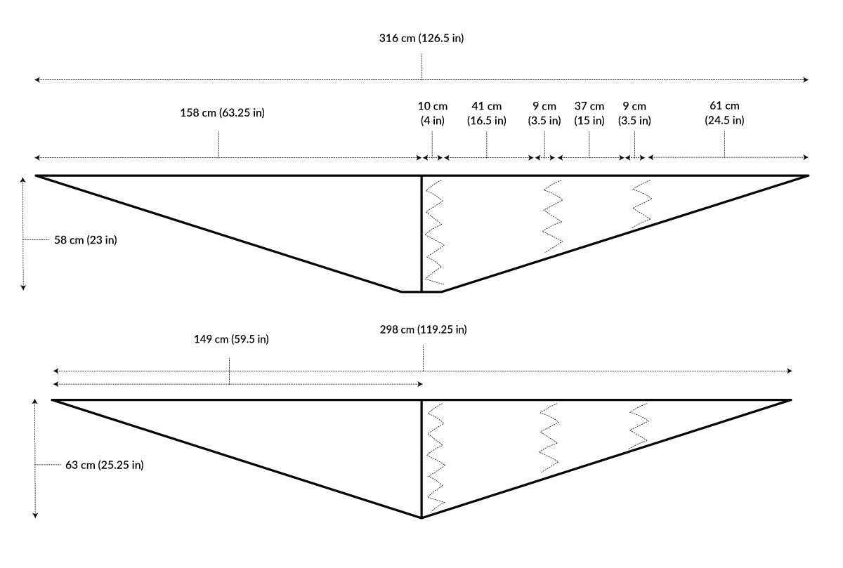 The pattern is written for one full size with the finished wingspan of ca. 316 cm (126.5 in) and depth (width) of ca. 58 cm (23 in) and an optional half size with ca. 158 cm (63.25 in) in length.