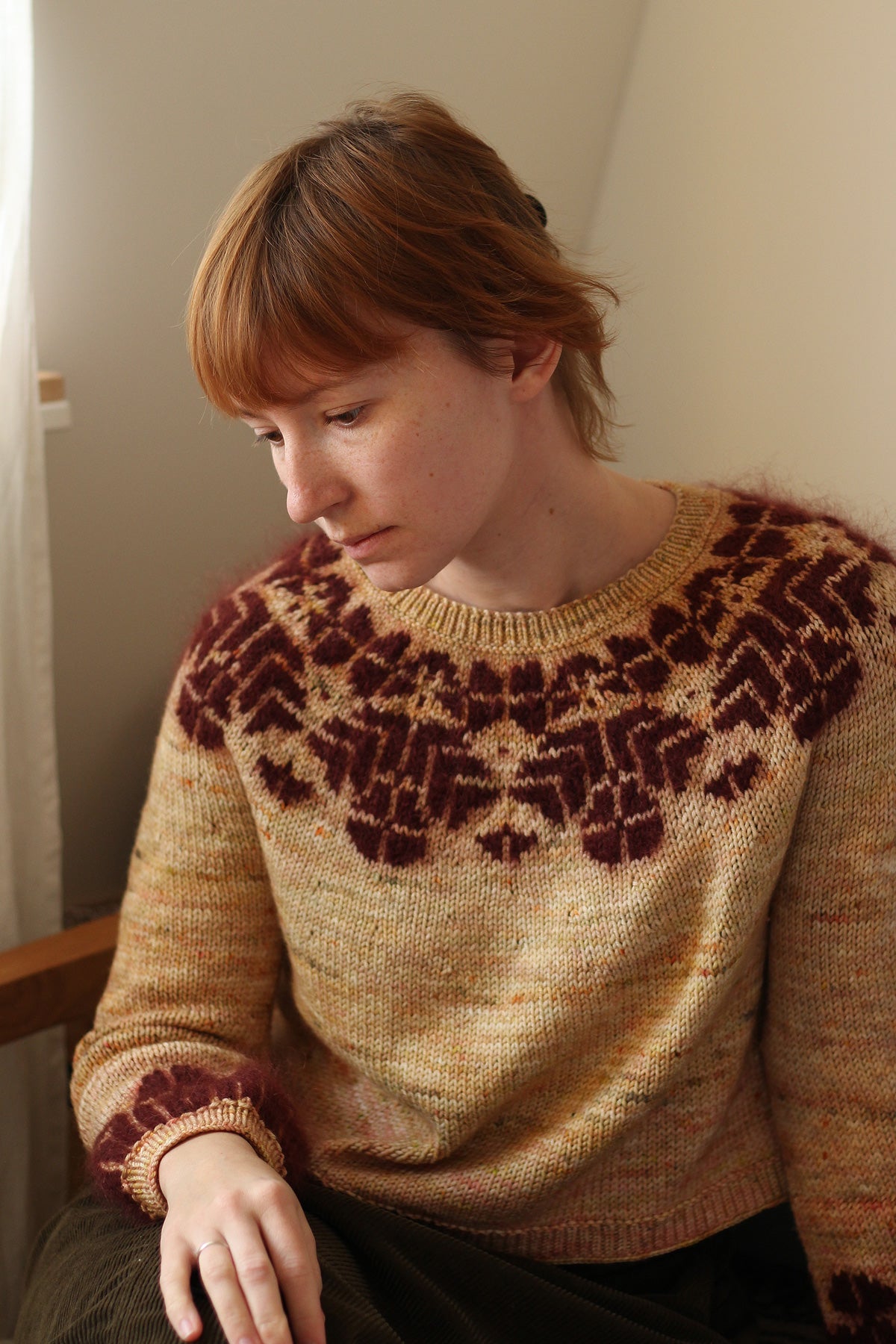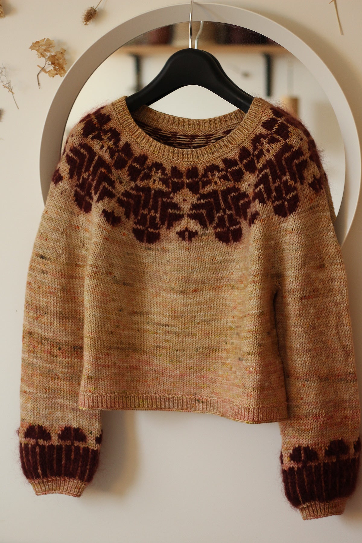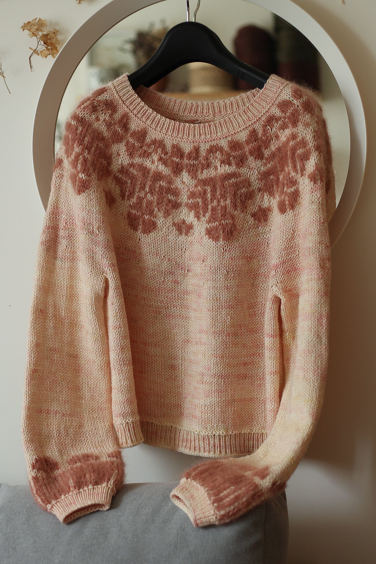 This romantic cropped pullover is worked top down in the round featuring floral stranded colourwork pattern in a soft fluffy mohair contrasting colour running across the round yoke and at the bottom of slightly puffy sleeves.