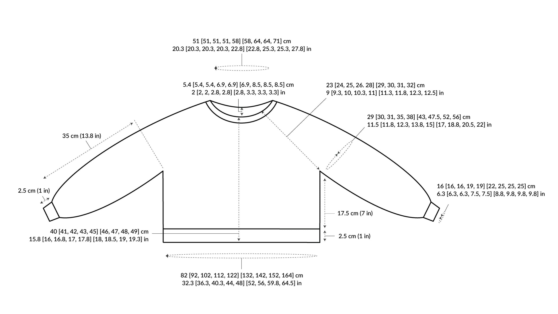 The pattern is written for nine sizes 1 (2, 3, 4, 5) (6, 7, 8, 9) to fit 74 (84, 94, 104, 114) (124, 134, 144, 154) cm // 29 (33, 37, 41, 45) (49, 53, 57, 61) in bust circumference with ca. 8 cm (3.25 in) of positive ease.