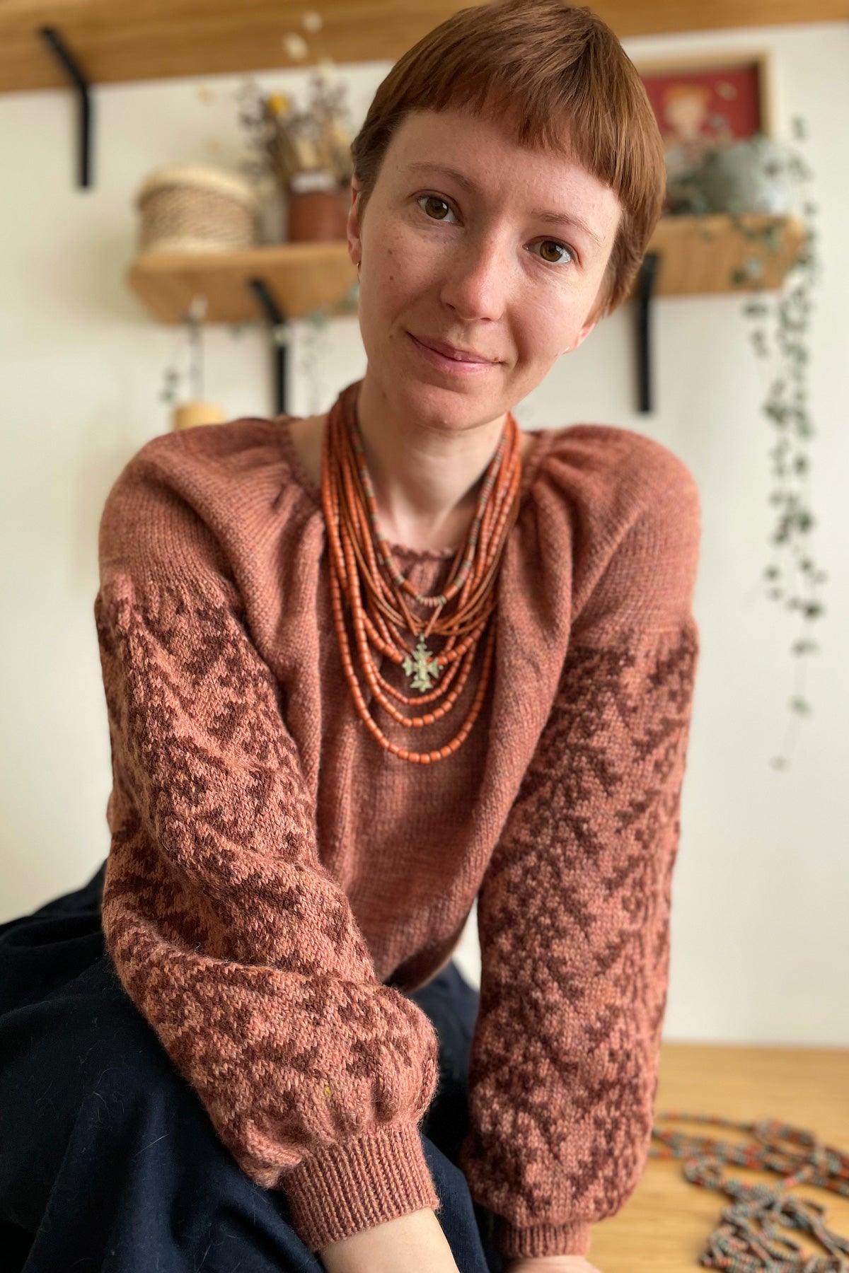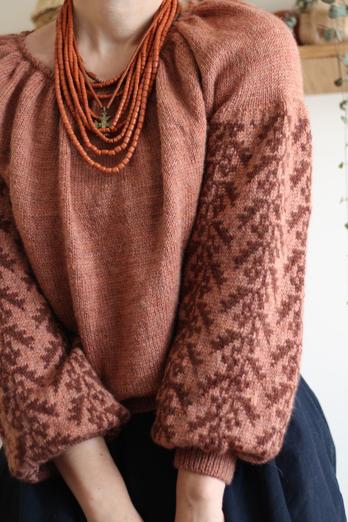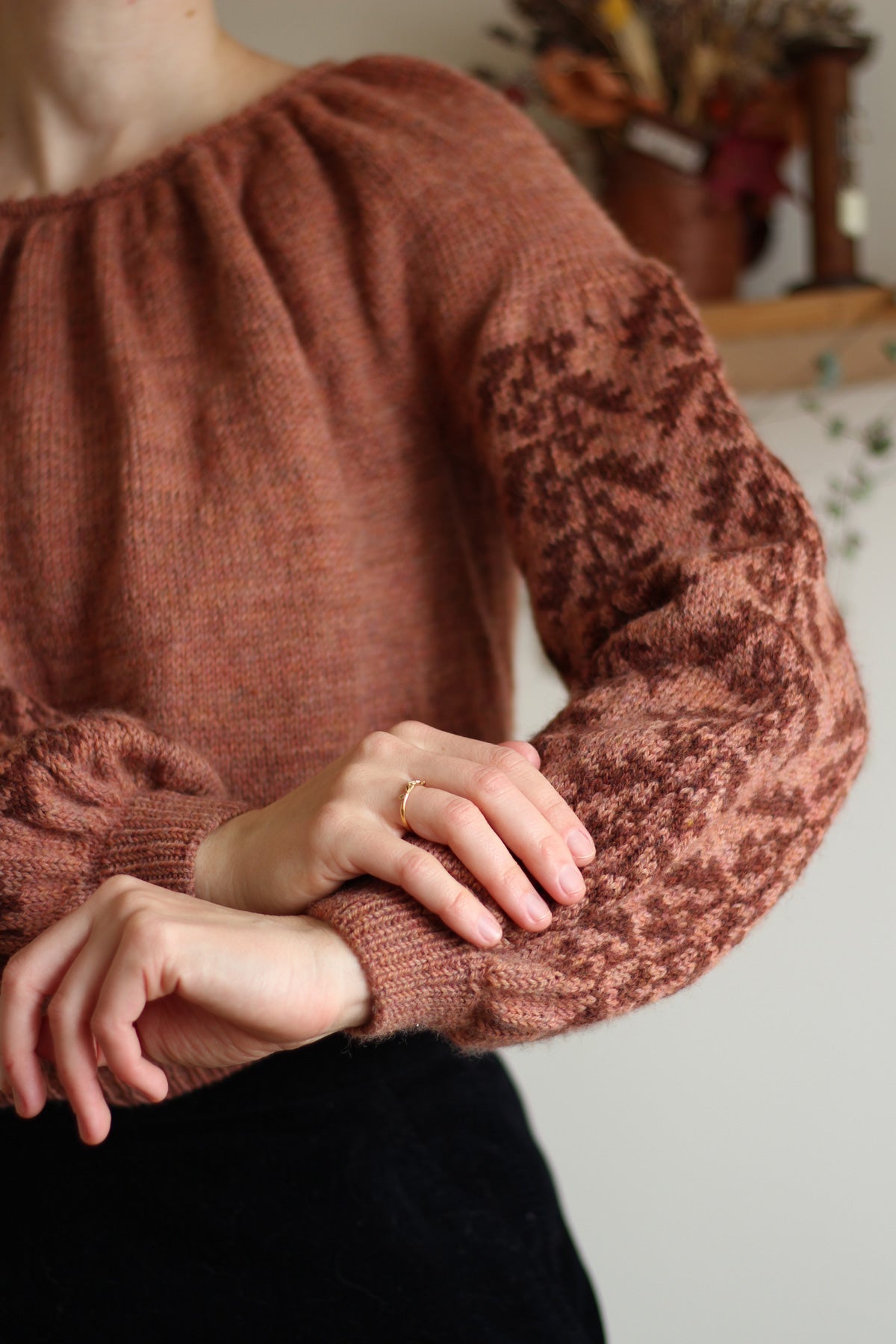 The blouse has a relaxed, slightly oversized fit with a bit of exaggerated wide sleeves. Both body and sleeves are worked top down in the round and gathered at the hem/cuffs. There is also an option to finish the body with a folded hem with picots.