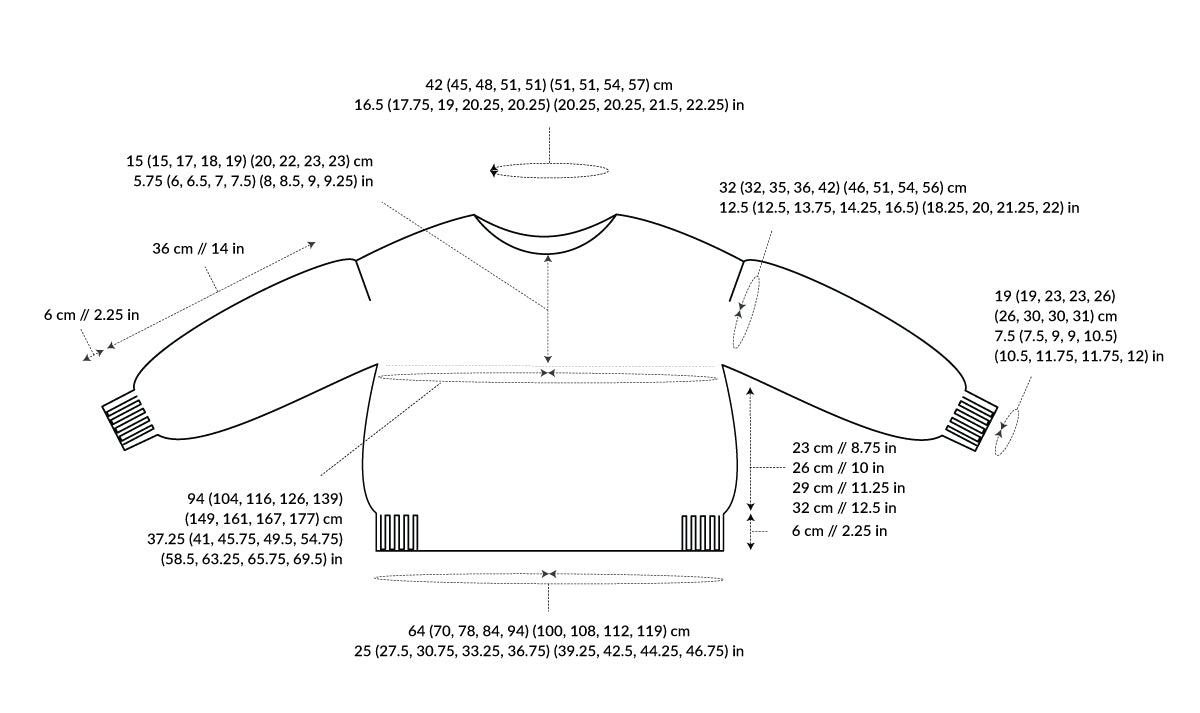 ca. 94 (104, 116, 126, 139) (149, 161, 167, 177) cm // 37.25 (41, 45.75, 49.5, 54.75) (58.5, 63.25, 65.75, 69.5) in incl. ca. 20 cm (8 in) of recommended positive ease.
