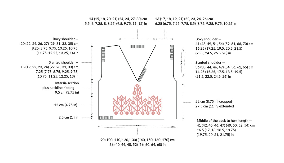 The pattern is written for nine sizes 1 (2, 3, 4, 5) (6, 7, 8, 9) with a finished bust circumference of ca. 90 (100, 110, 120, 130) (140, 150, 160, 170) cm // 36 (40, 44, 48, 52) (56, 60, 64, 68) in incl. at least 15-20 cm (6-8 in) of the recommended positive ease.