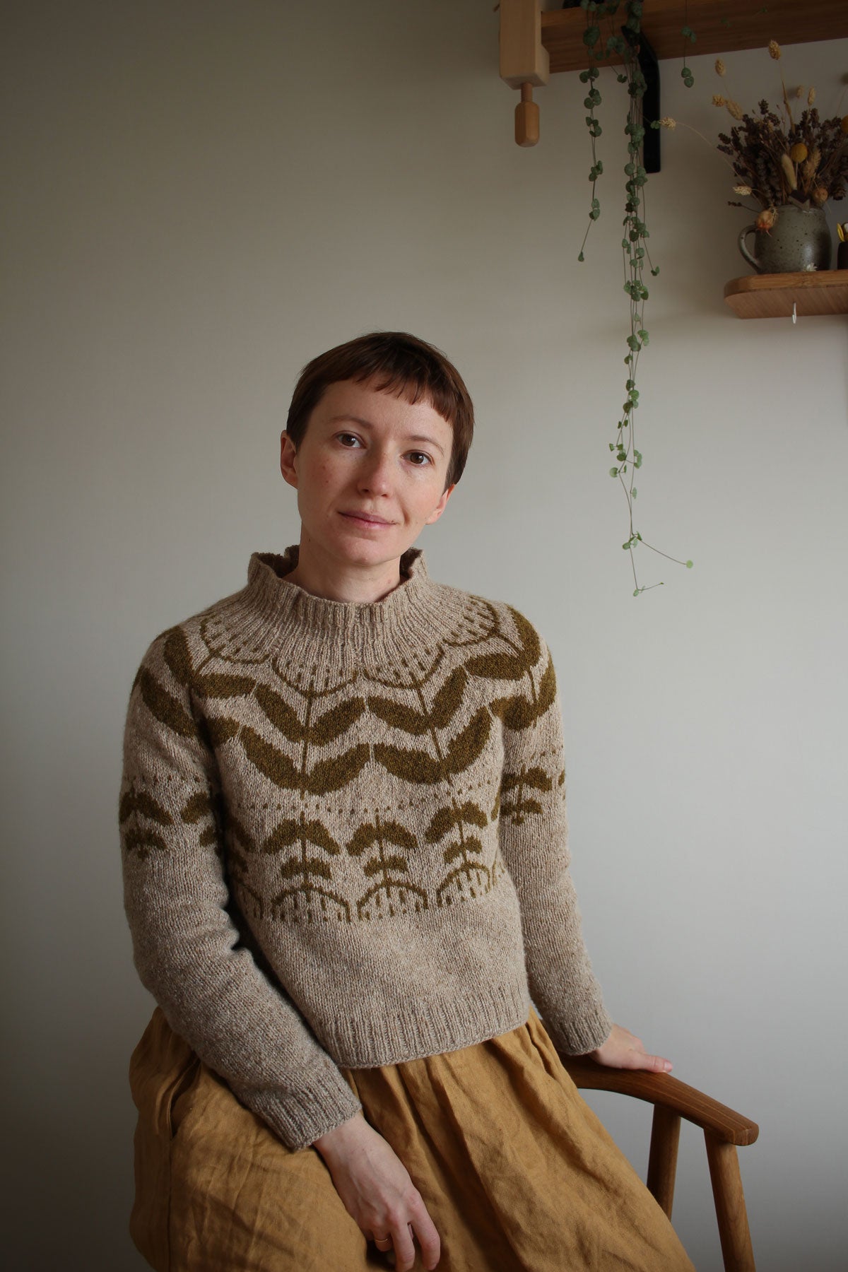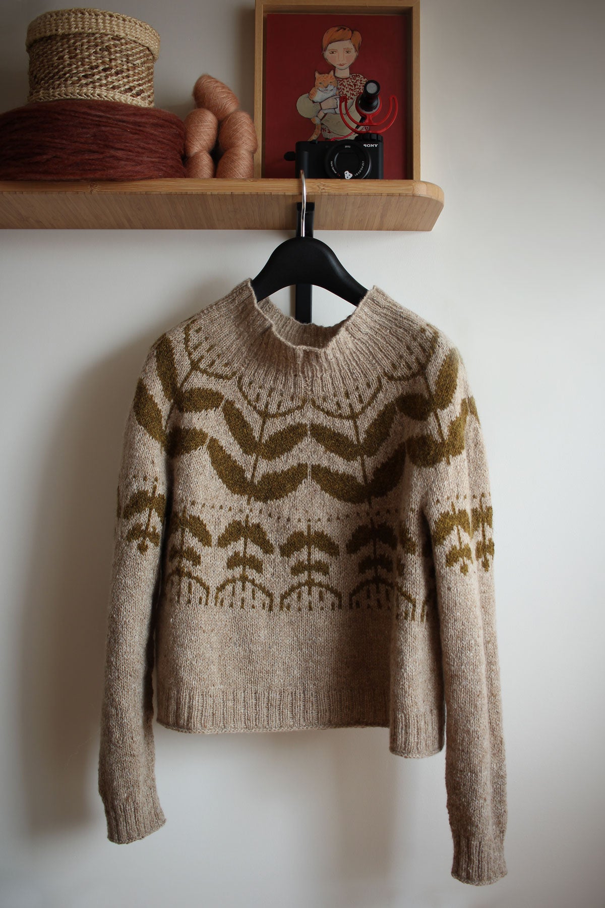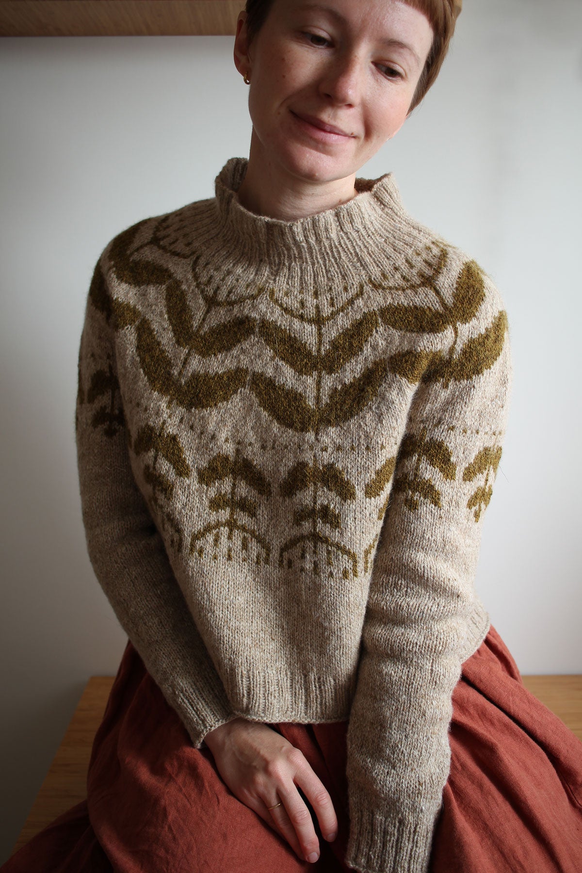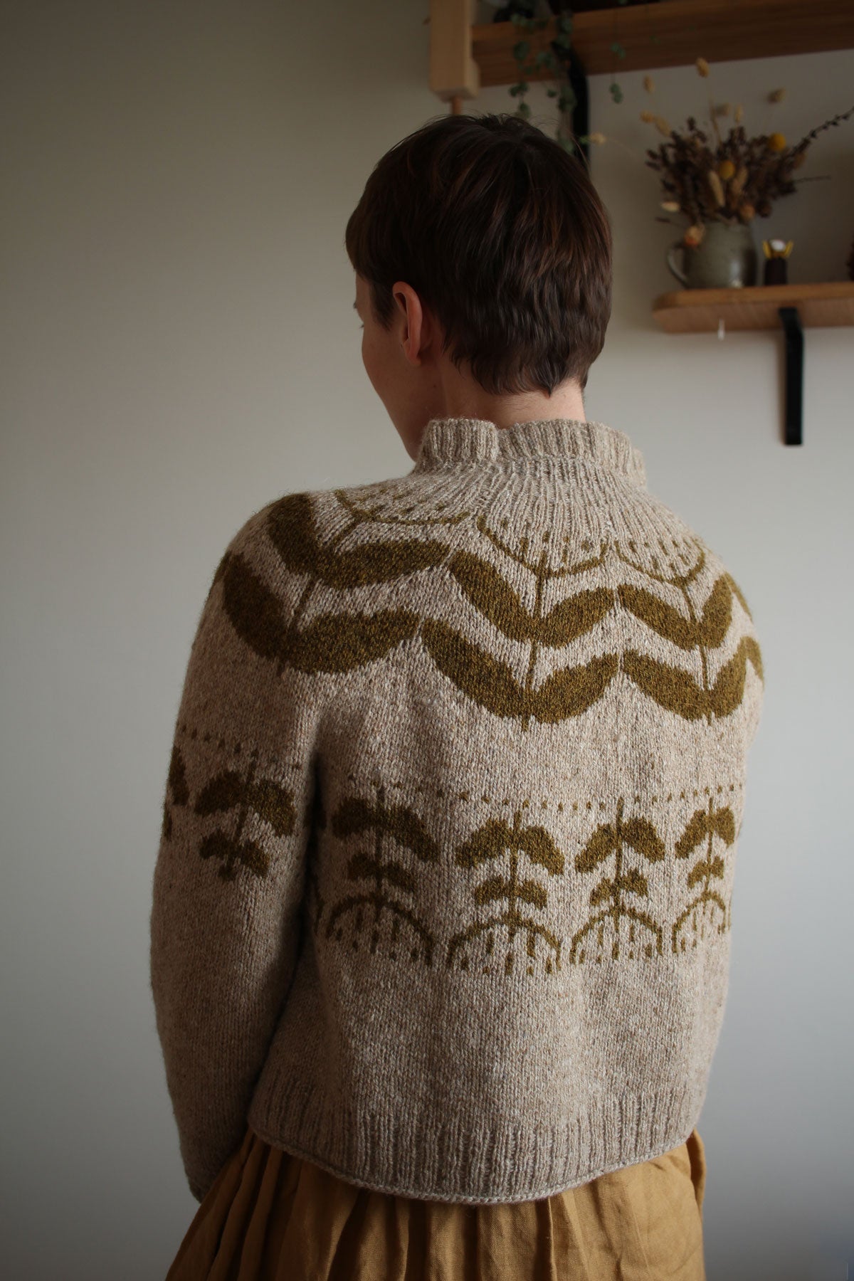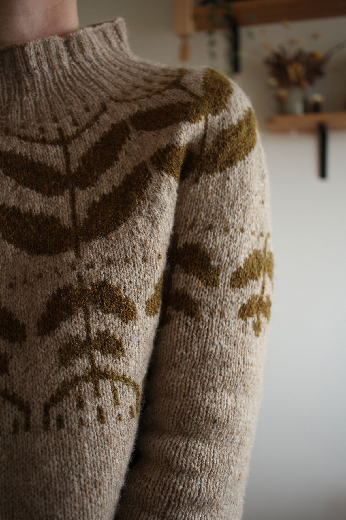 The pullover is knit top-down in the round with large botanical colourwork pattern on the yoke, body and sleeves.