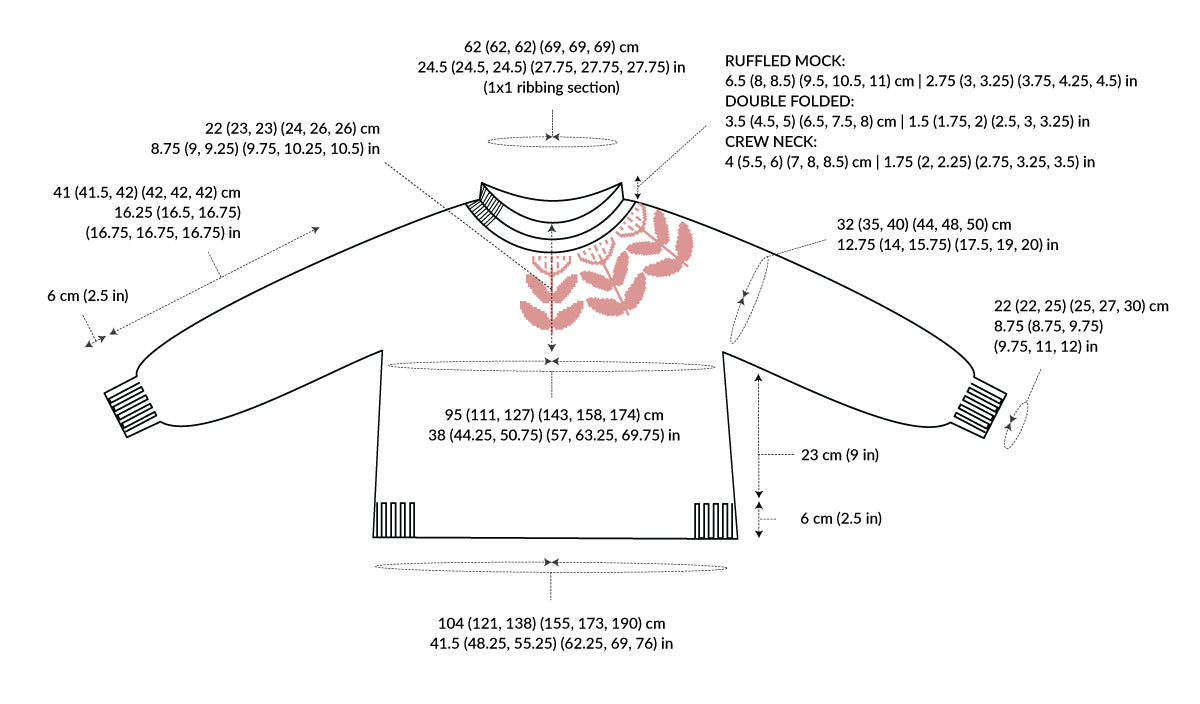 The pattern is written for six sizes 1 (2, 3) (4, 5, 6) with a finished bust circumference of ca. 95 (111, 127) (143, 158, 174) cm // 38 (44.25, 50.75) (57, 63.25, 69.75) in incl. at least 10-15 cm (4-6 in) of the recommended positive ease.