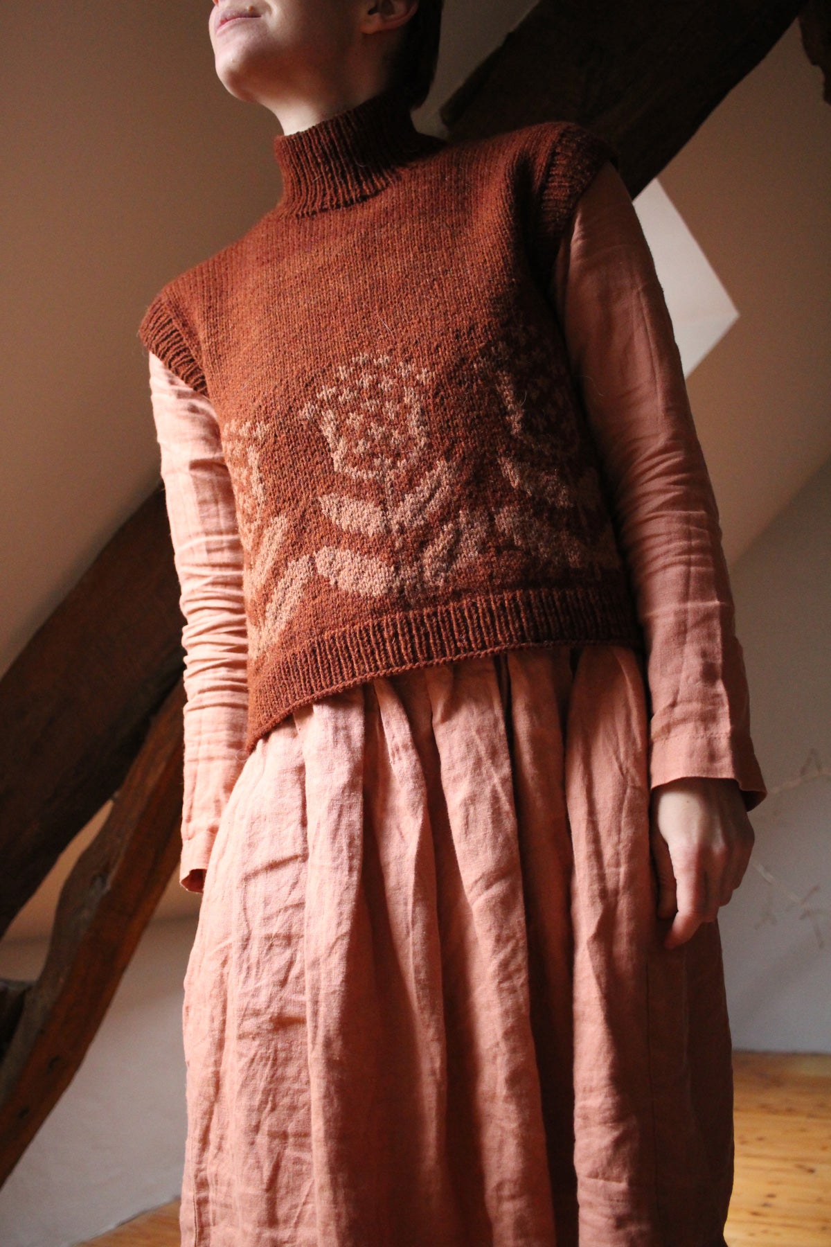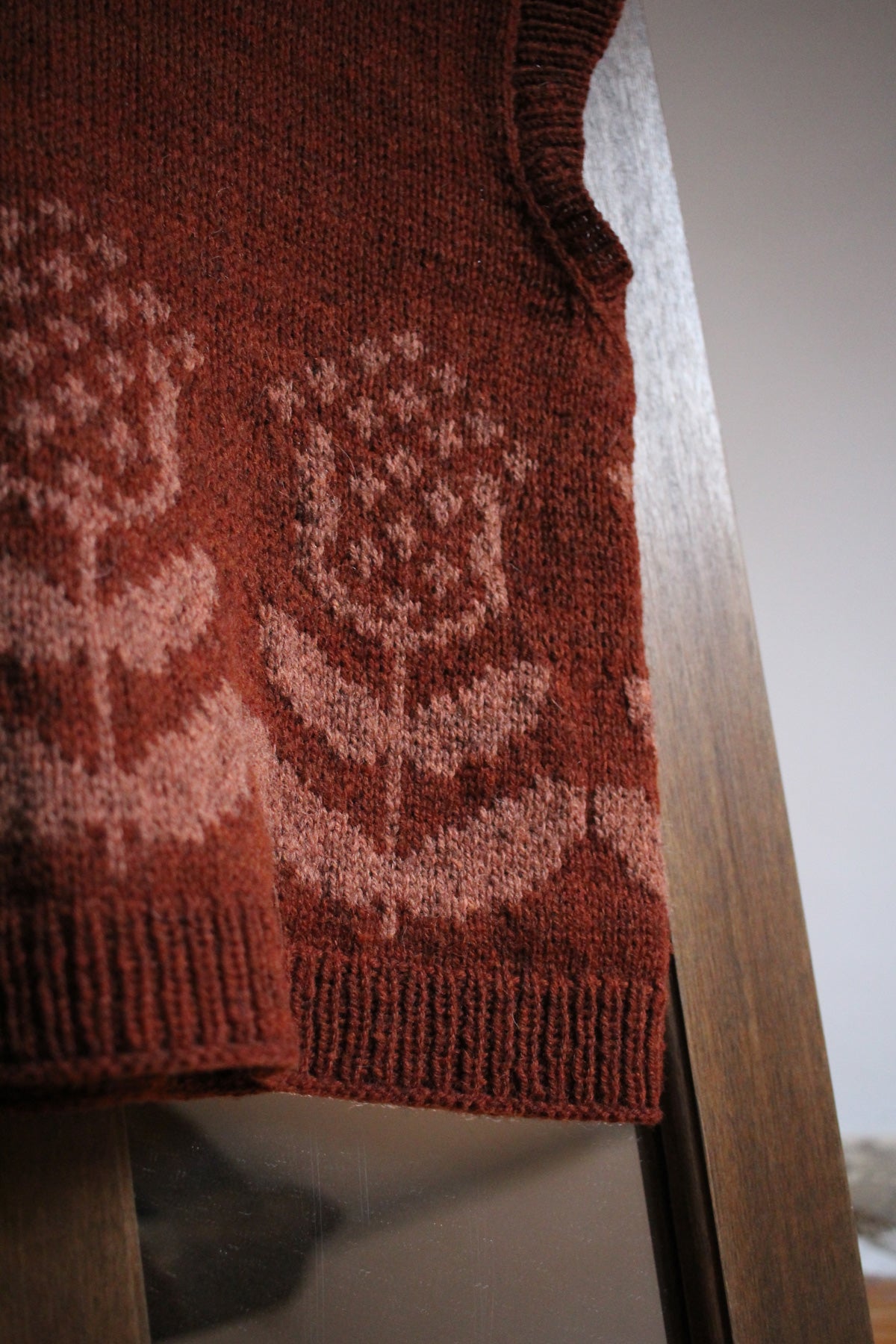 The vest is knit bottom up, partially in the round and flat. An alternative chart for those looking to avoid long floats is provided. The garment has an A-line shaping of the body and english tailored shoulders.