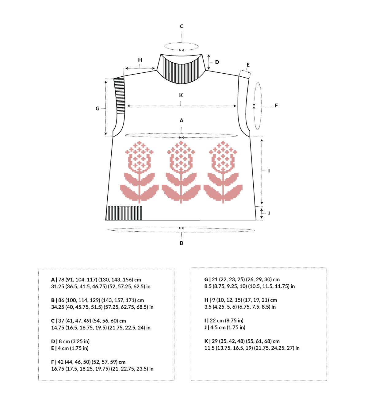 ∙ 20 sts & 24 rnds in 10 cm (4 in) on 4.5 mm (US 7) needles measured over st st and stranded colourwork worked in the round after blocking;