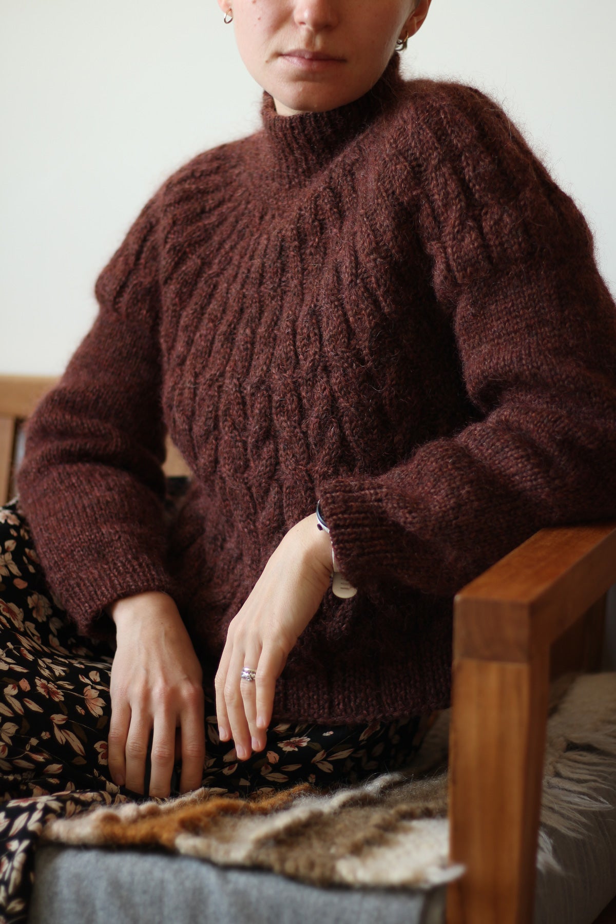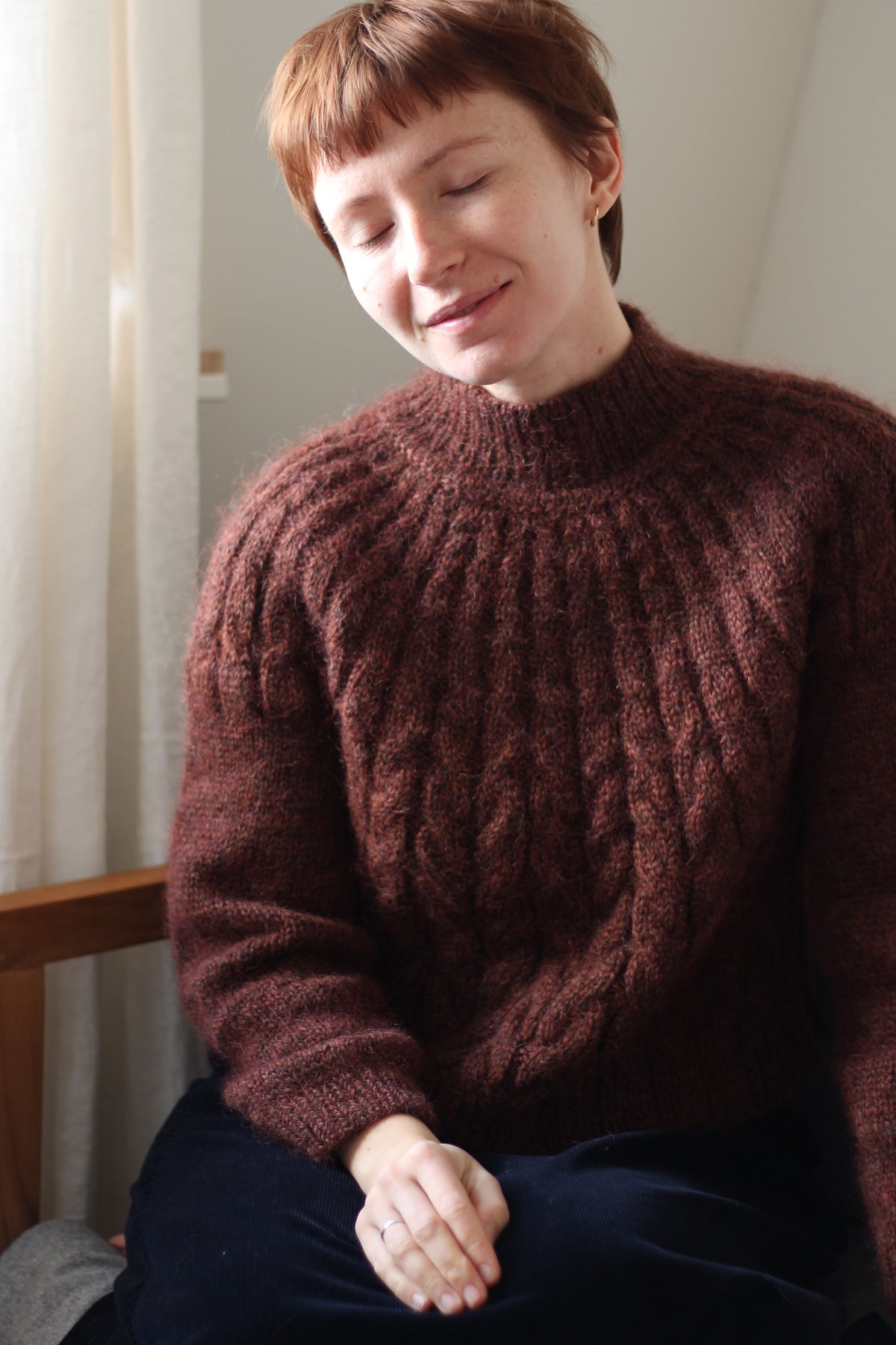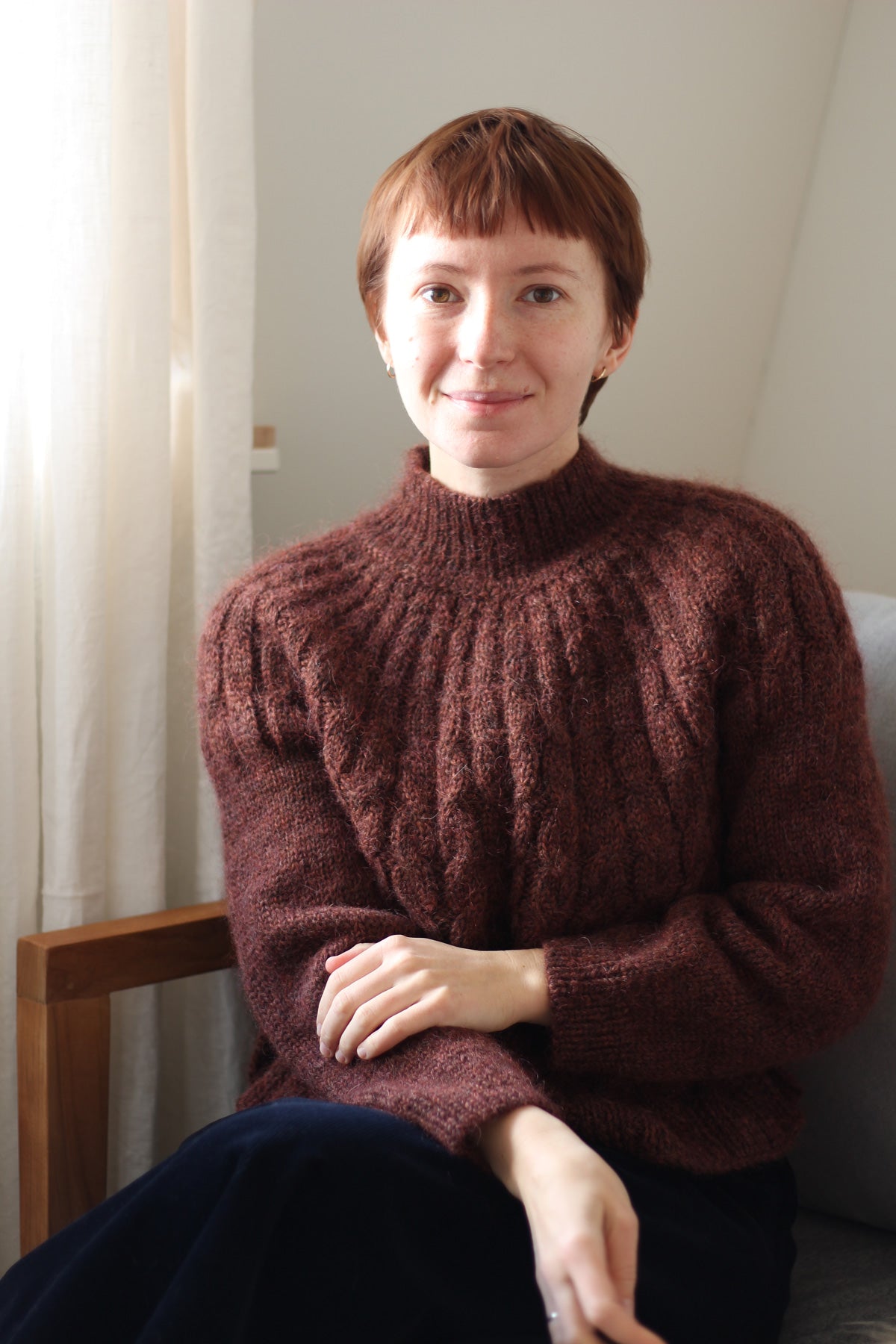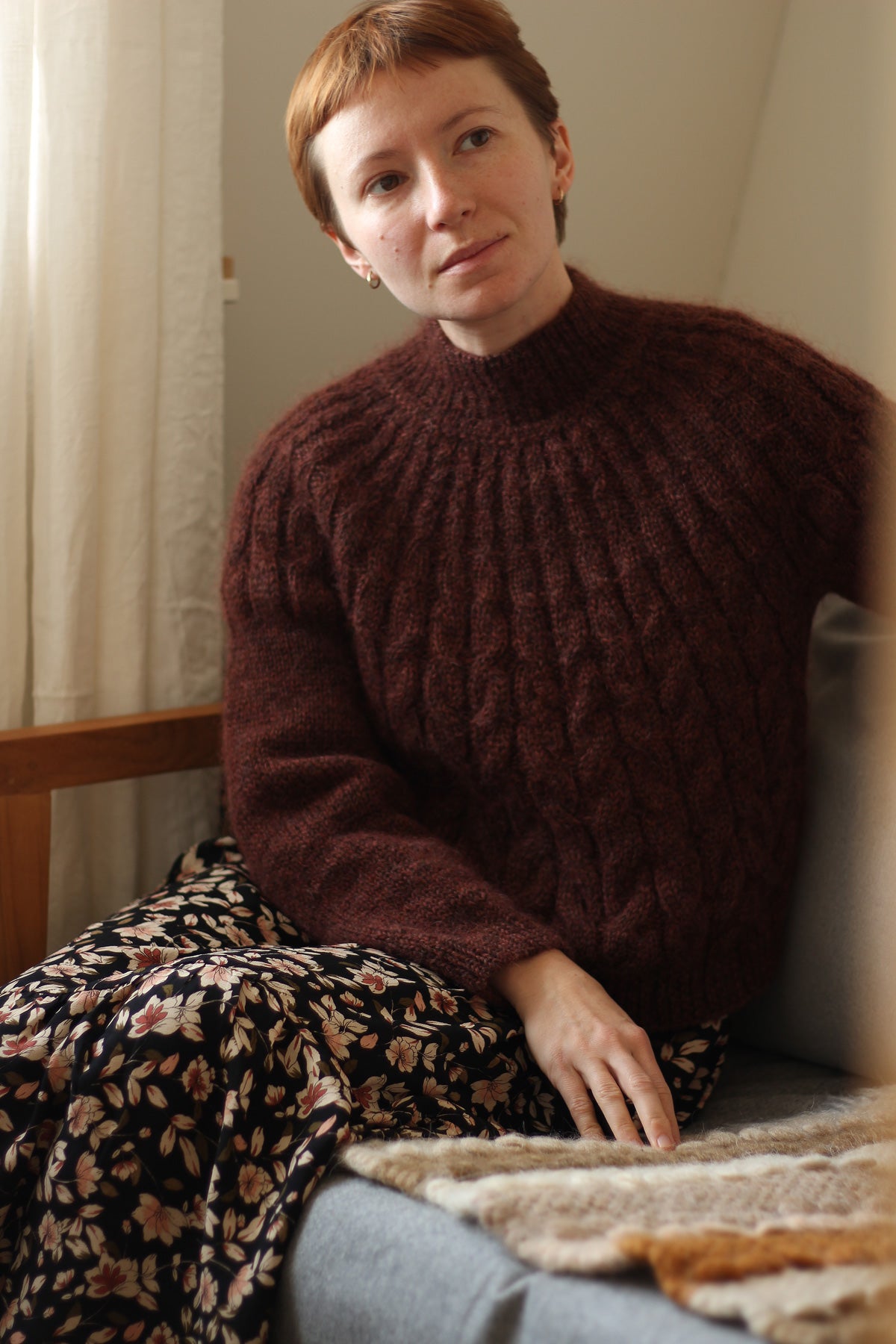 Purpurea is no regular cable sweater. With a beautifully accentuated mock (turtle) neck, a well fitting round yoke with a pattern of growing cables and a body with super practical side slits, it is a very modern yet potentially timeless garment.
