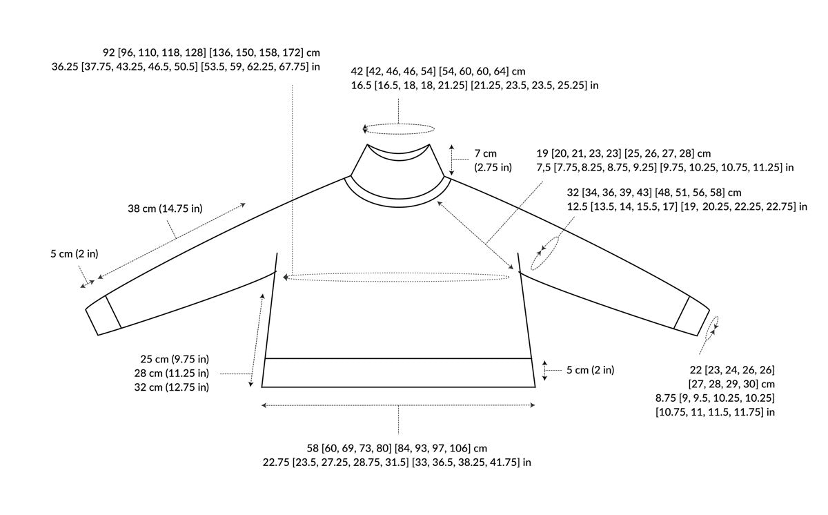 to fit 74 (84, 94, 104, 114) (124, 134, 144, 154) cm // 29 (33, 37, 41, 45) (49, 53, 57, 61) in bust circumference with ca. 10-18 cm (4-7 in) of positive ease and a finished bust circumference of ca. 92 (96, 110, 118, 128) (136, 150, 158, 172) cm // 36.25 (37.75, 43.25, 46.5, 50.5) (53.5, 59, 62.25, 67.75) in.