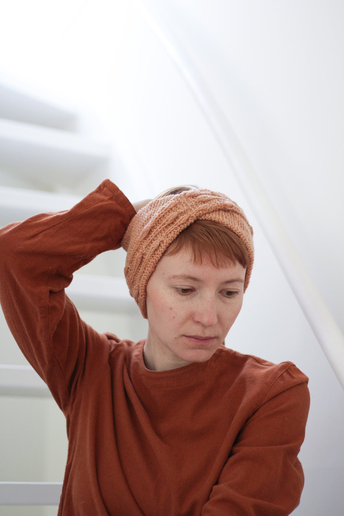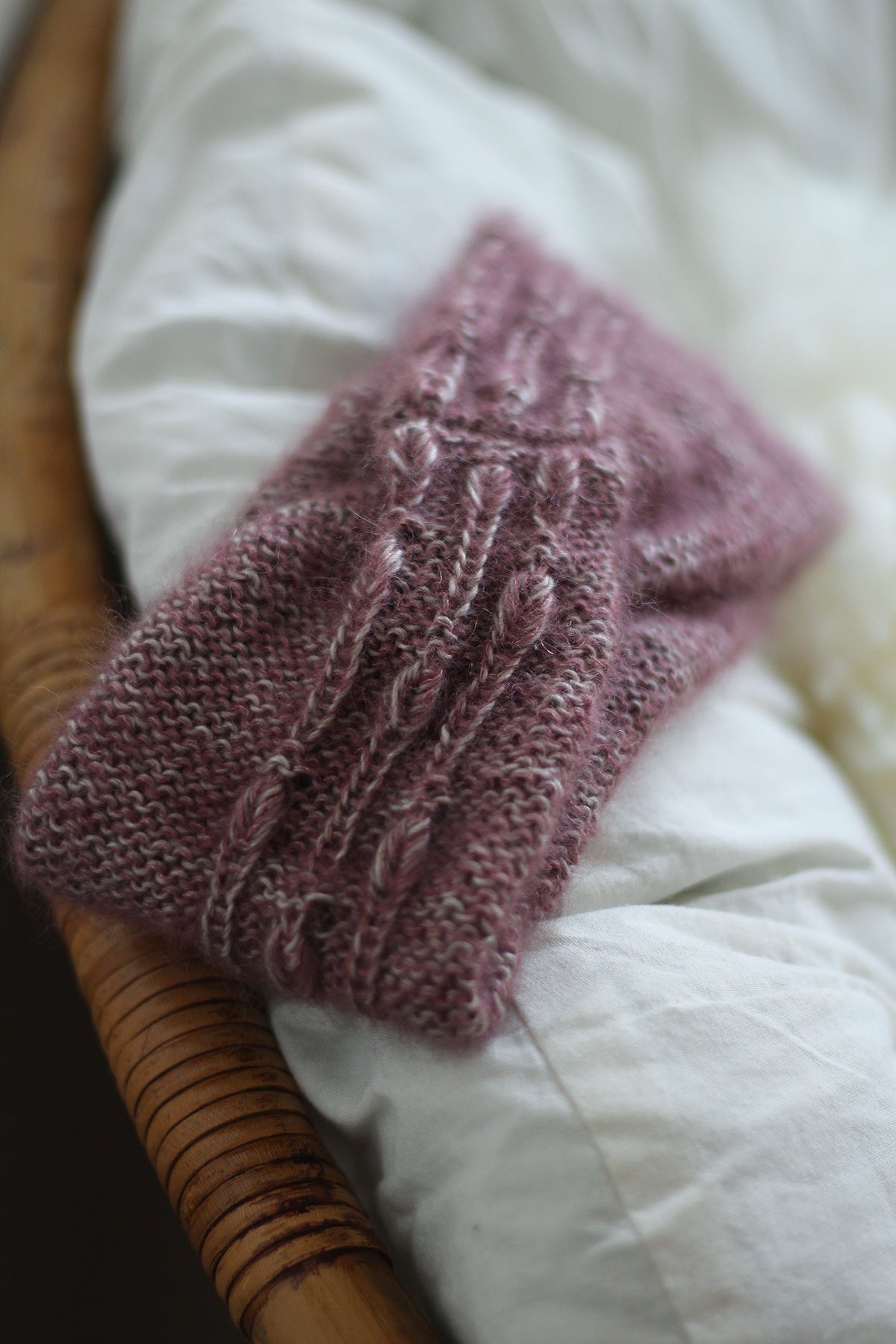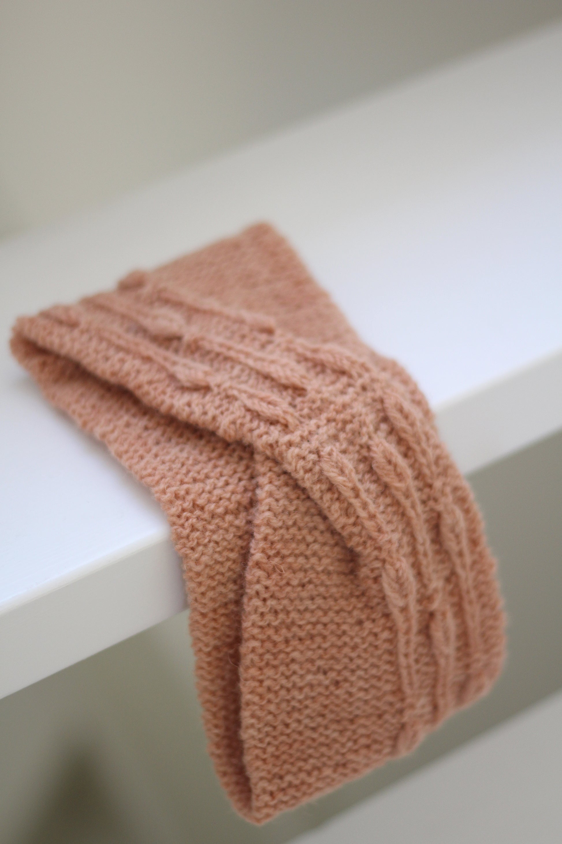 The headband is worked in a round on double pointed needles (DNPs) from the middle of the back in both directions and sewn in the middle of the twist in front.