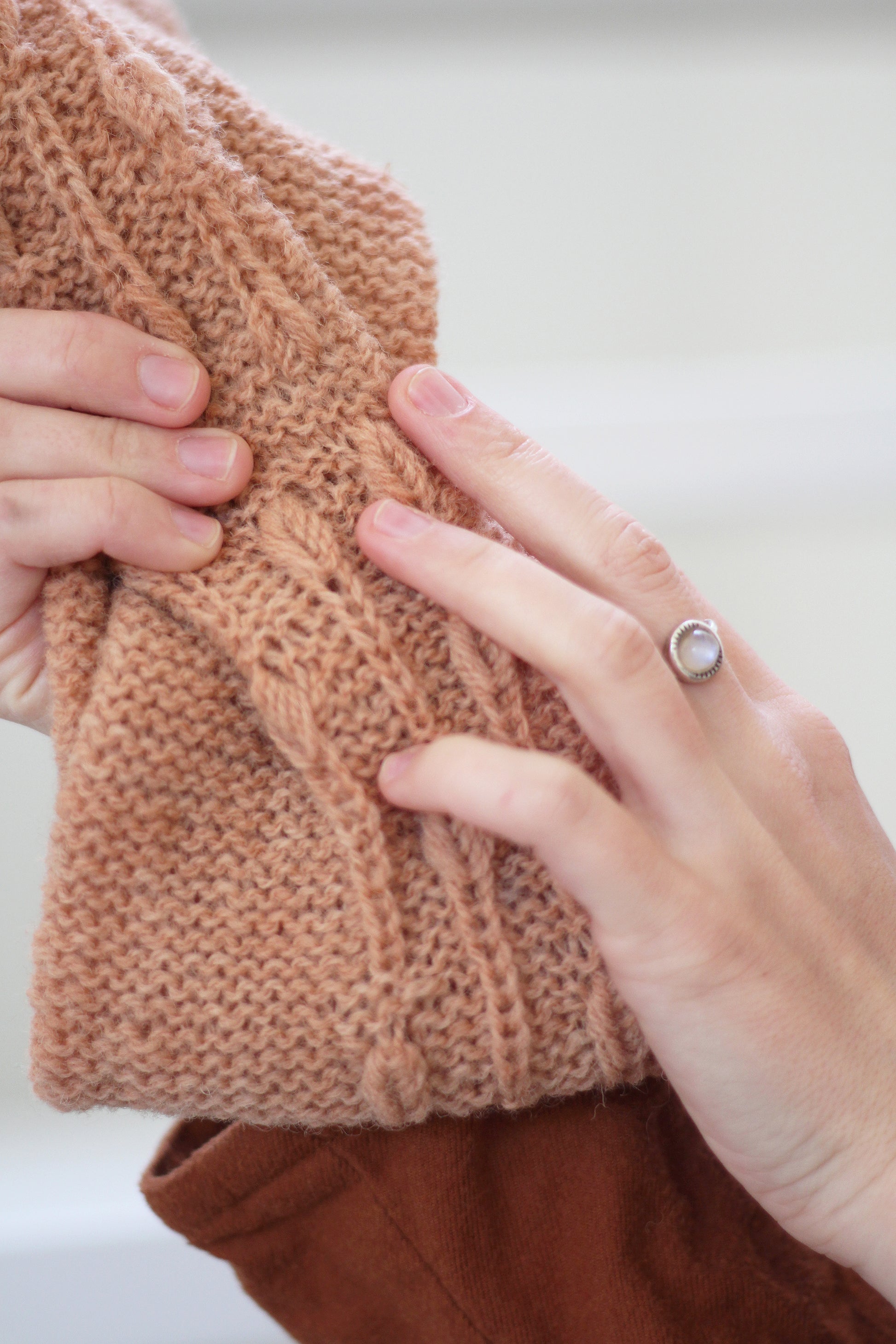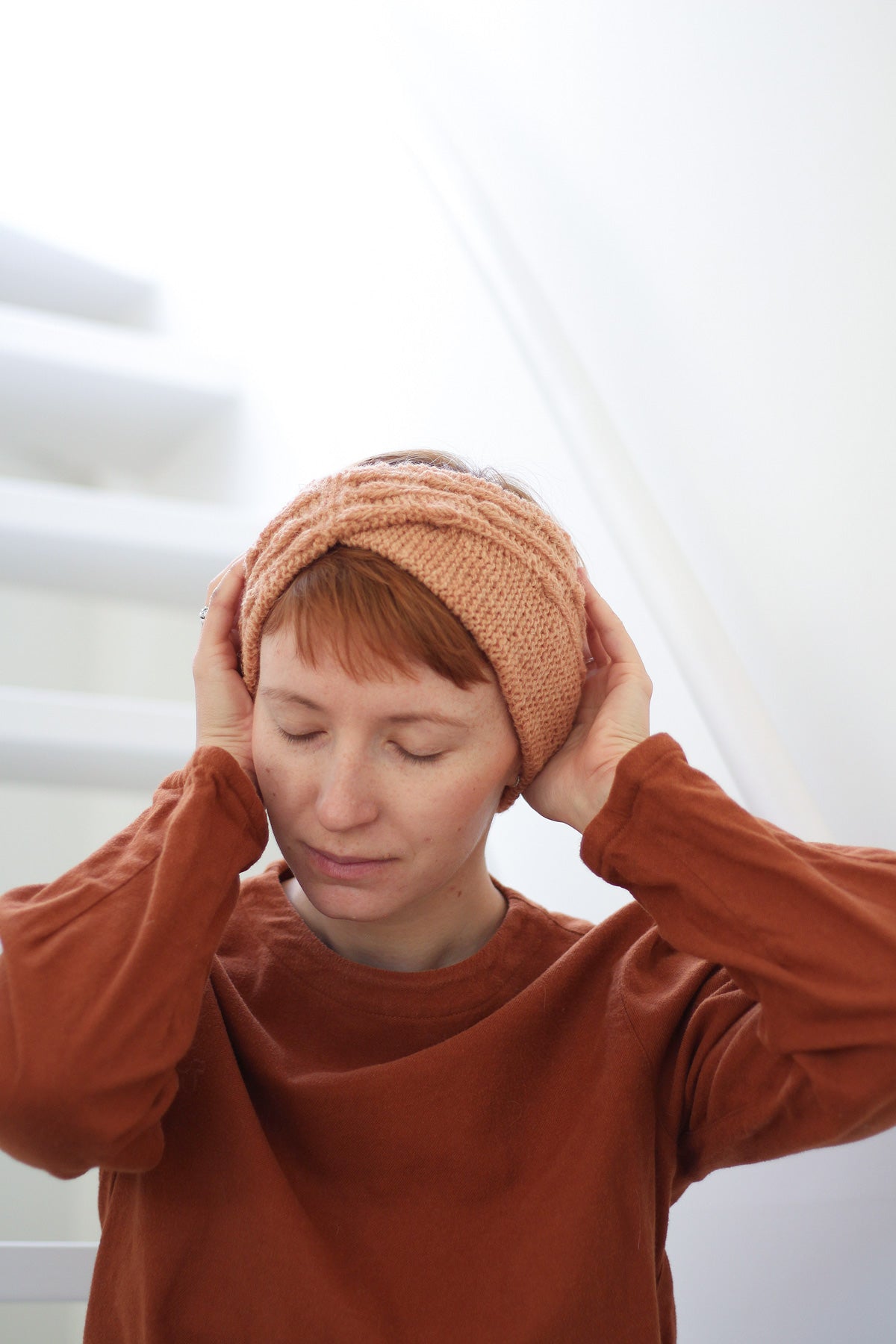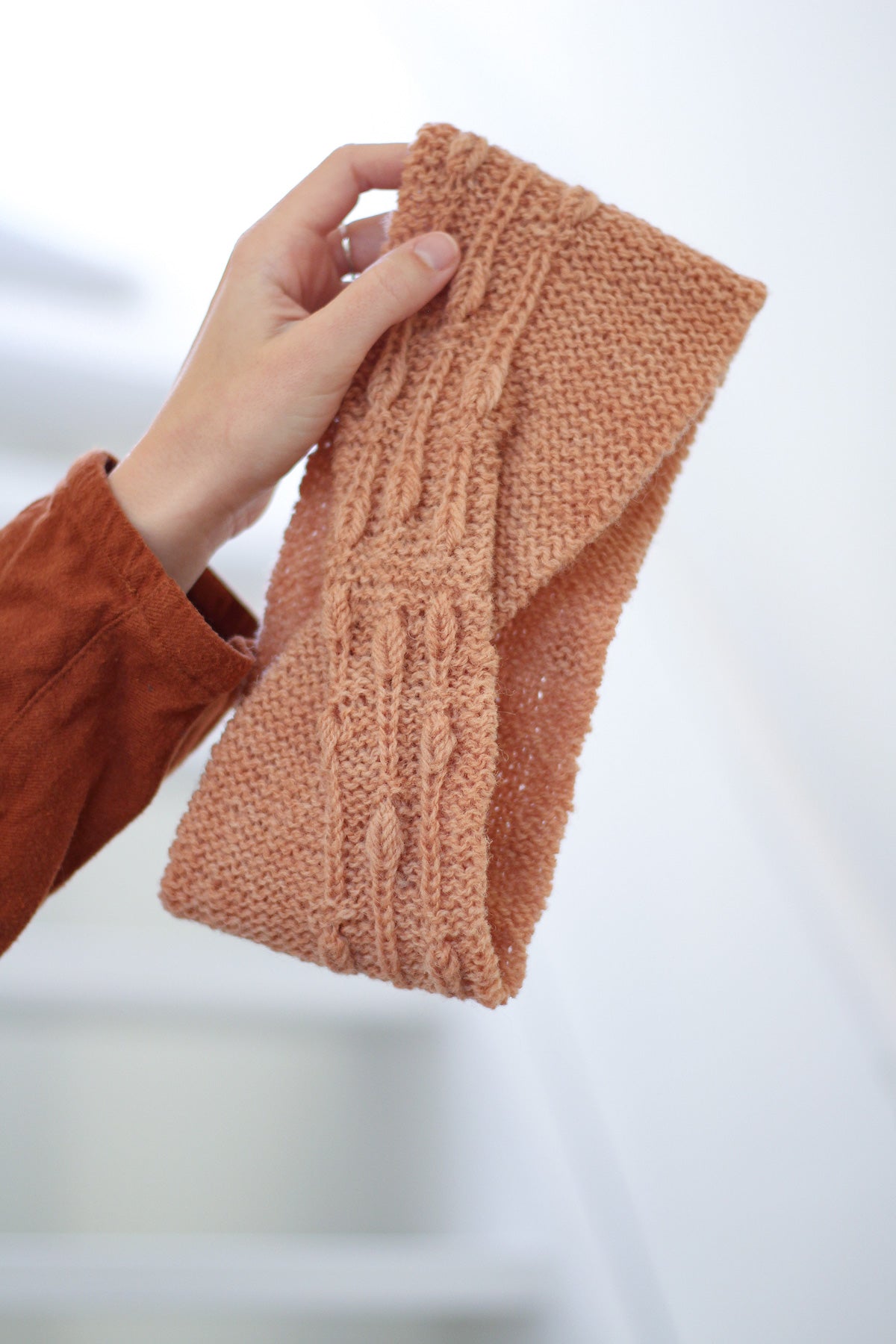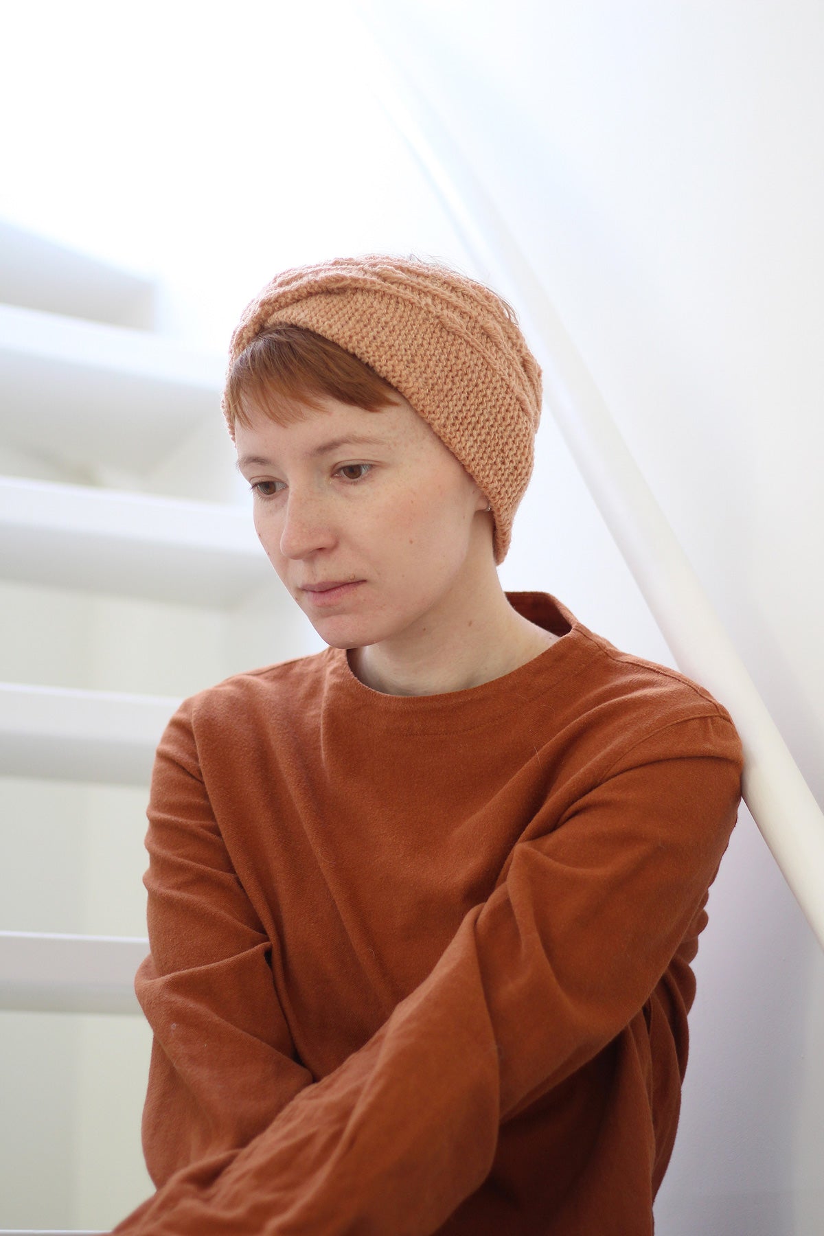 The headband is worked in a round on double pointed needles (DNPs) from the middle of the back in both directions and sewn in the middle of the twist in front.