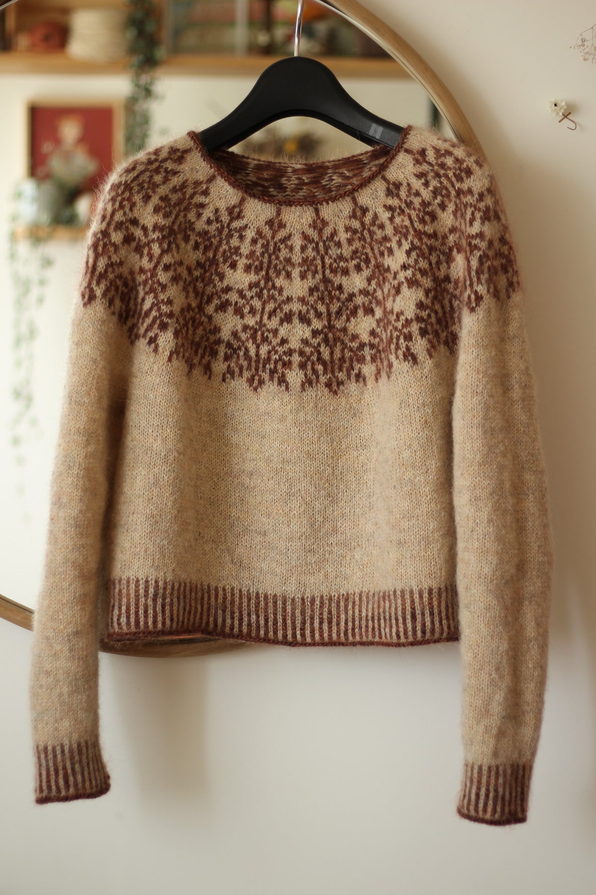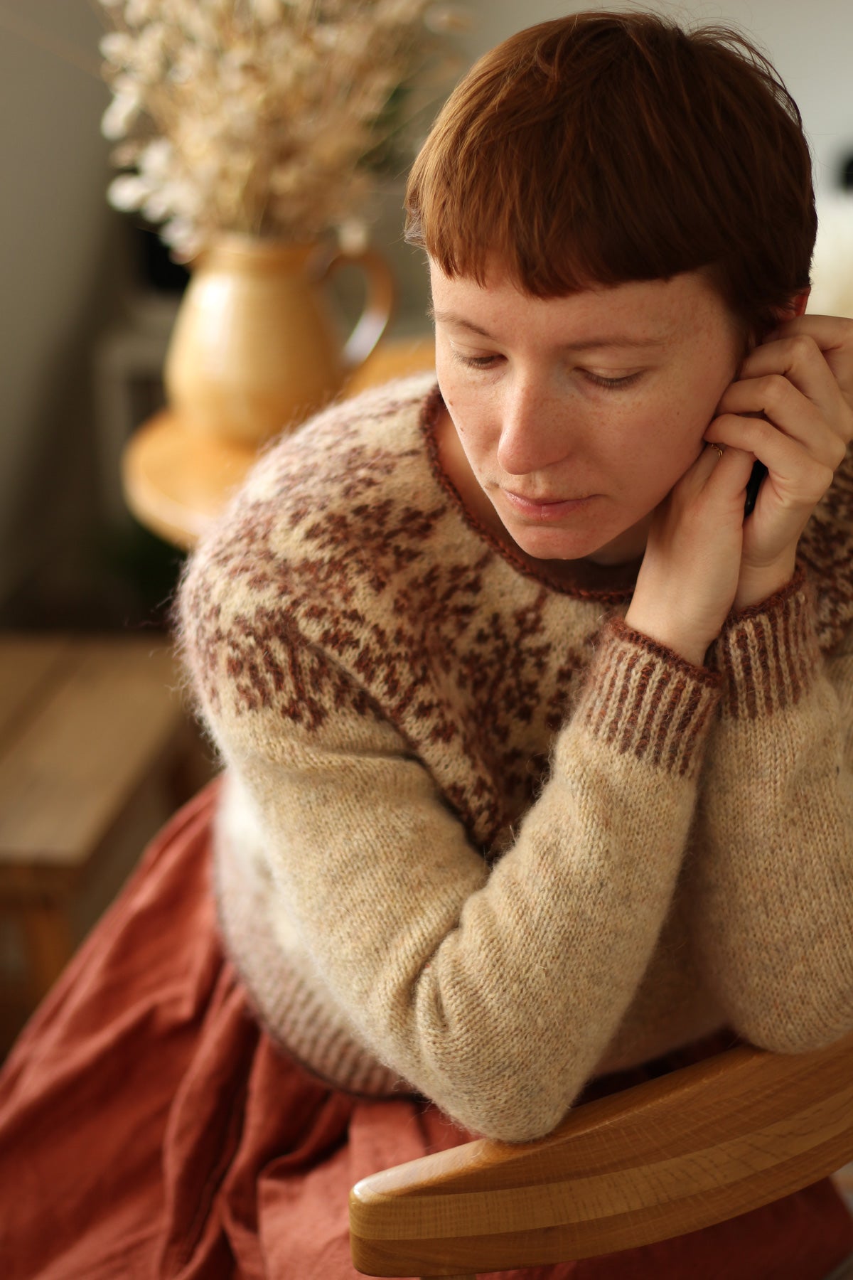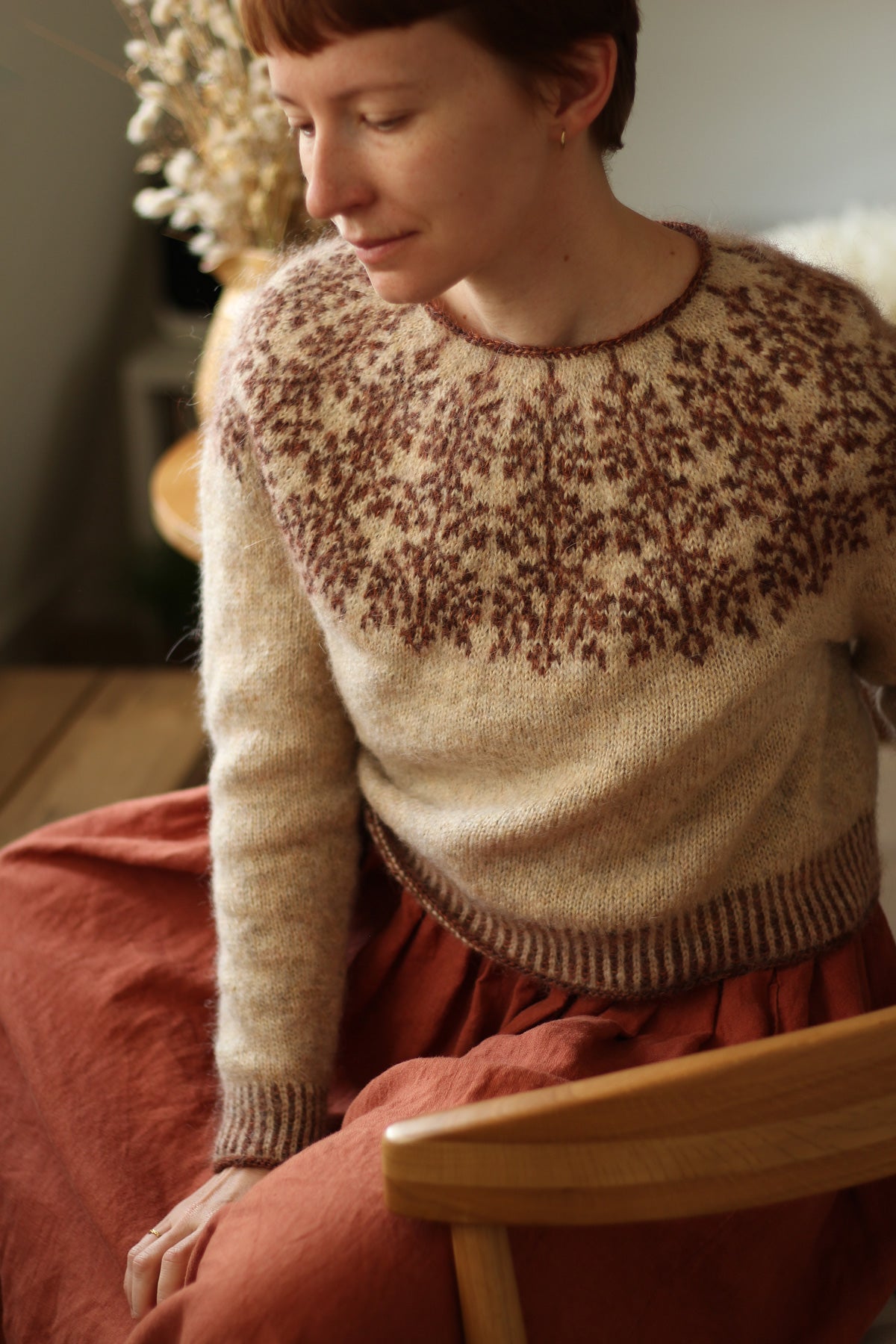 The pullover is knit top-down in the round with a delicate floral colourwork pattern running down the yoke (shoots) and corrugated ribbing accents on the hem and cuffs (roots).