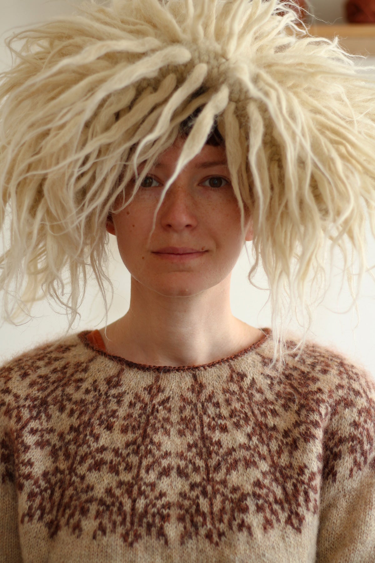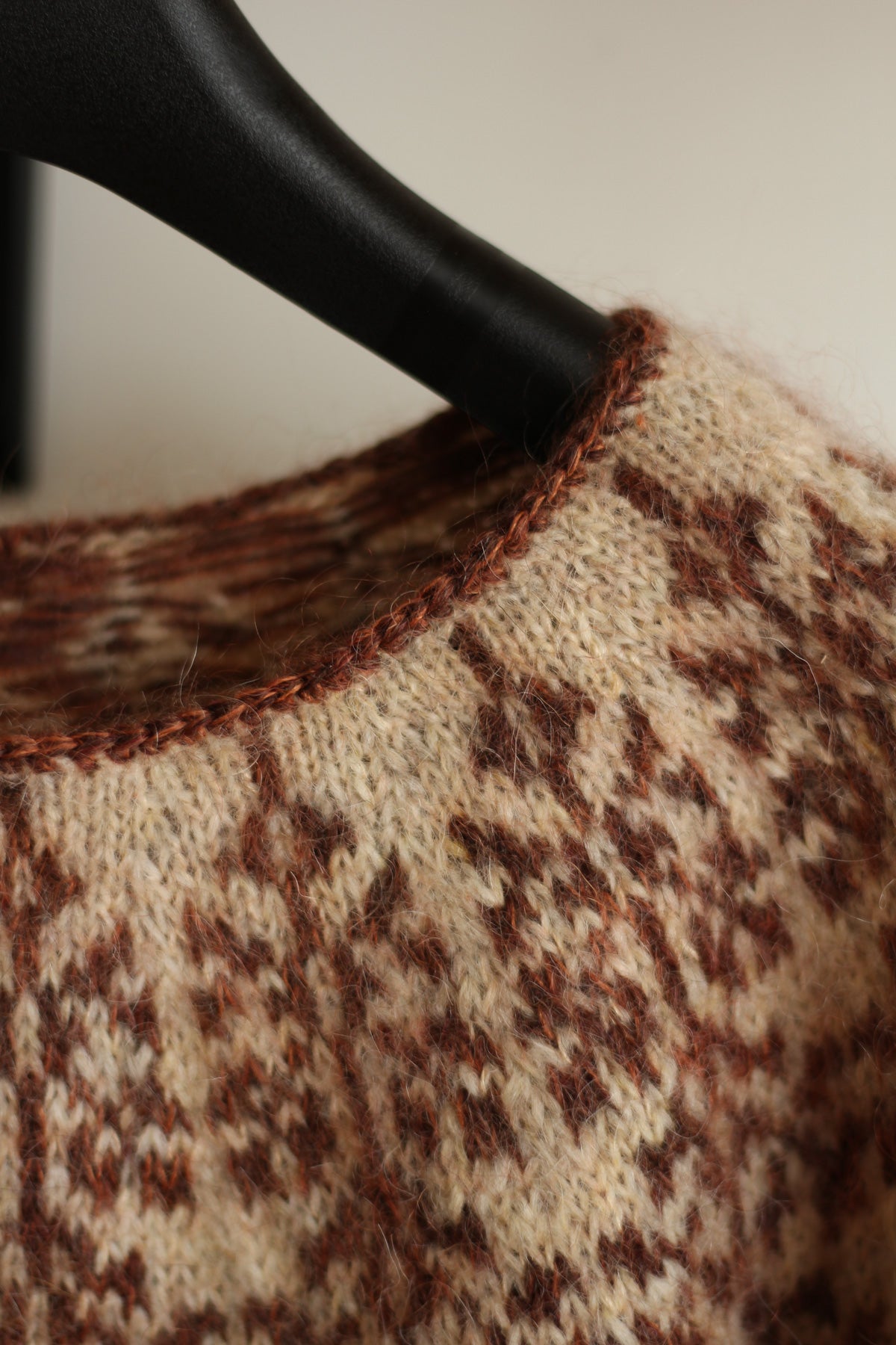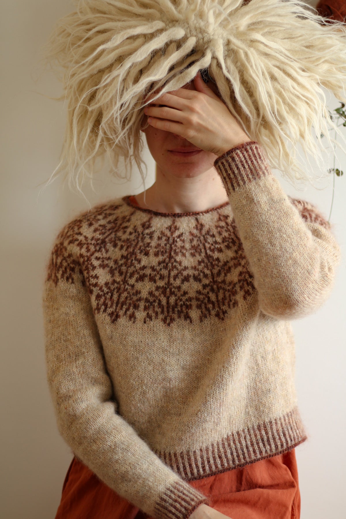 The pattern calls for one strand of Nutiden yarn held together with a strand of silk-mohair lace, yet any other yarn(s) with the matching gauge would work wonderfully. The colourwork pattern of the yoke is charted in three different length options depending on the size to avoid a “collar” effect in the larger sizes.