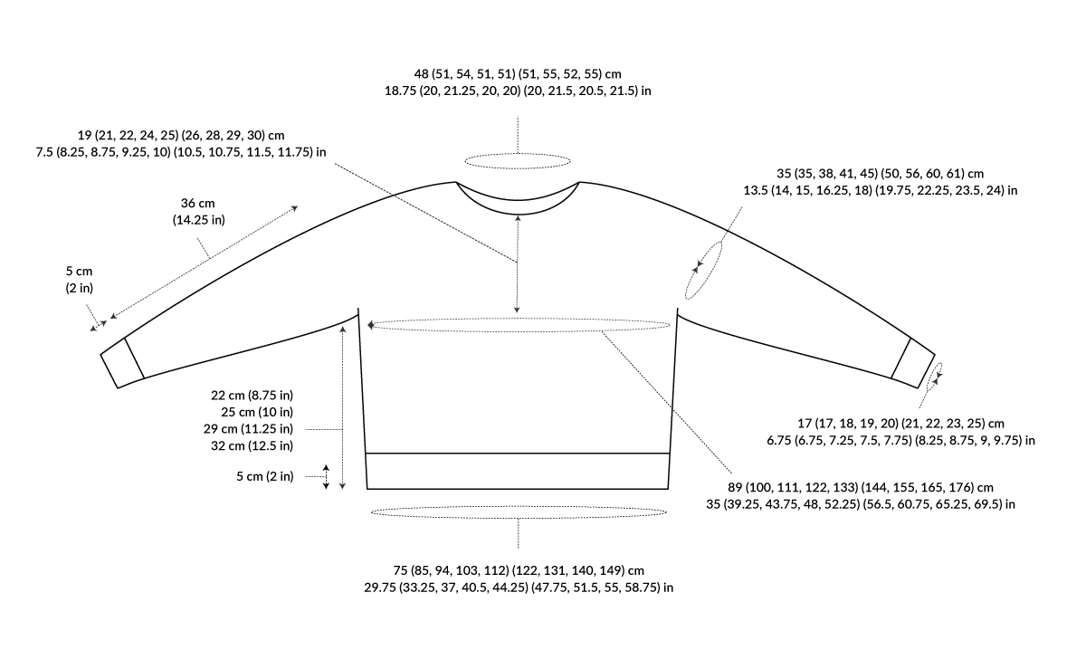 ∙ The pattern is written for nine sizes 1 (2, 3, 4, 5) (6, 7, 8, 9) with a finished bust circumference of ca. 89 (100, 111, 122, 133) (144, 155, 165, 176) // 35 (39.25, 43.75, 48, 52.25) (56.5, 60.75, 65.25, 69.5) in incl. 15-20 cm (6-8 in) of recommended positive ease.